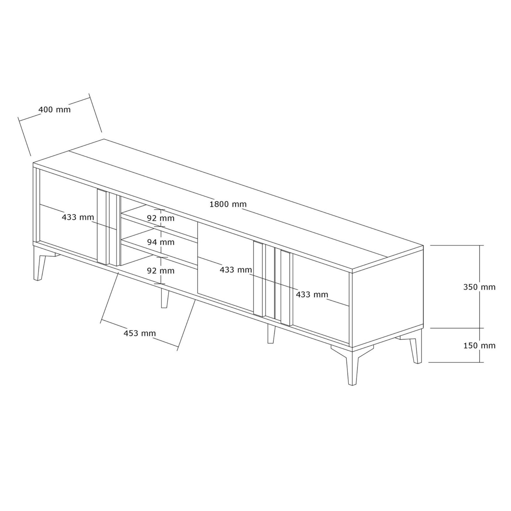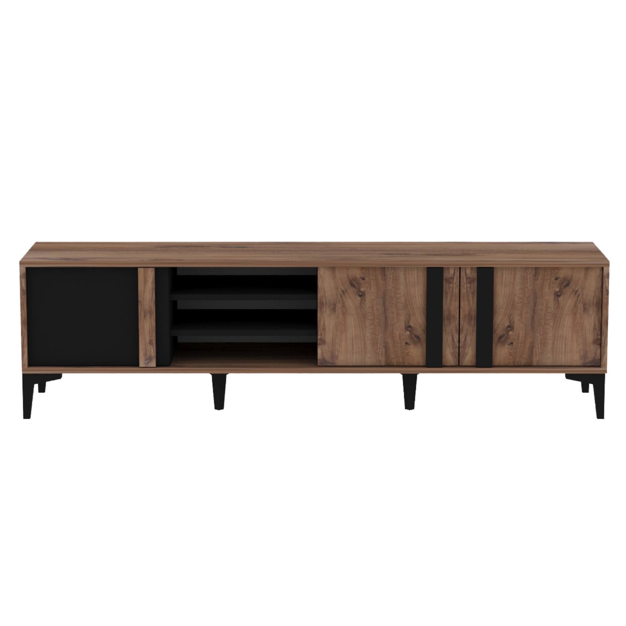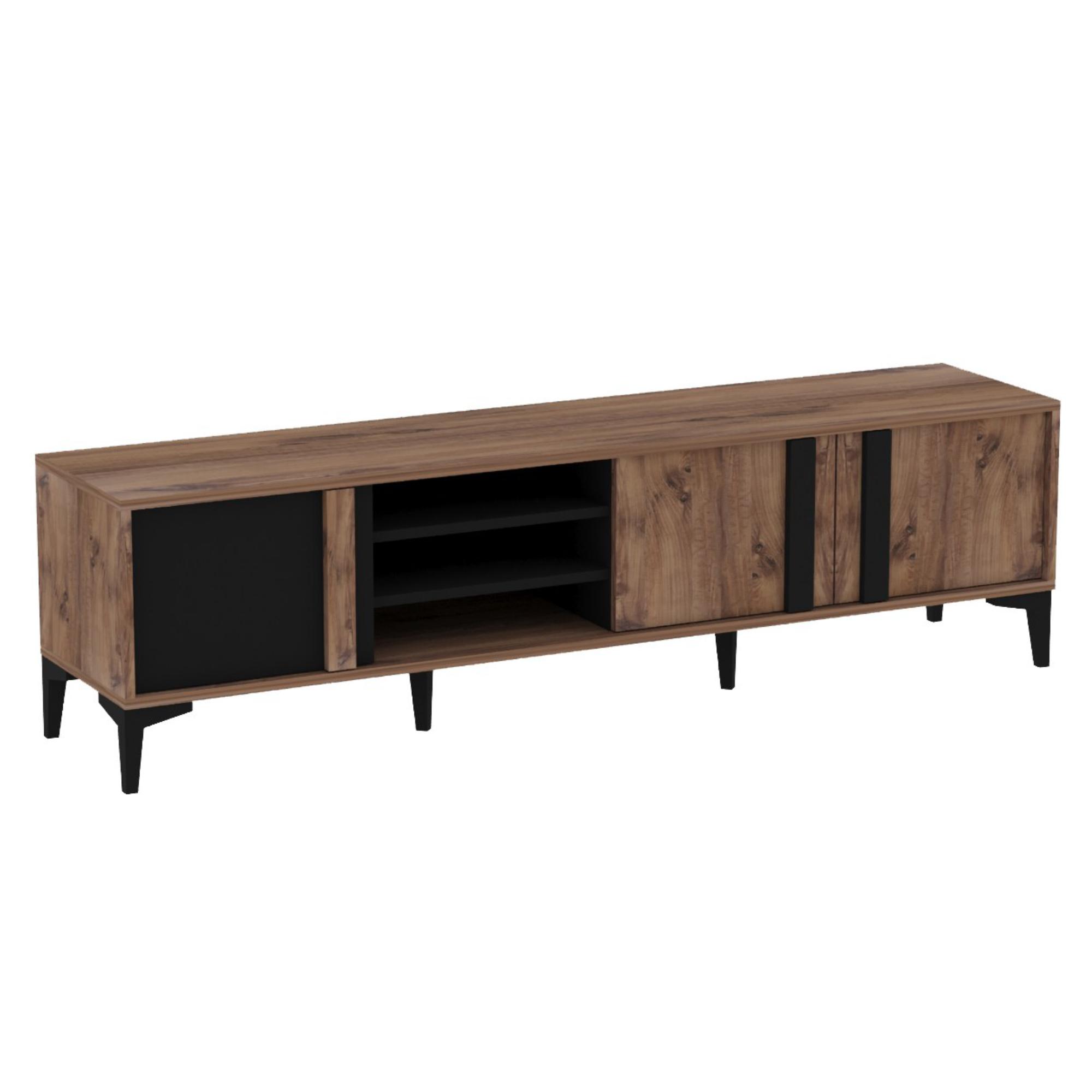 Je vybavena otevřeným úložným prostorem s 2 policemi. Ty jsou ideální pro umístění set top boxů, DVD přehrávačů a jiné elektroniky. Dále disponuje 3 otočnými dvířky, za kterými naleznete další úložný prostor. Ten poskytuje dostatek místa pro odložení všeho, co potřebujete mít po ruce. Dvířka jsou doplněna praktickými úchyty. Vrchní deska o šířce 180 cm nabízí prostor pro televizi i dekorace.