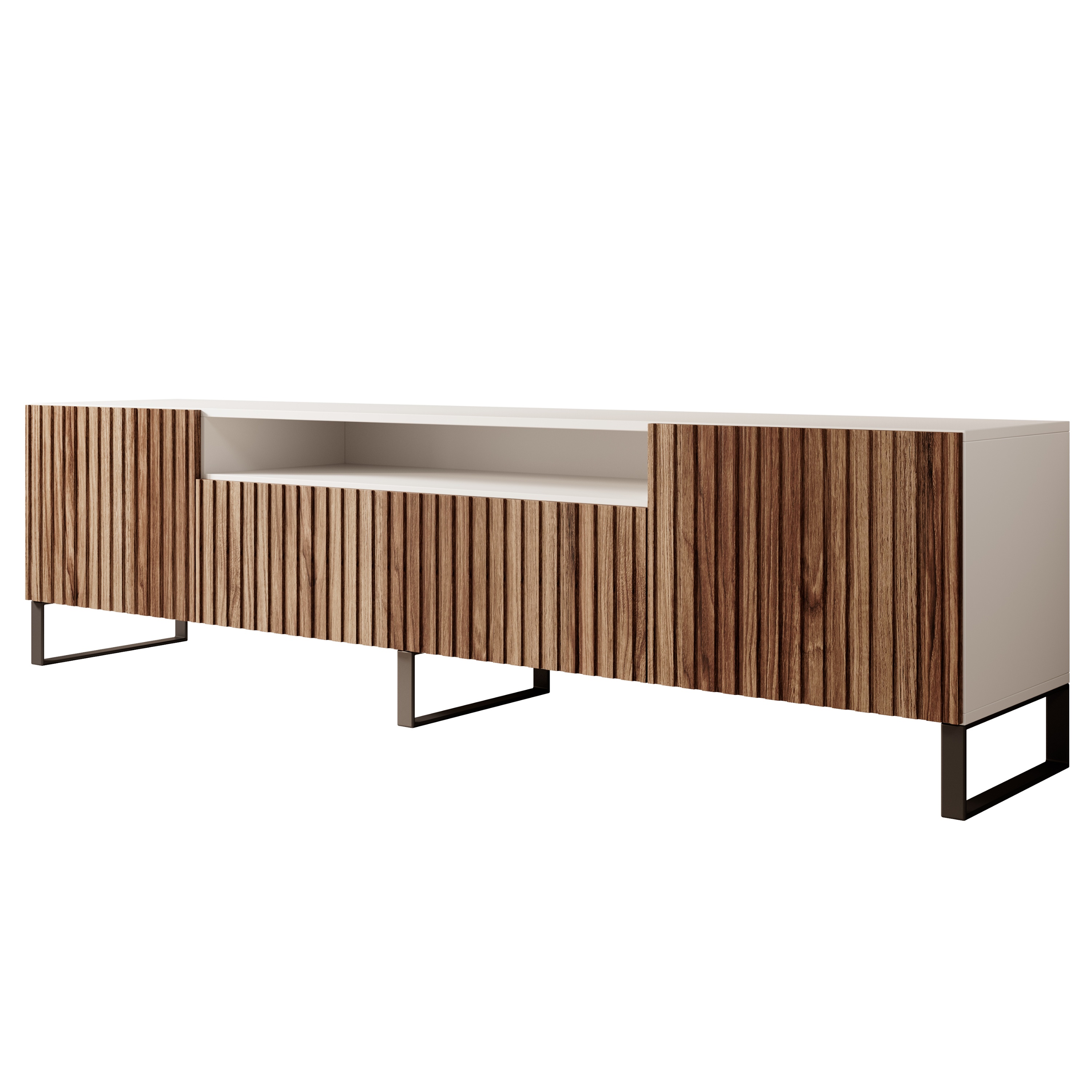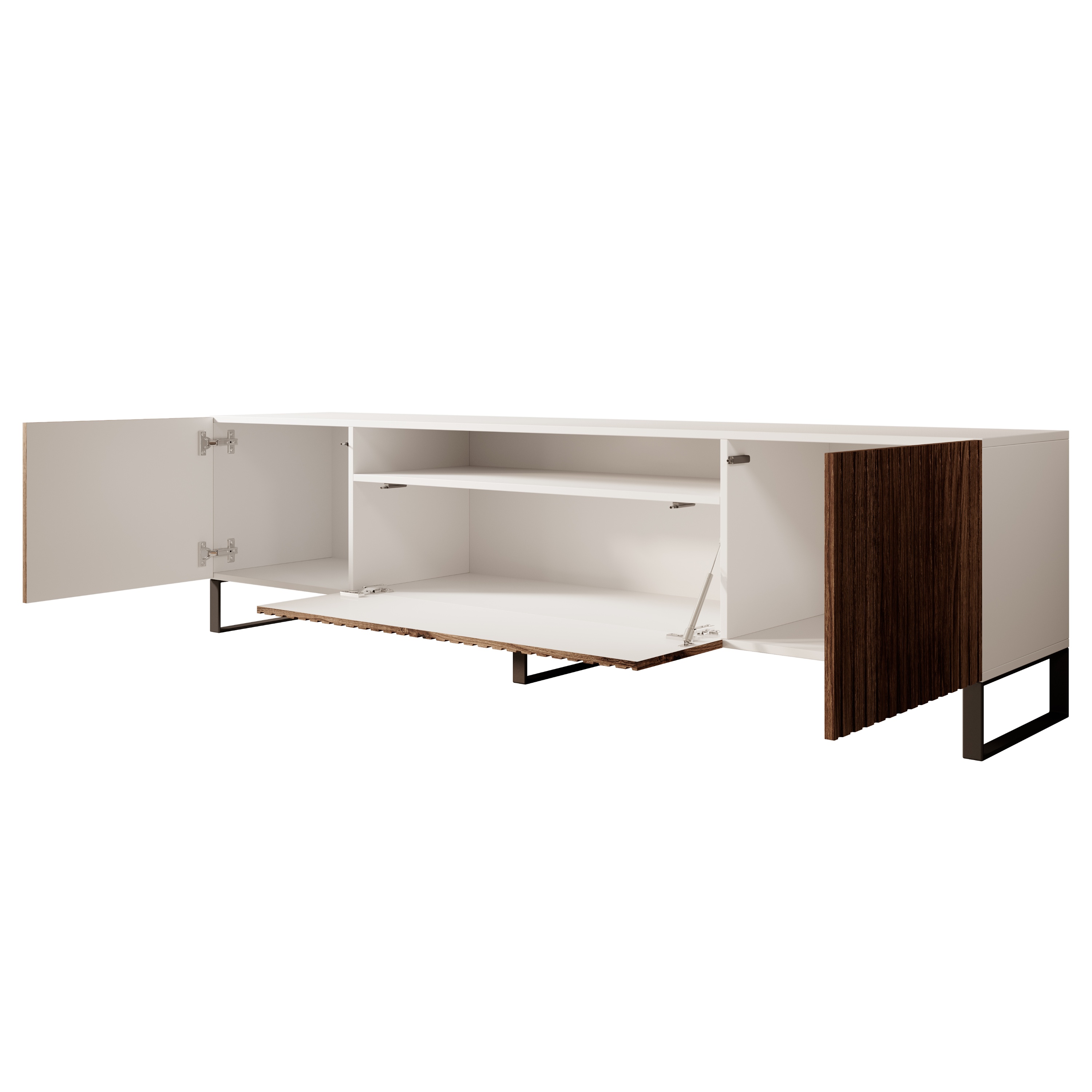 Komoda je vyrobená z laminované dřevotřískové desky v kombinaci s kvalitním MDF a stojí na pevné kovové konstrukci. Za dvířky naleznete praktický úložný prostor, pro jejich otevření na ně stačí lehce zatlačit. Prostřední část obsahuje otevřený prostor, kam uložíte TV příslušenství.
