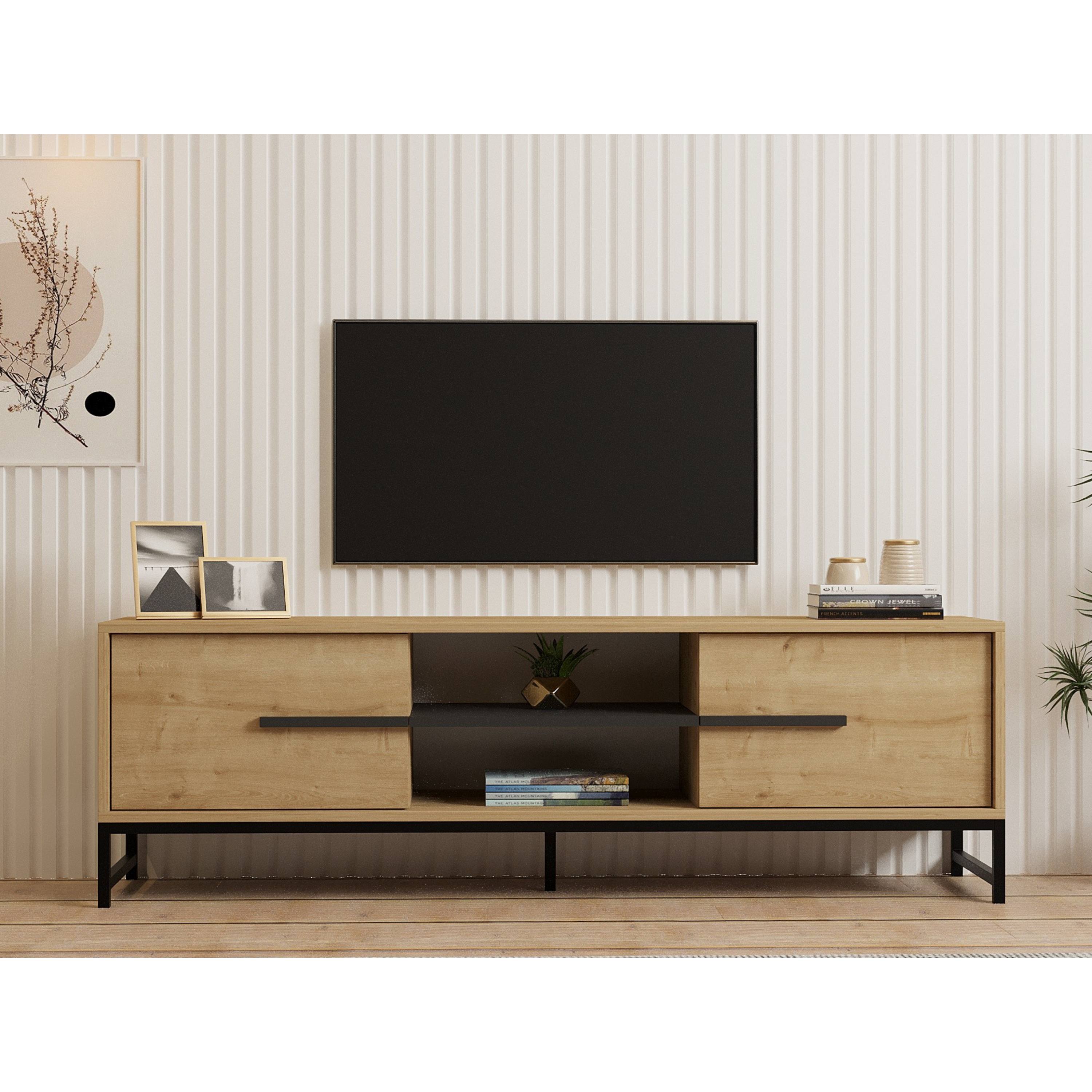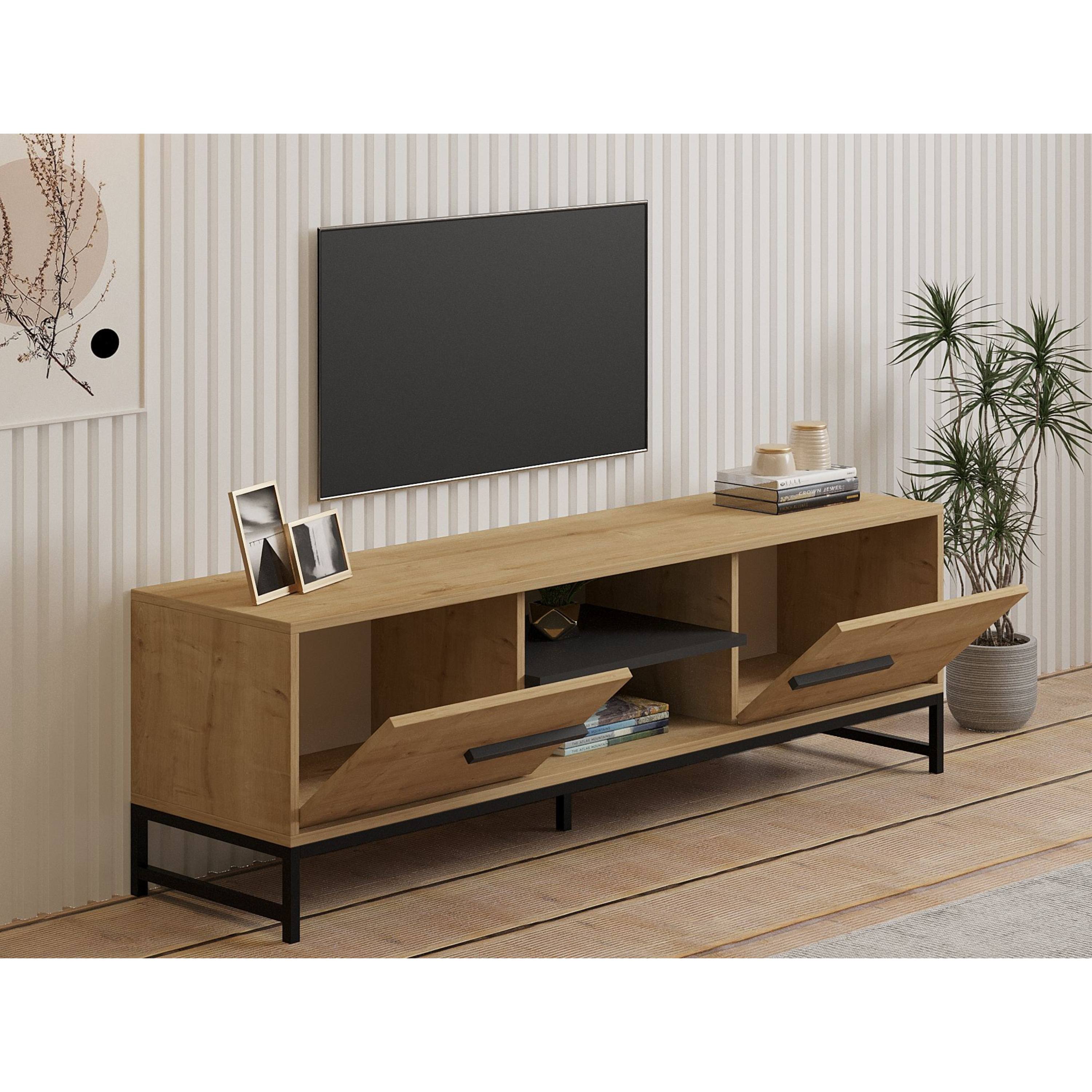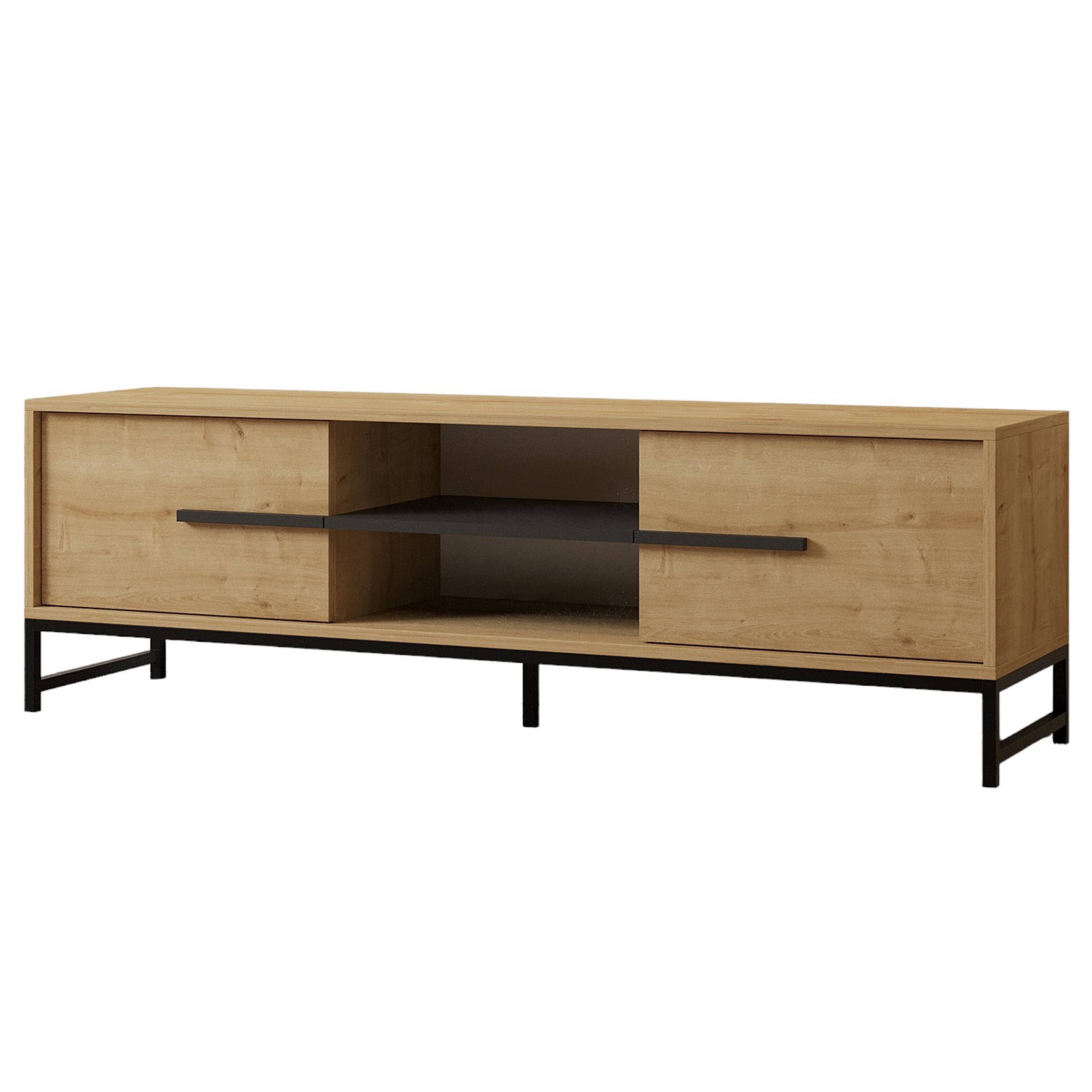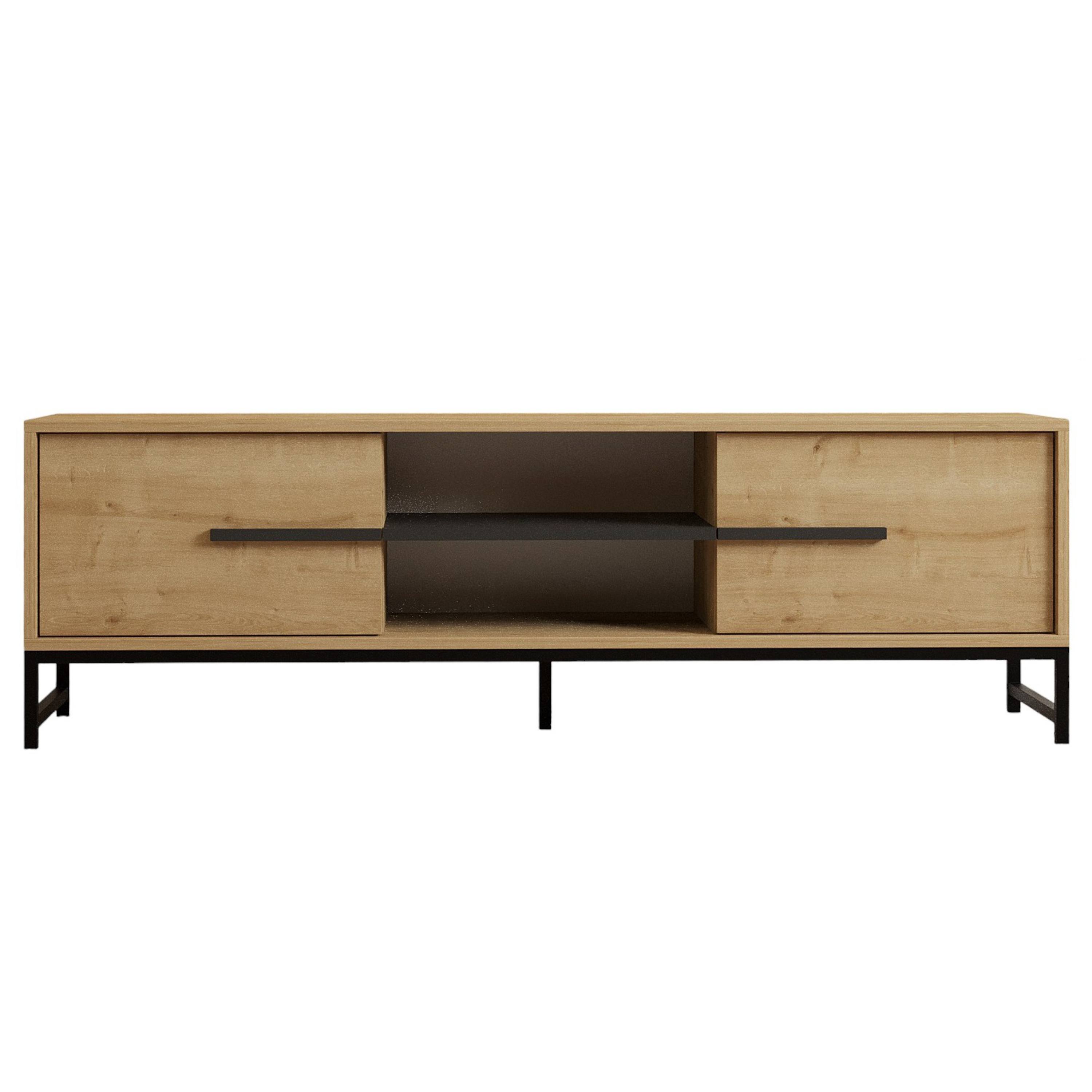 Za výklopnými dvířky komody se nachází dostatek úložného prostoru. Otevřená přihrádka pojme nejen TV příslušenství, ale i další drobnosti, které budete chtít mít neustále po ruce. Stabilitu komody zajišťují pevné kovové nohy.