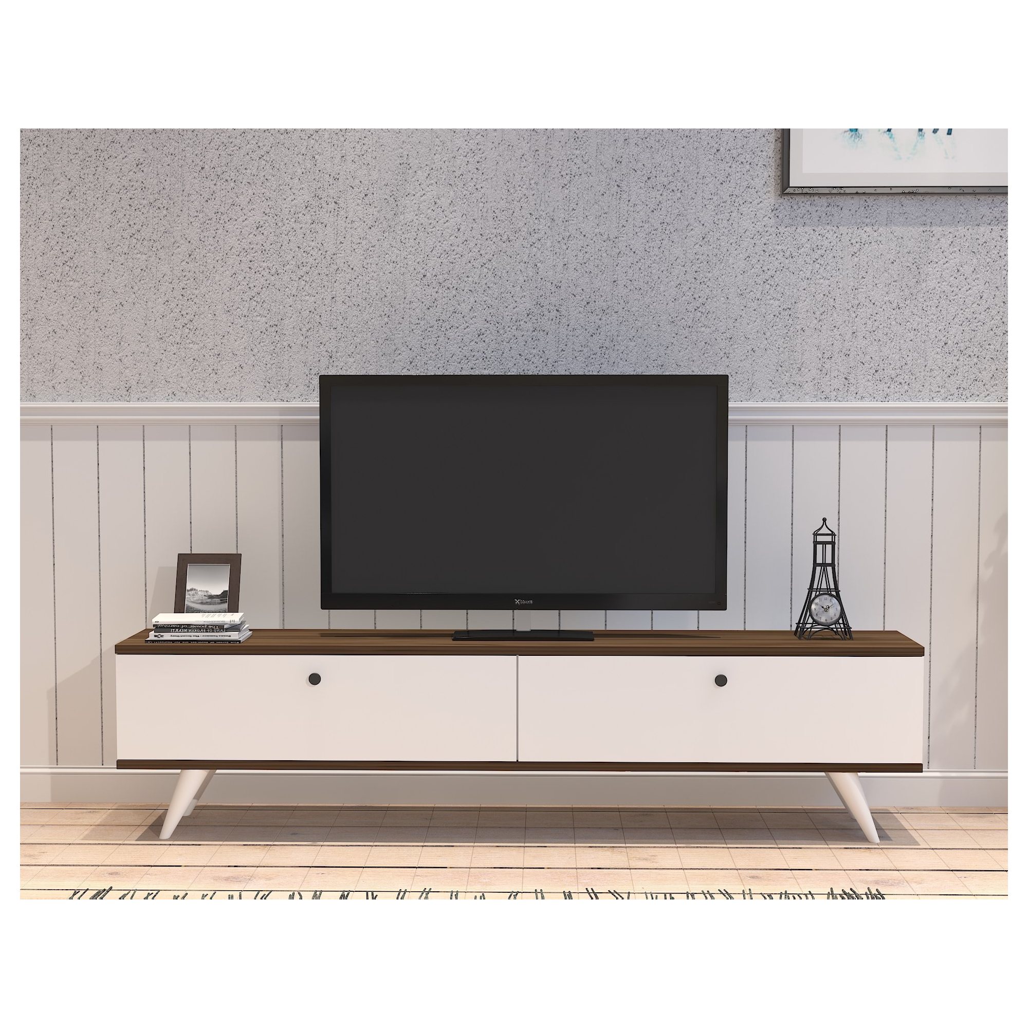 Disponuje 2 výklopnými dvířky, která odkrývají 2 oddělené úložné prostory. Ty vytvářejí dostatek místa pro odložení všeho, co potřebujete mít po ruce. Vrchní deska o šířce 160 cm nabízí prostor pro televizi, elektroniku, ovladače i dekorace. Dvířka jsou doplněna jemnými úchytkami pro pohodlnou manipulaci. Stylovou tečkou jsou 4 kónické nohy.