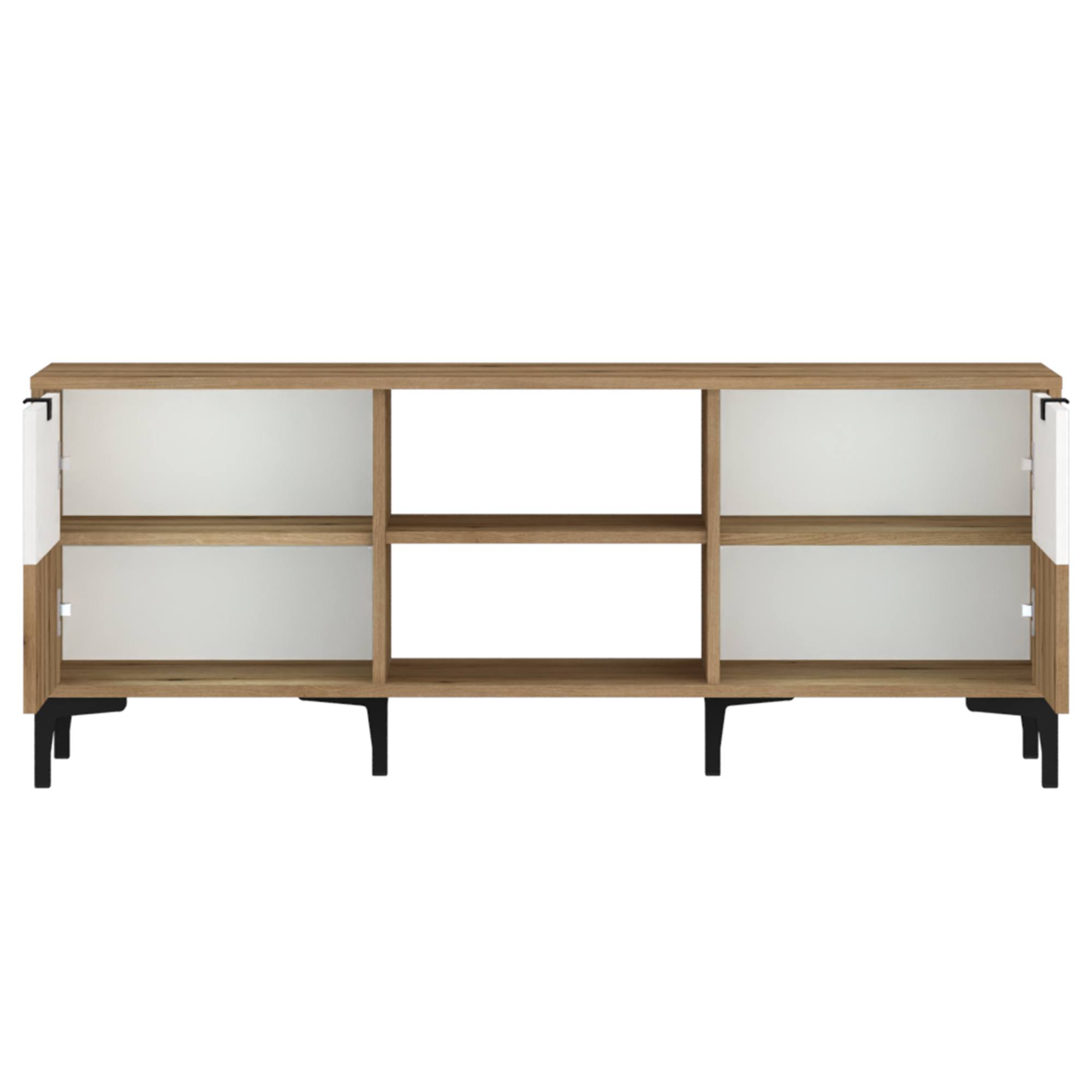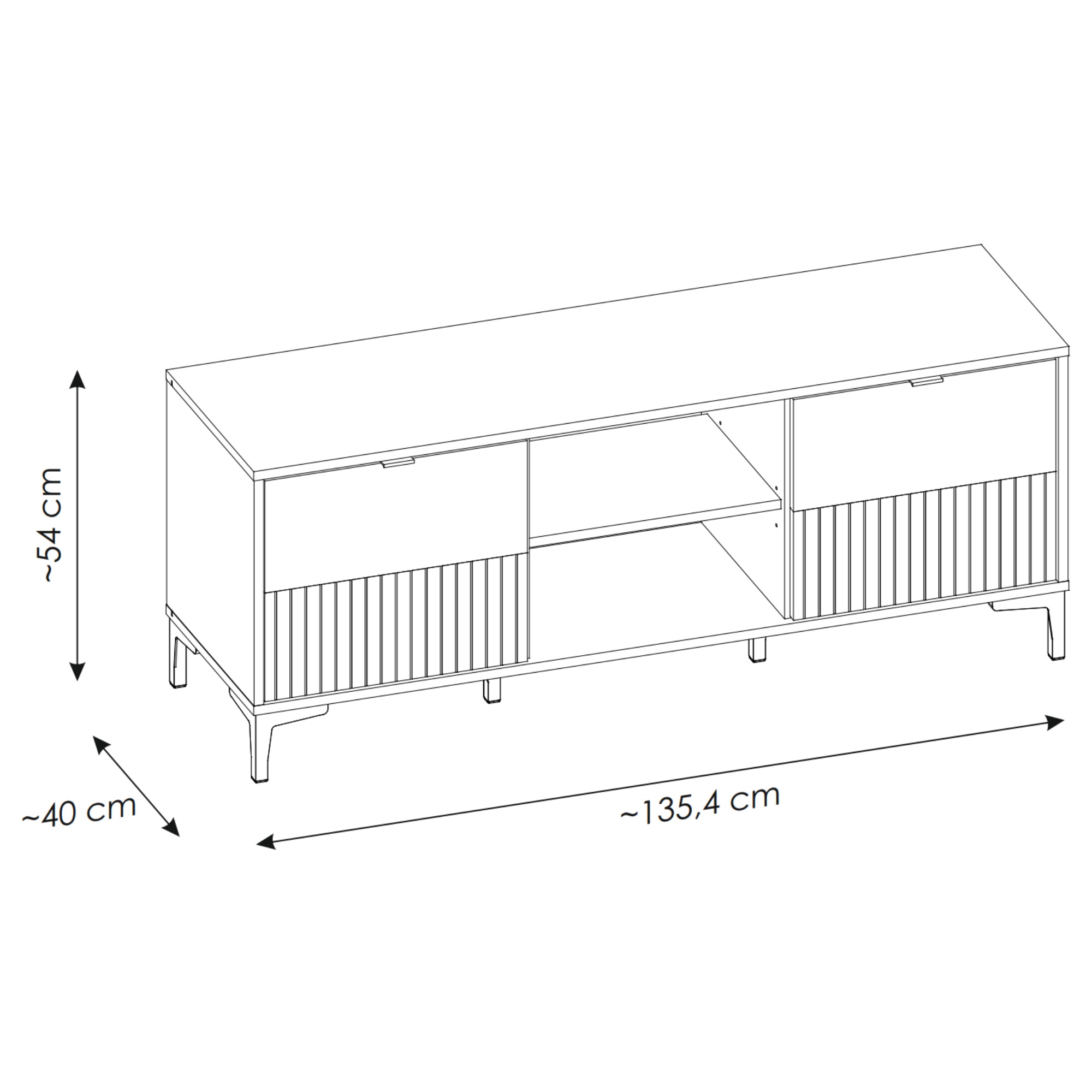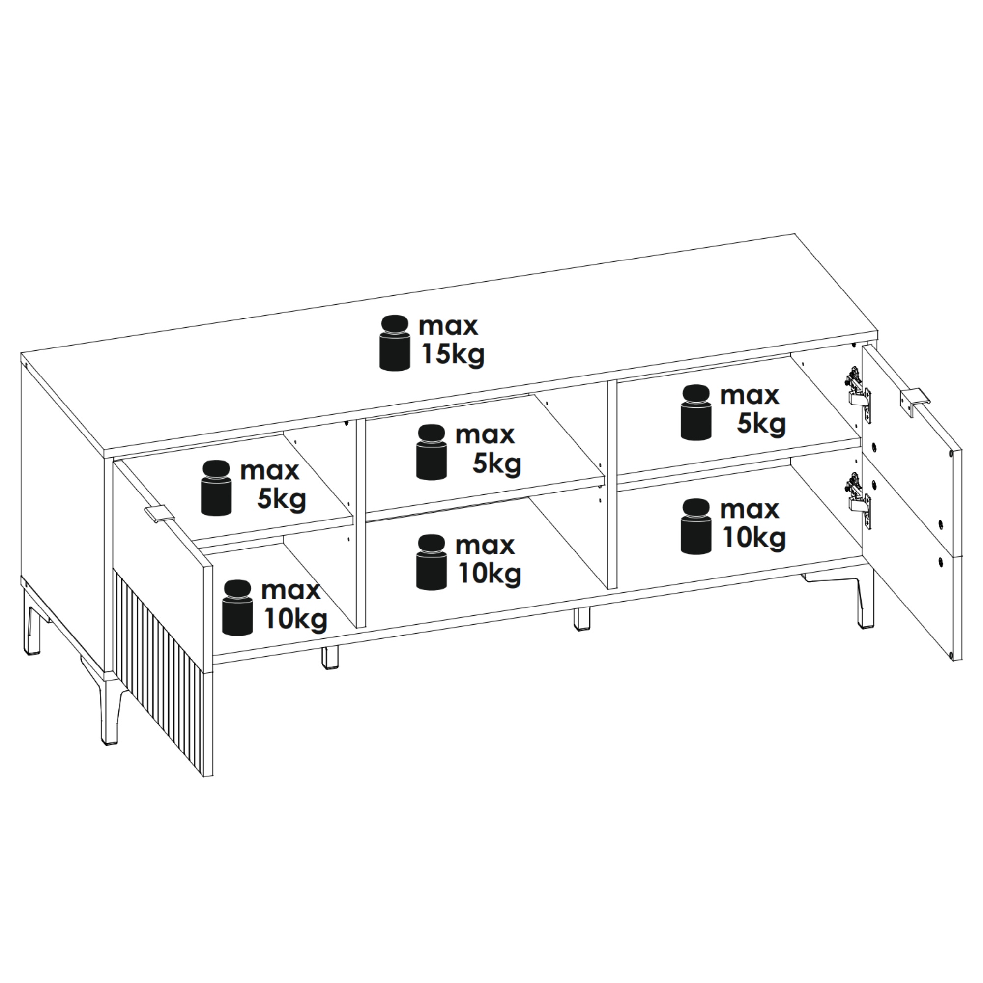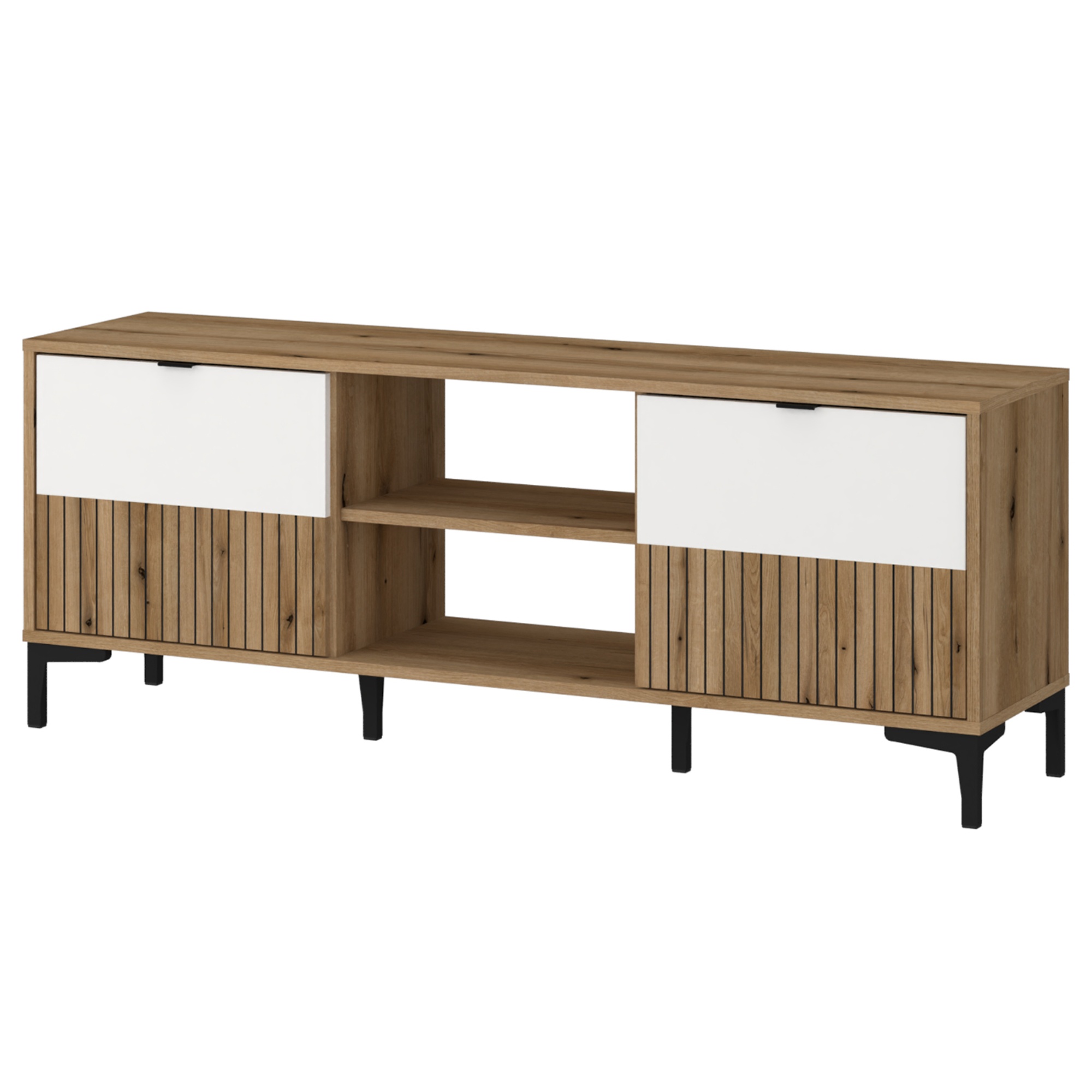Úložný prostor obsahuje vnitřní a otevřené police, kde obdržíte dostatečné místo na zapojení vašeho TV příslušenství. Decentní úchytky podtrhují moderní styl komody. Vrchní deska také dává k dispozici prostor na odkládání různých dekorací či jiných nezbytností.