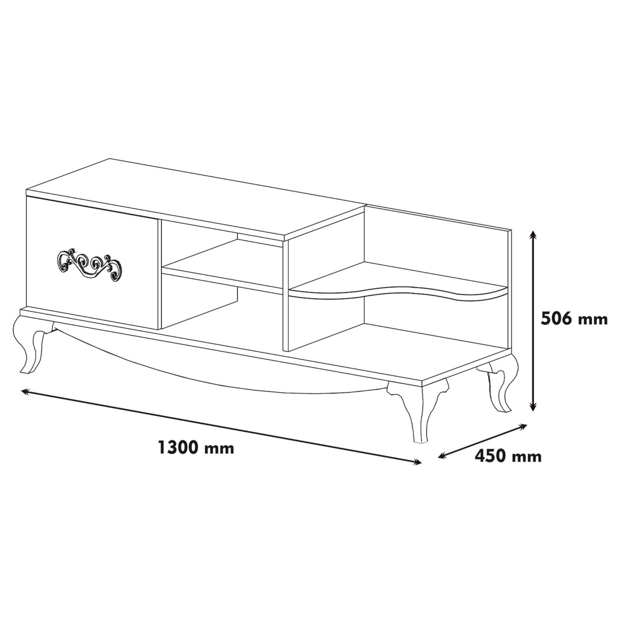 Disponuje 2 policemi, které vytváří 4 oddělené úložné prostory, ideální pro uložení elektroniky, ovladačů i dekorací. Dále je vybavena 1 výklopnými dvířky, za kterými naleznete další úložný prostor. Ten poskytuje místo pro odložení maličkostí, co potřebujete mít po ruce. Dvířka jsou doplněna dekorativní úchytkou, která perfektně dotváří celkový vzhled komody.