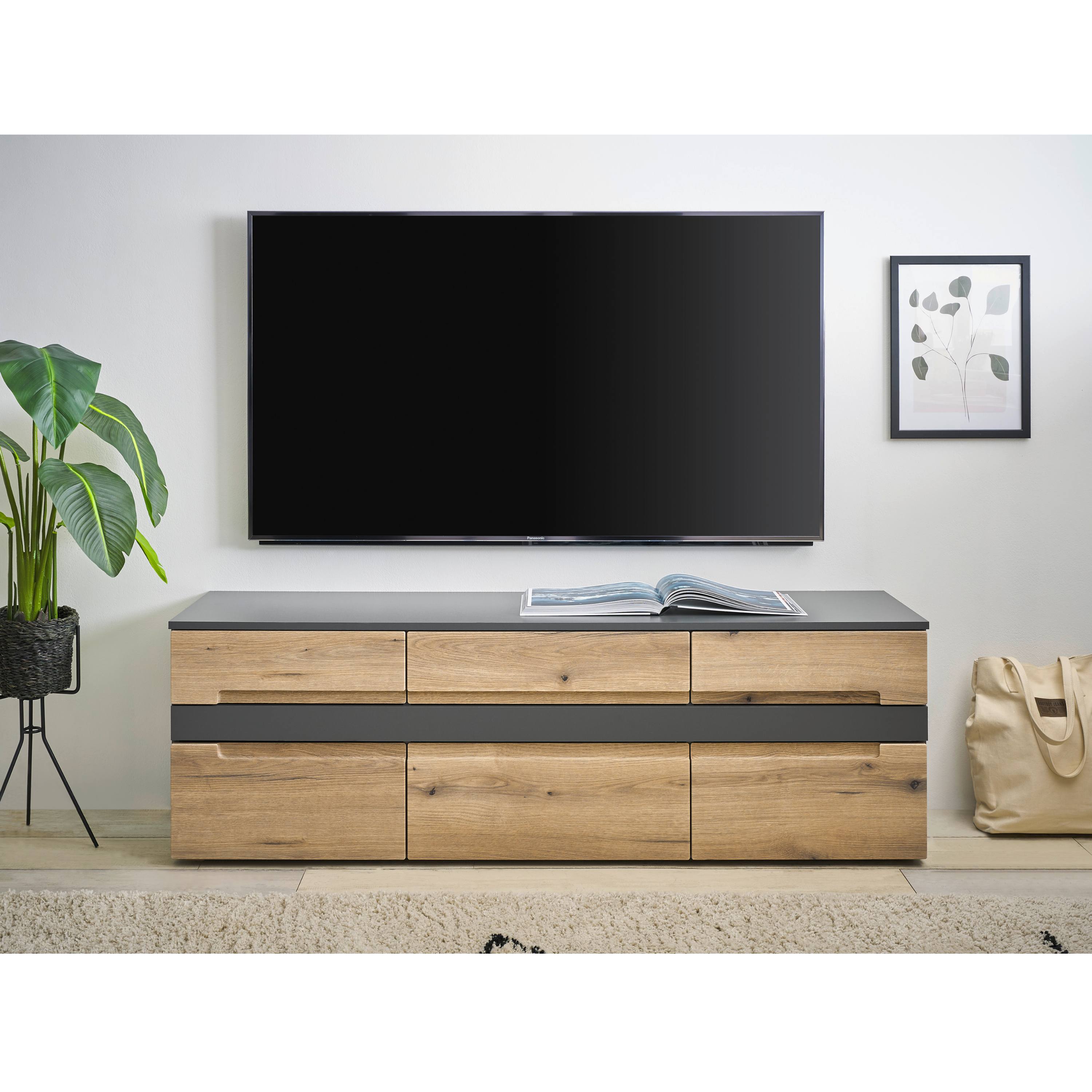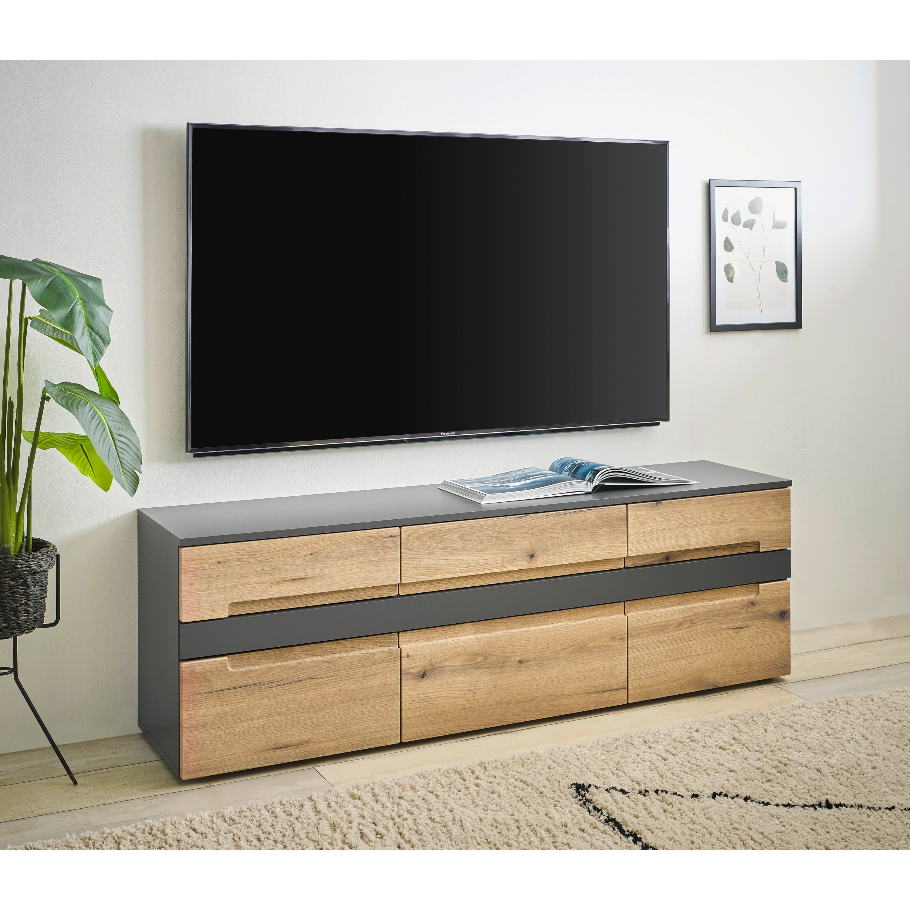 TV komoda TAYLOR v moderním provedení s čistými liniemi zaujme kontrastní kombinací dekoru dubu evoke a antracitové barvy, díky které snadno zapadne do současných interiérů.