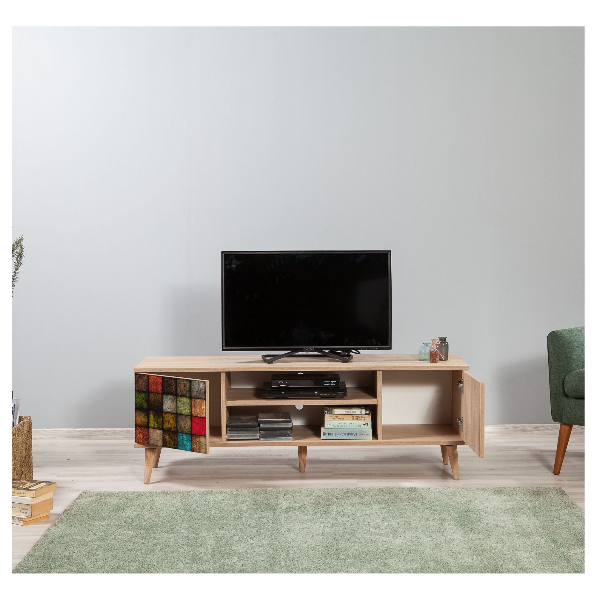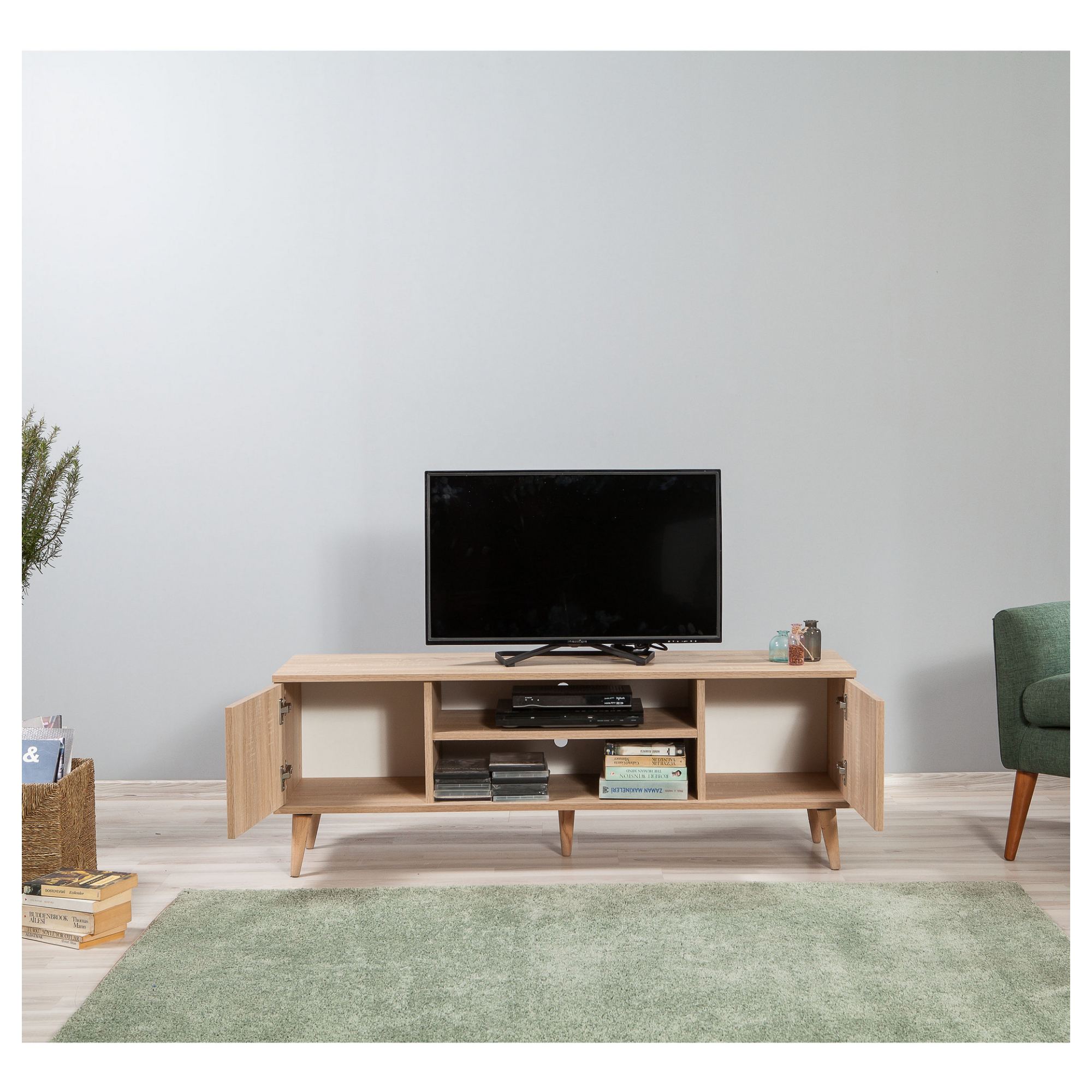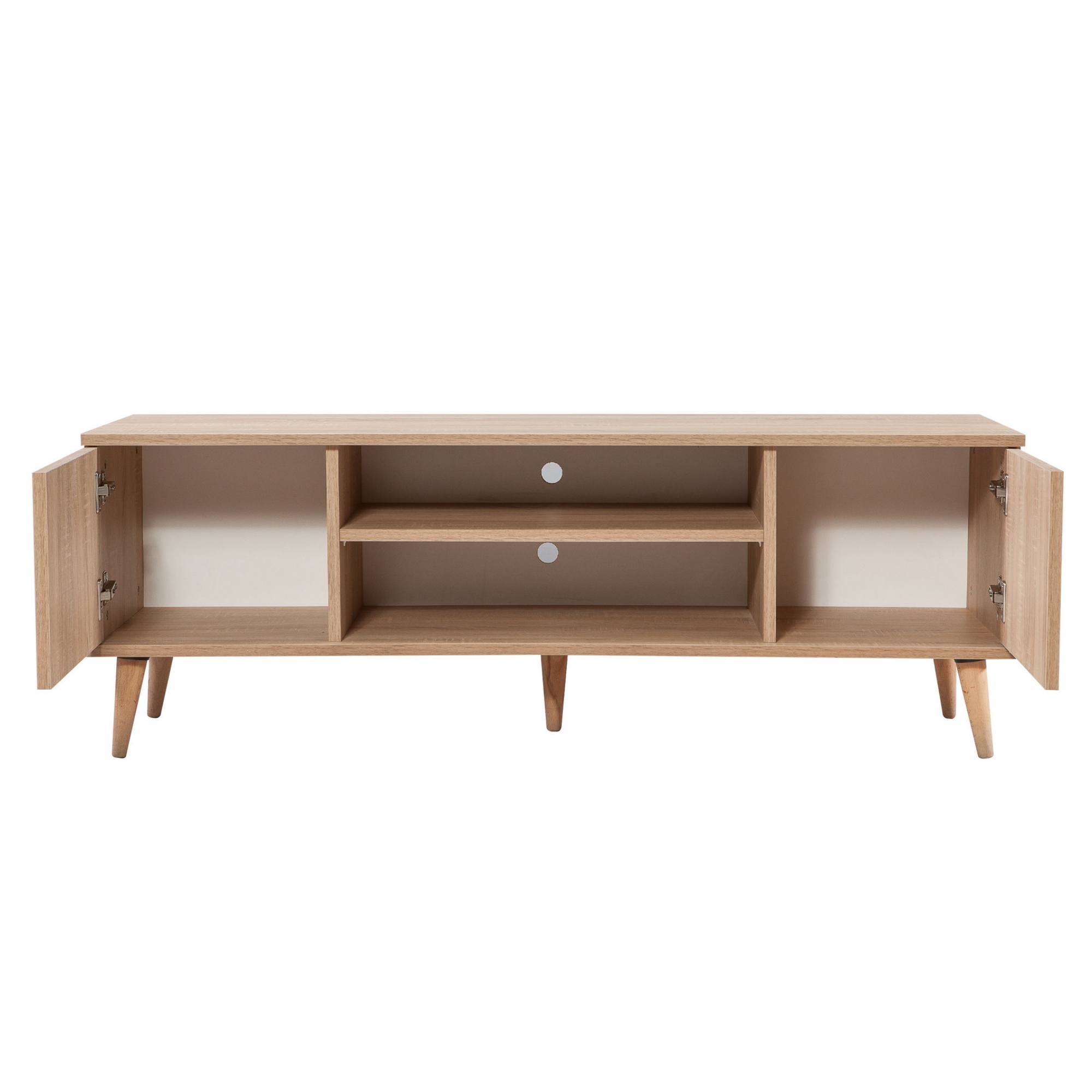 Uprostřed komody je otevřený úložný prostor s 1 policí a otvory pro kabeláž. Je ideálním místem pro umístění set top boxů, DVD přehrávačů a jiné elektroniky. Dále disponuje 2 otočnými dvířky, za kterými naleznete další úložný prostor. Ten poskytuje dostatek místa pro odložení všeho, co potřebujete mít po ruce. Vrchní deska o šířce 140 cm nabízí prostor pro televizi i dekorace. Díky provedení bez úchytek její design hezky vyniká.