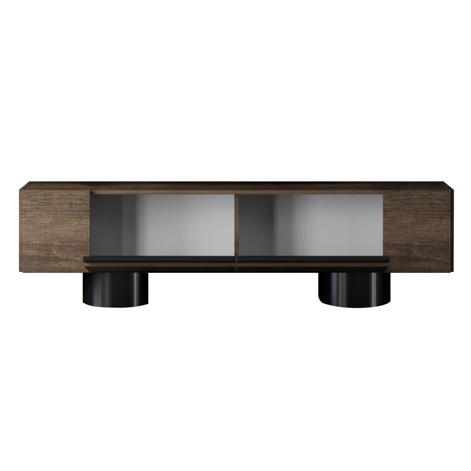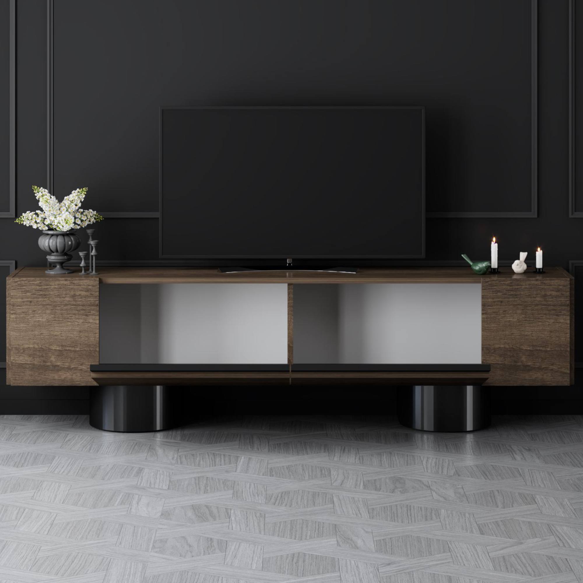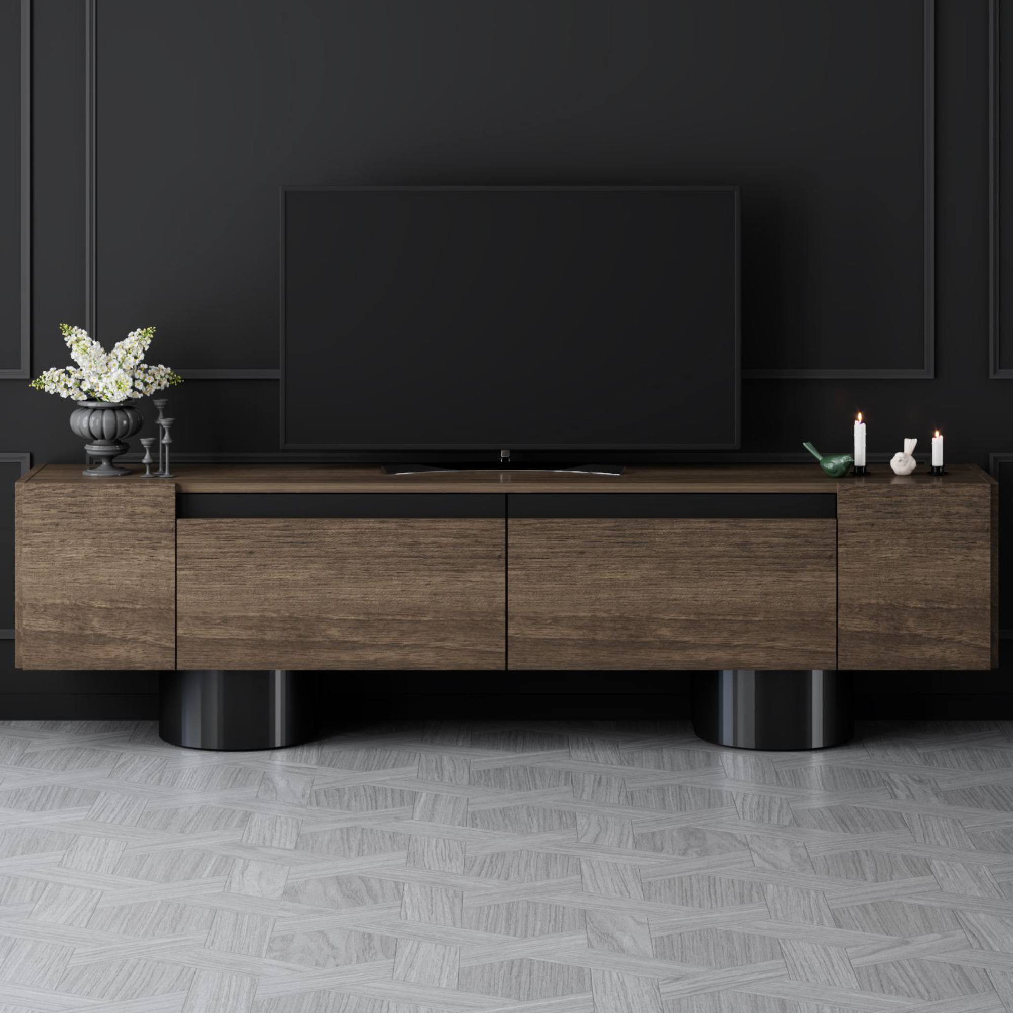 Disponuje 2 výklopnými dvířky, která odkrývají 2 oddělené úložné prostory. Ty vytvářejí dostatek místa pro odložení všeho, co potřebujete mít po ruce. Vrchní deska o šířce 180 cm nabízí prostor pro televizi, elektroniku, ovladače i dekorace. Provedení bez úchytek podtrhuje jeho čistý vzhled a 2 robustní válcové nohy jsou zajímavým designovým prvkem.