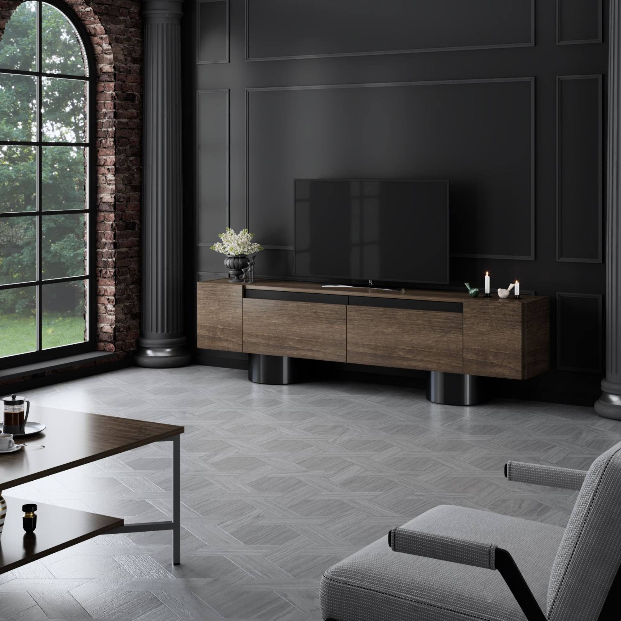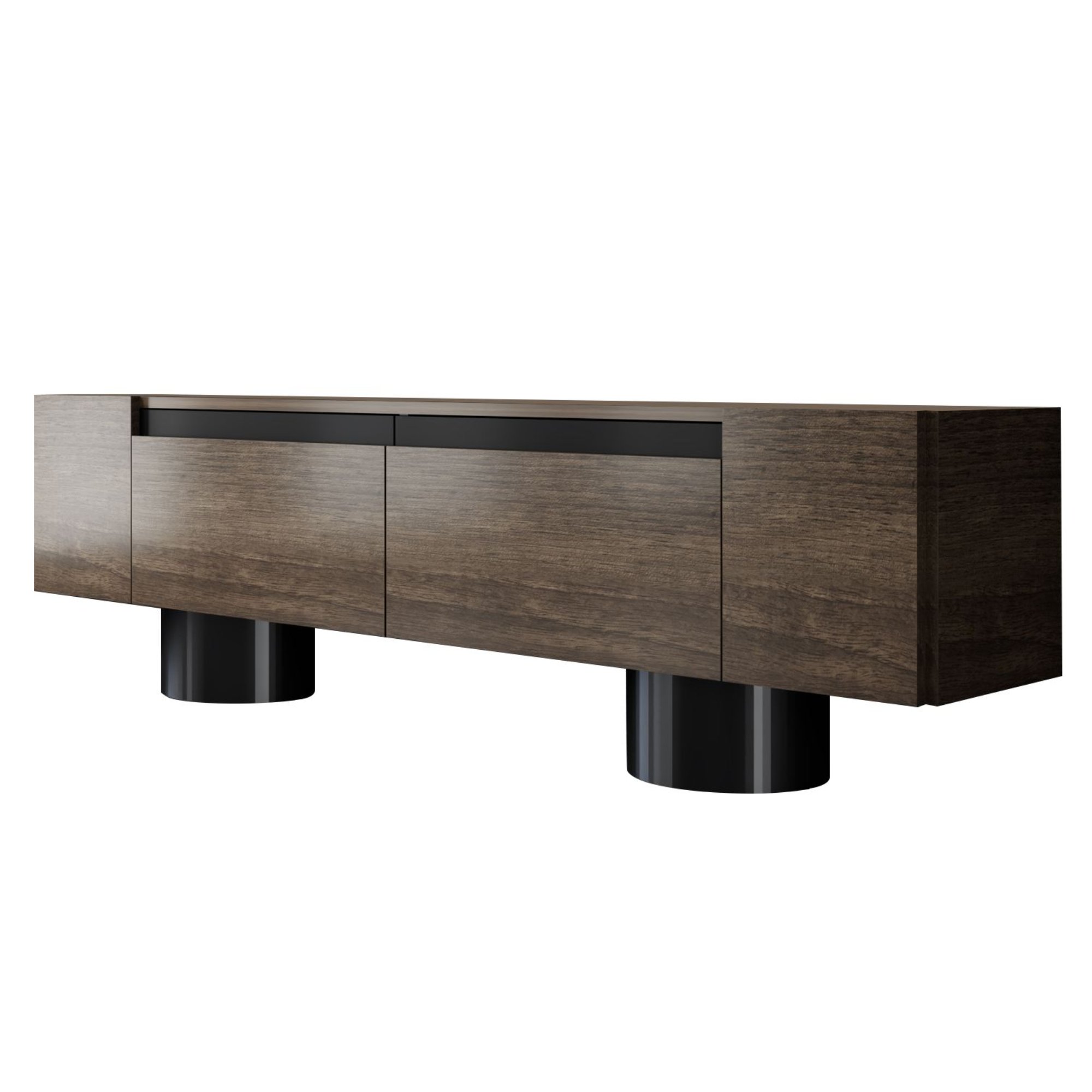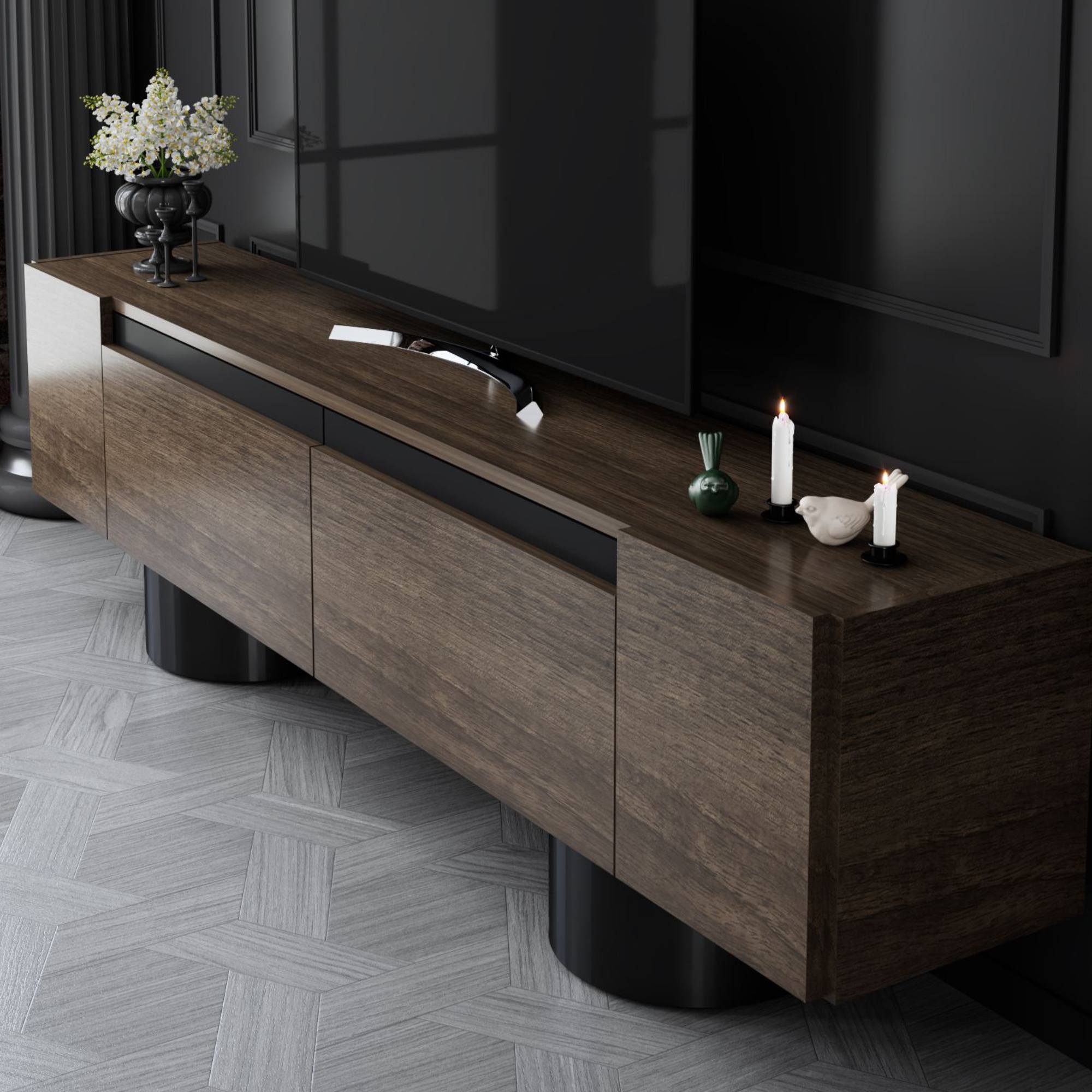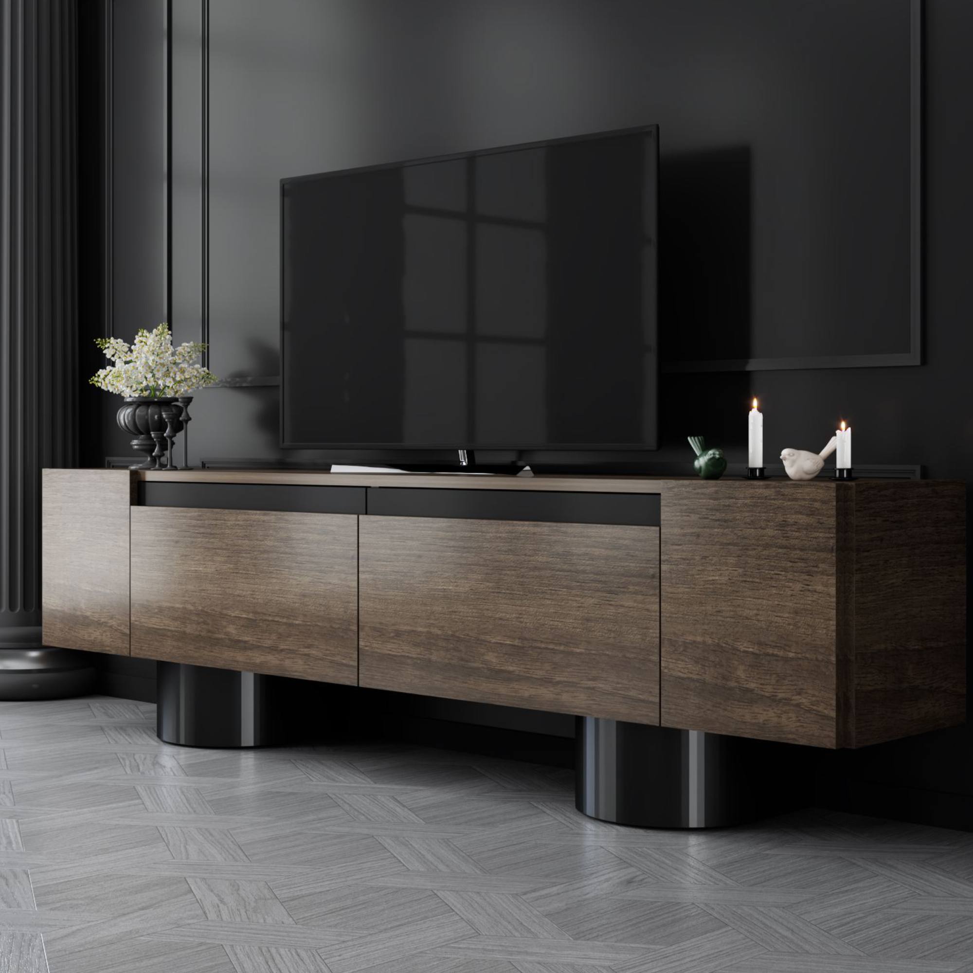 Disponuje 2 výklopnými dvířky, která odkrývají 2 oddělené úložné prostory. Ty vytvářejí dostatek místa pro odložení všeho, co potřebujete mít po ruce. Vrchní deska o šířce 180 cm nabízí prostor pro televizi, elektroniku, ovladače i dekorace. Provedení bez úchytek podtrhuje jeho čistý vzhled a 2 robustní válcové nohy jsou zajímavým designovým prvkem.