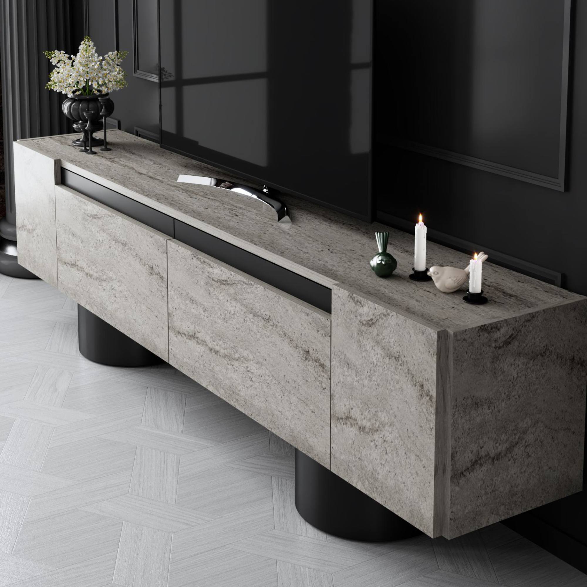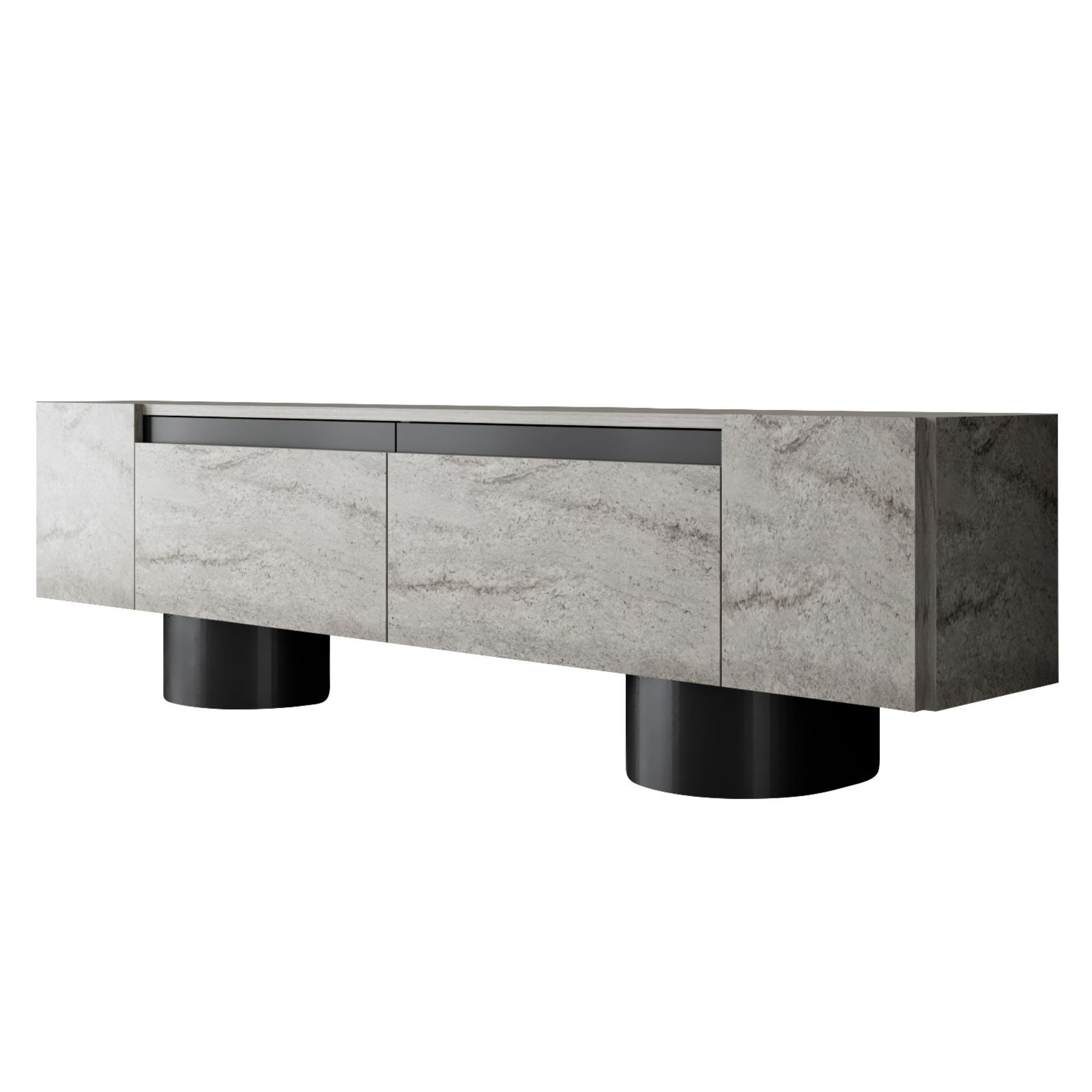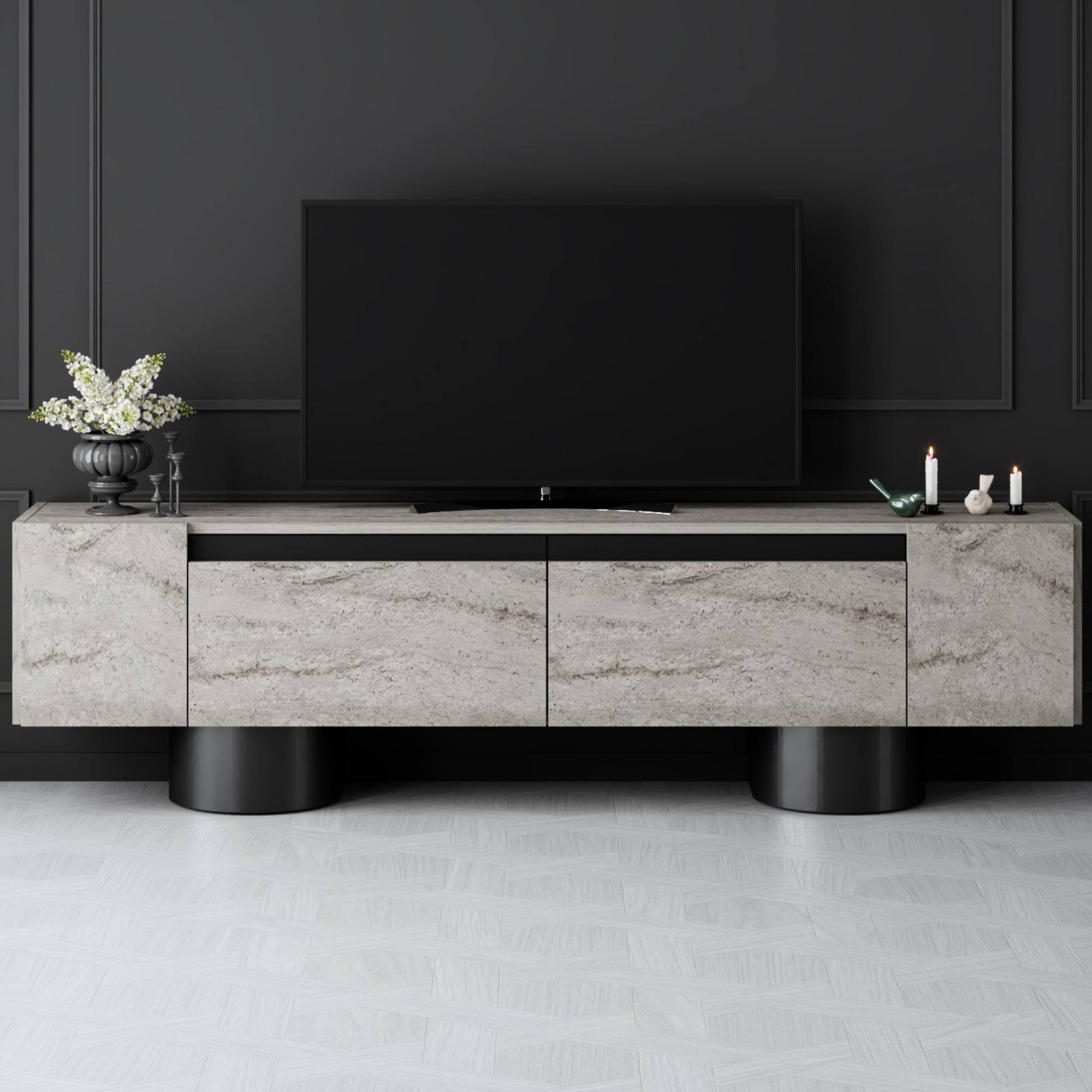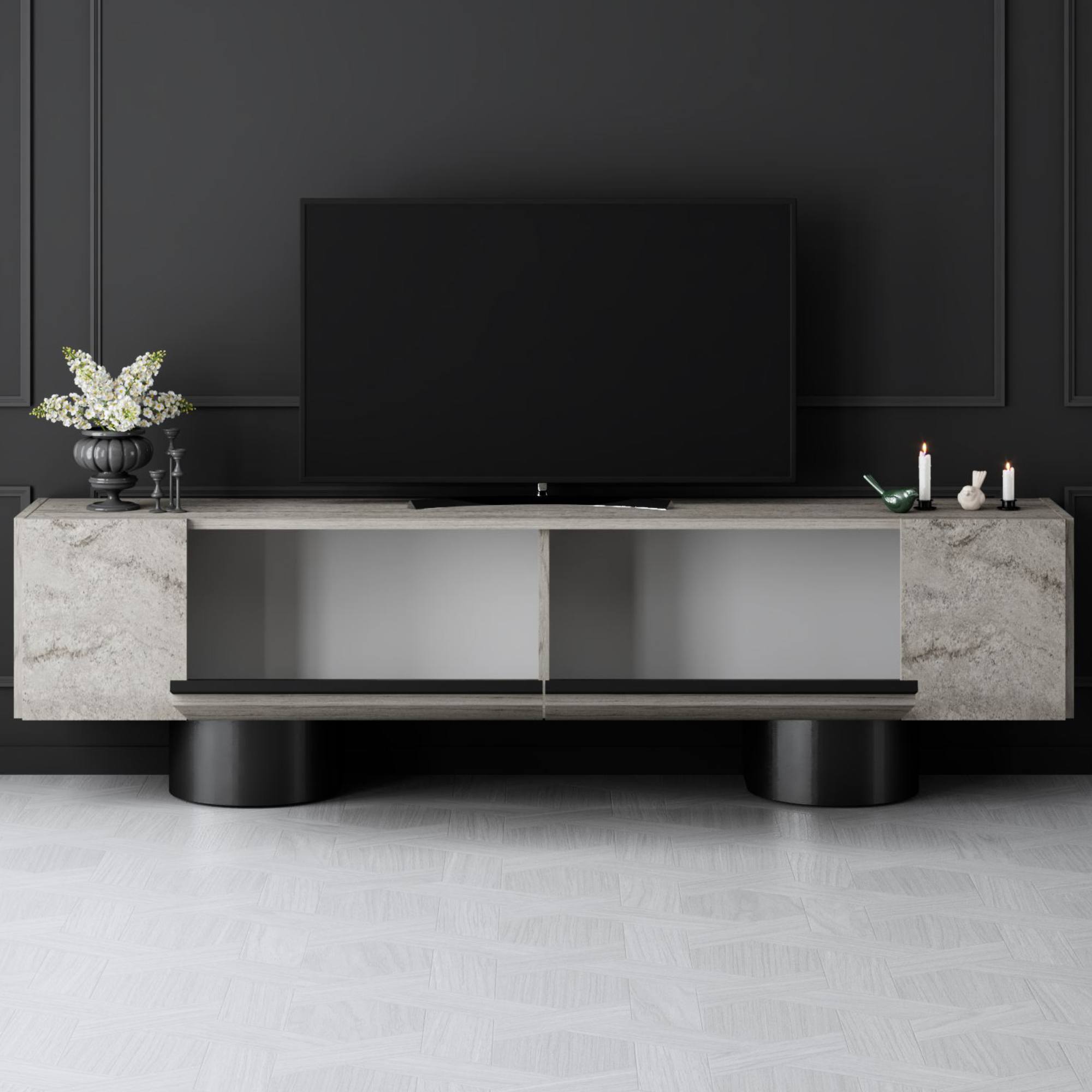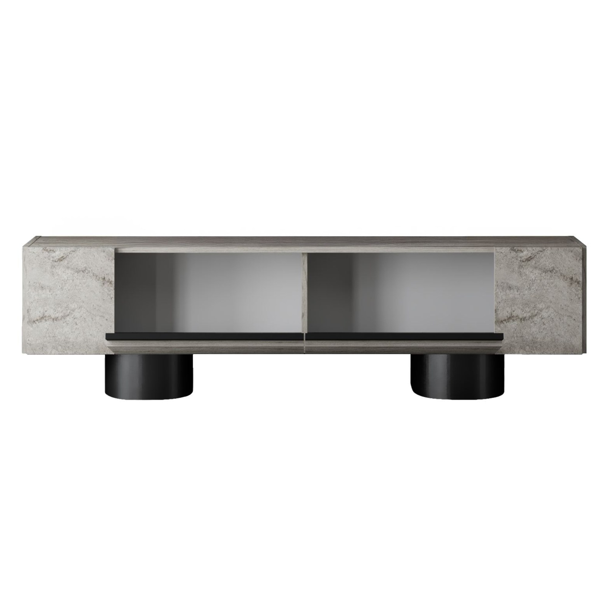 Disponuje 2 výklopnými dvířky, která odkrývají 2 oddělené úložné prostory. Ty vytvářejí dostatek místa pro odložení všeho, co potřebujete mít po ruce. Vrchní deska o šířce 180 cm nabízí prostor pro televizi, elektroniku, ovladače i dekorace. Provedení bez úchytek podtrhuje jeho čistý vzhled a 2 robustní válcové nohy jsou zajímavým designovým prvkem.