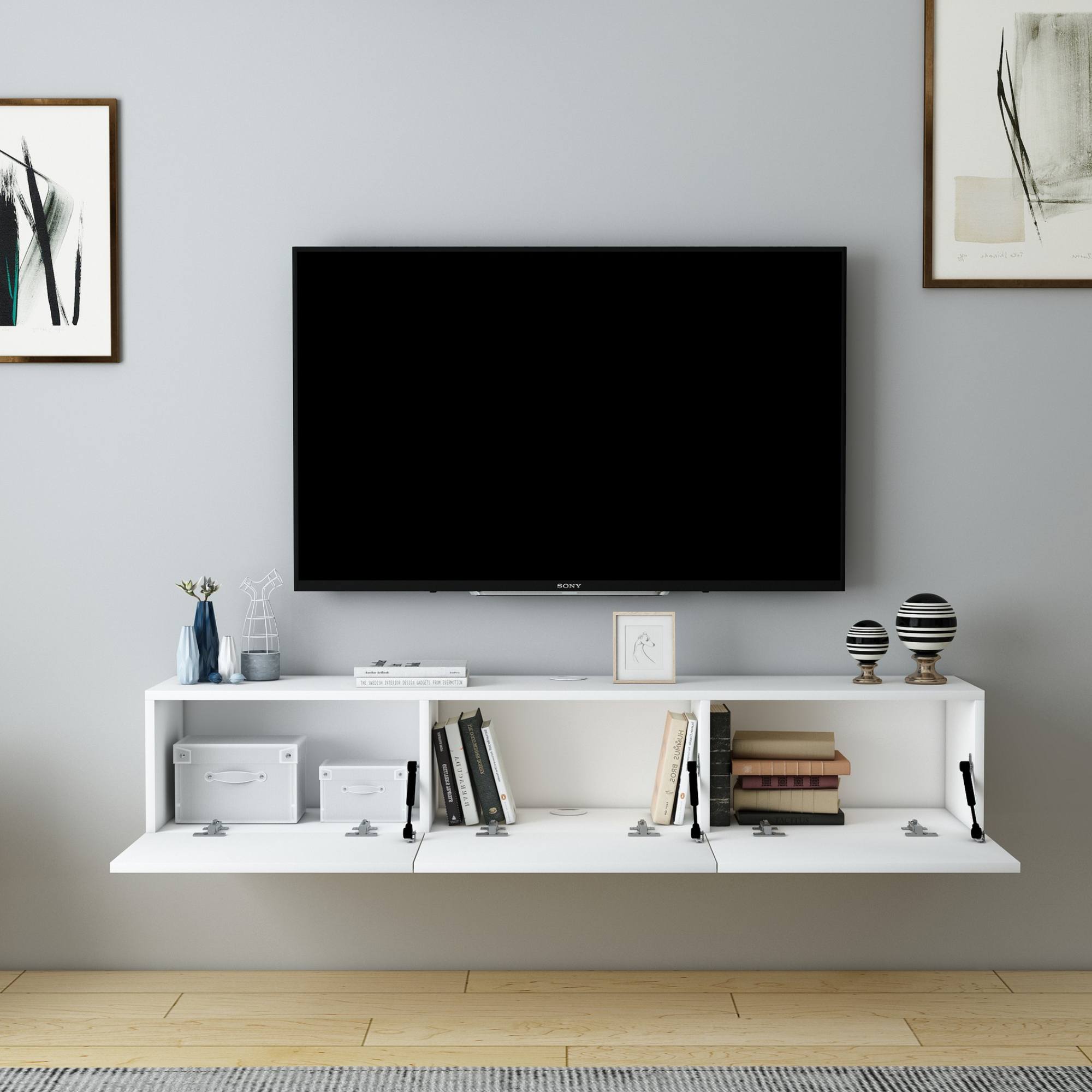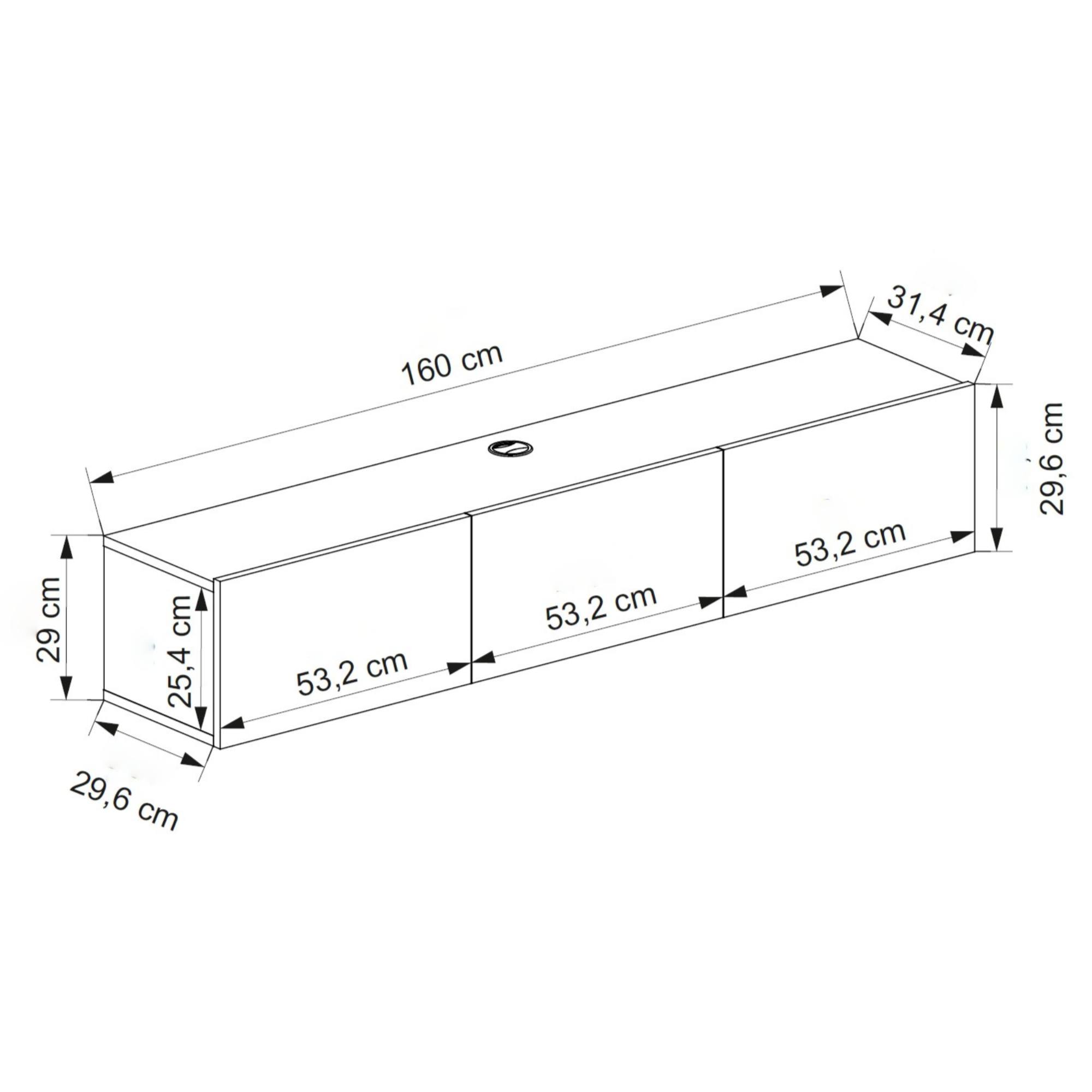 Závěsný TV stolek DENBY, který zaujme díky svému stylovému bezúchytovému provedení, je ztělesněním minimalistického stylu.