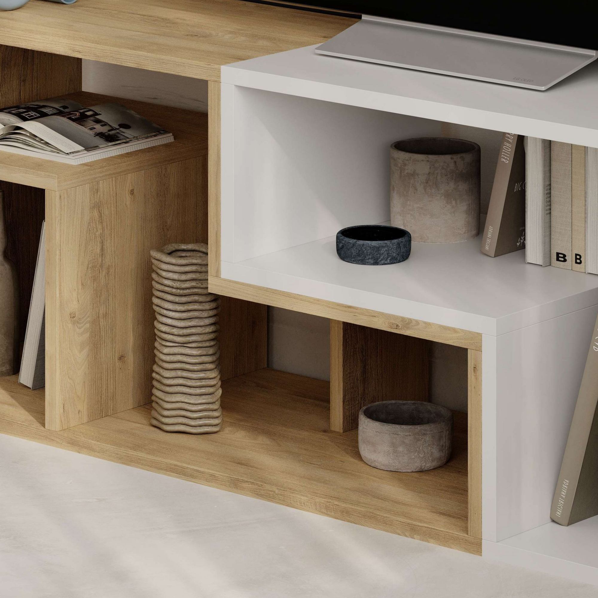 TV stolek GLIS, který je vyhotovený v moderním stylu, lze zmontovat 2 různými způsoby, a tak jej můžete přizpůsobit vašemu interiéru.