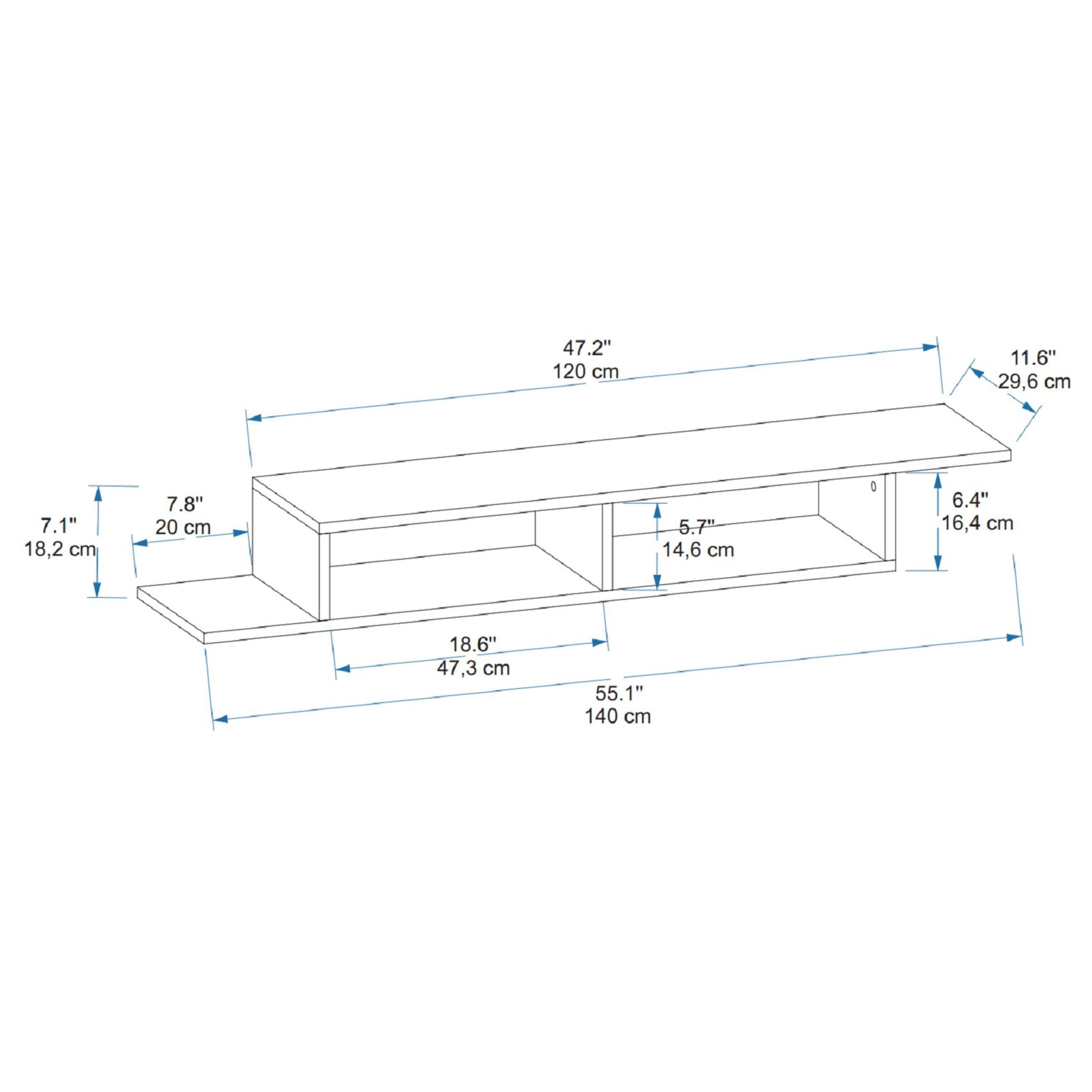 TV stolek MUSON se vyznačuje svým neobvyklým designem a nástěnným provedením. Ozdobí jakýkoli interiér, kterému přidá na moderním vzhledu. Horní deska mimo samotné televize pojme i různé dekorace. Naopak dolní police můžete využít přímo pro TV příslušenství. Otevřený prostor nabídne místo pro další předměty, které si přejete vystavit.