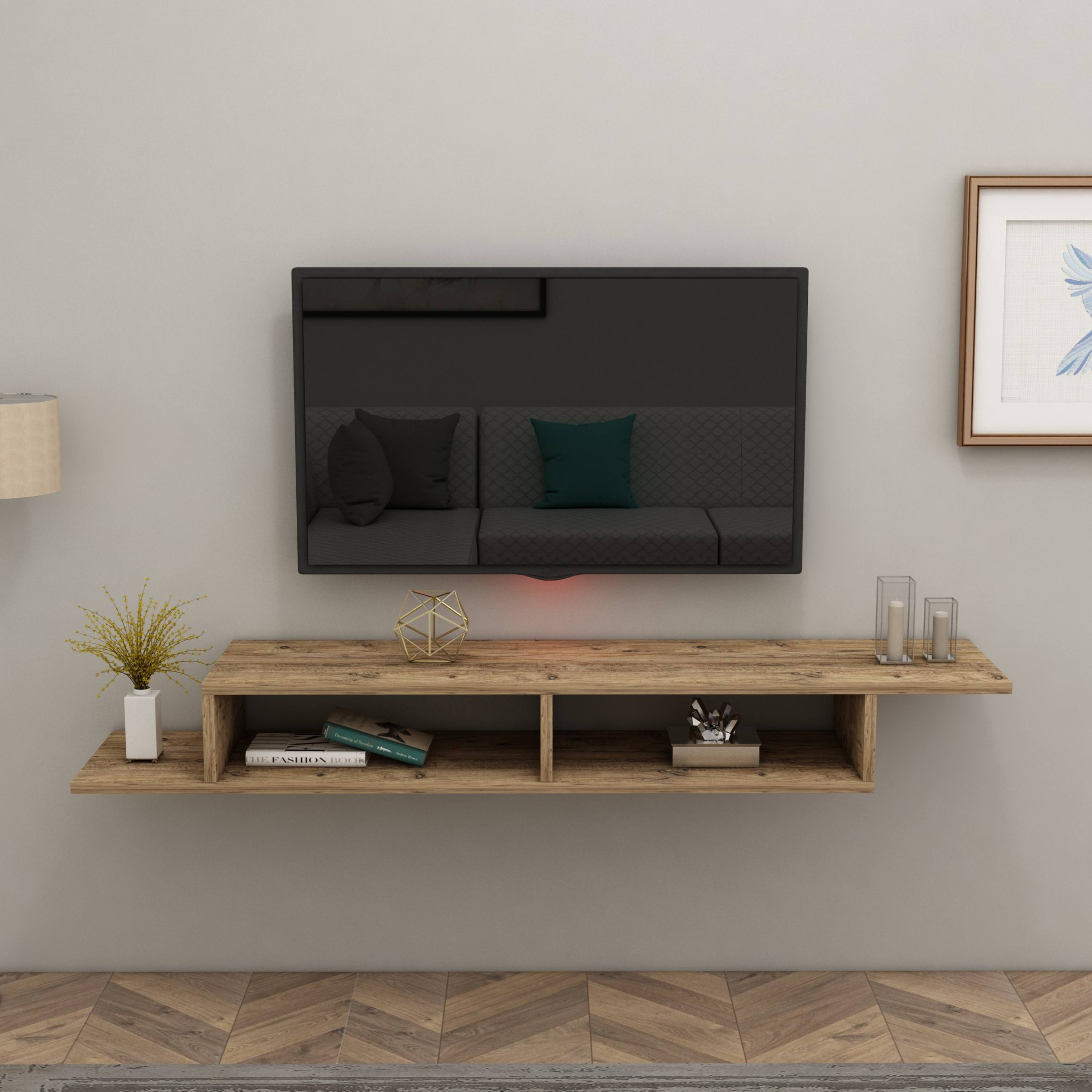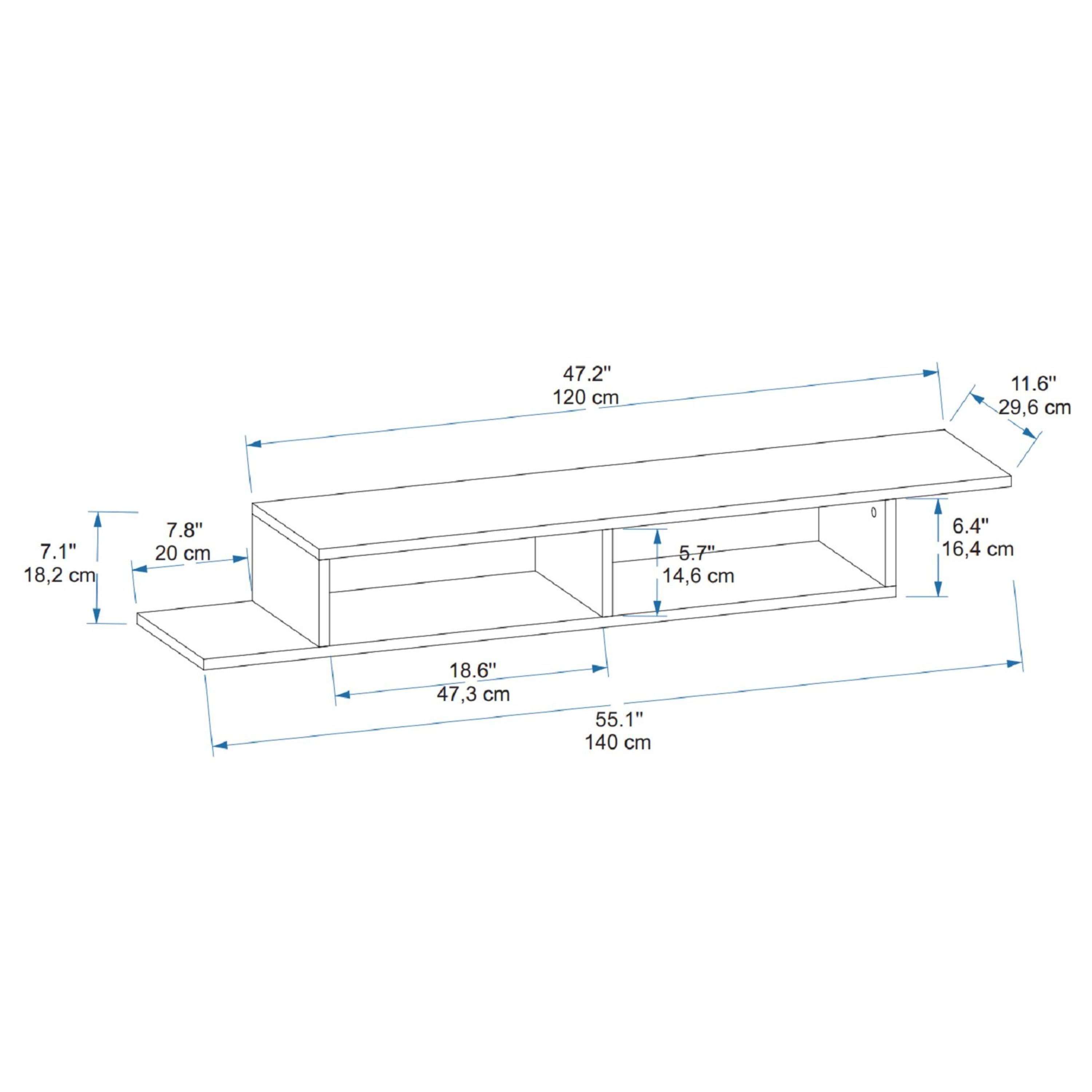 TV stolek MUSON se vyznačuje svým neobvyklým designem a nástěnným provedením. Ozdobí jakýkoli interiér, kterému přidá na moderním vzhledu. Horní deska mimo samotné televize pojme i různé dekorace. Naopak dolní police můžete využít přímo pro TV příslušenství. Otevřený prostor nabídne místo pro další předměty, které si přejete vystavit.
