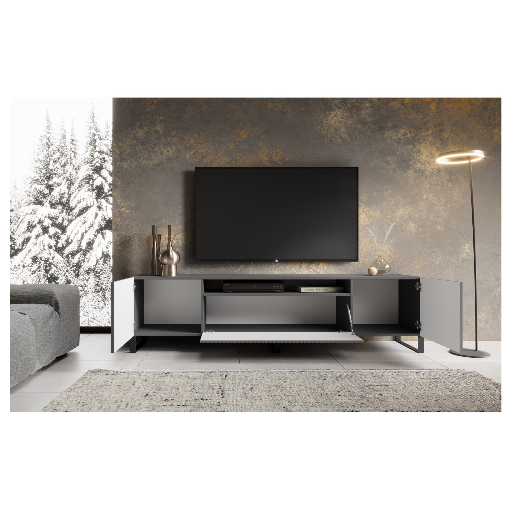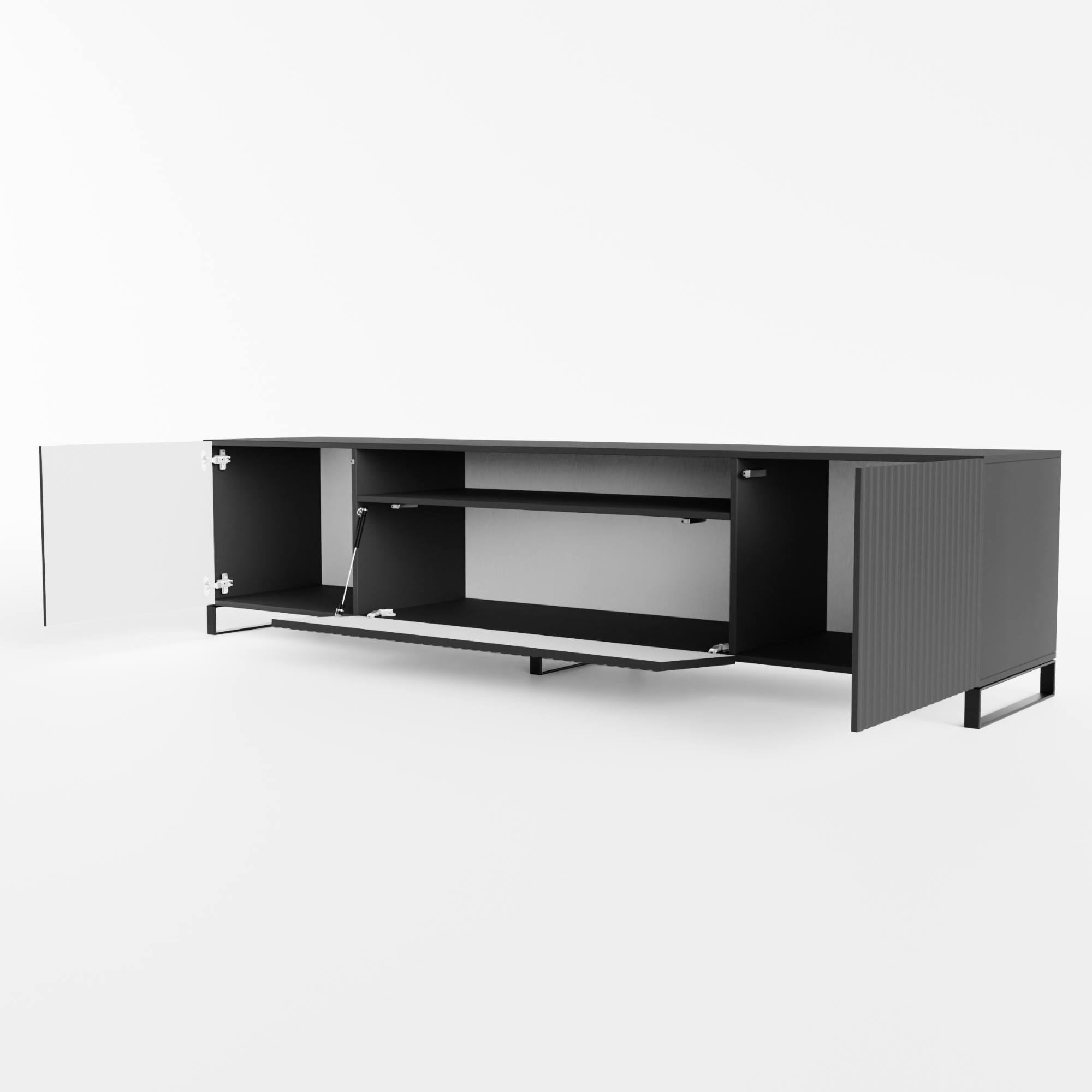 TV stolek nabízí dostatek úložného prostoru, který je uzavíratelný 2 otočnými a 1 výklopnými dvířky**. Poskytne tak místo nejen pro TV příslušenství, ale i další věci, které v obývacím pokoji potřebujete mít po ruce.