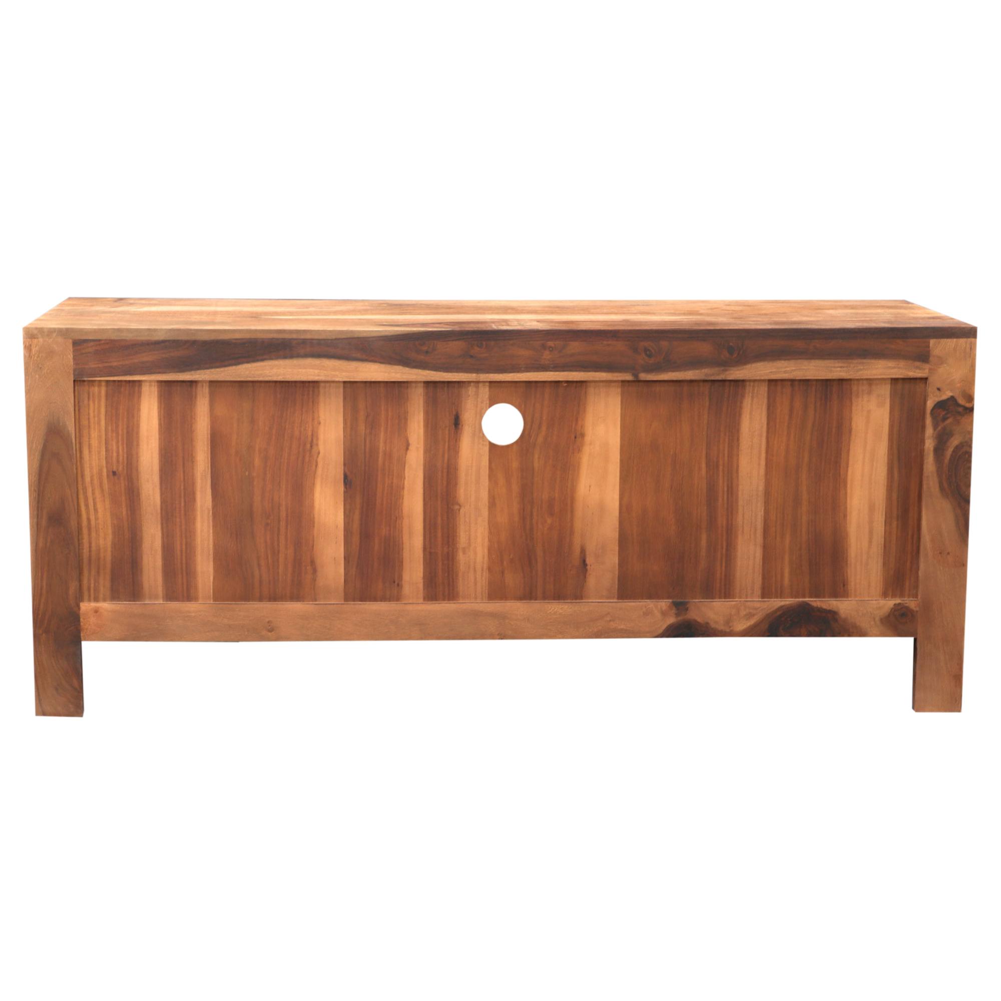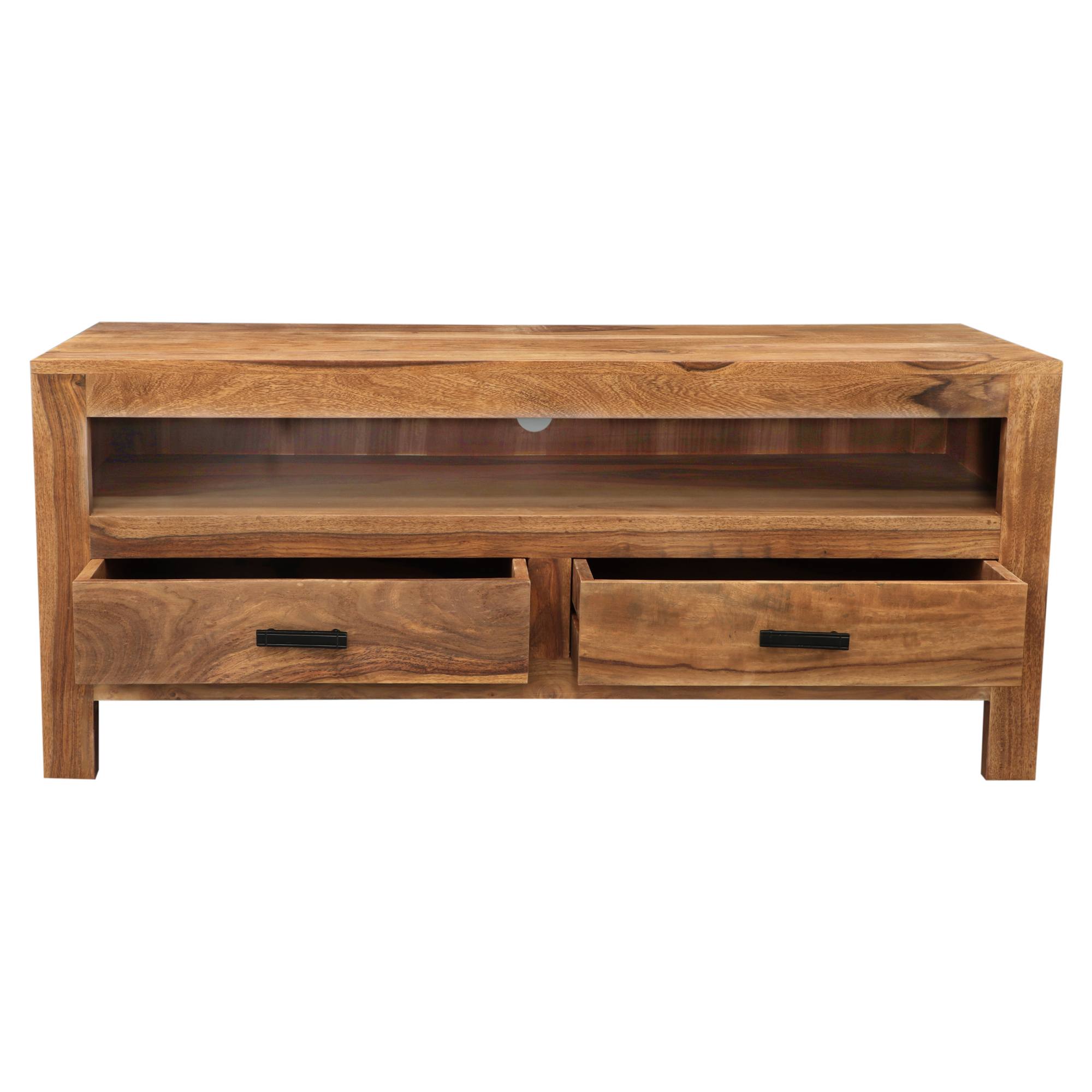 Je vyroben z masivního palisandrového dřeva s charakteristicky tmavou barvou a krásnou výraznou kresbou, kterou ještě více zdůrazňuje mořená povrchová úprava. Ta vytváří jeho orientální design a dodává do interiéru přírodní nádech. Díky unikátní kresbě je každý kus originál. Palisandr se vyznačuje svou pevností a tvrdostí, jež zajišťuje jeho stabilní konstrukci. Disponuje 2 zásuvkami s úchytkami pro pohodlnou manipulaci. Nad zásuvkami naleznete další otevřený úložný prostor s otvorem pro kabeláž, ideální pro umístění DVD přehrávačů, set top boxů či jiných zařízení.