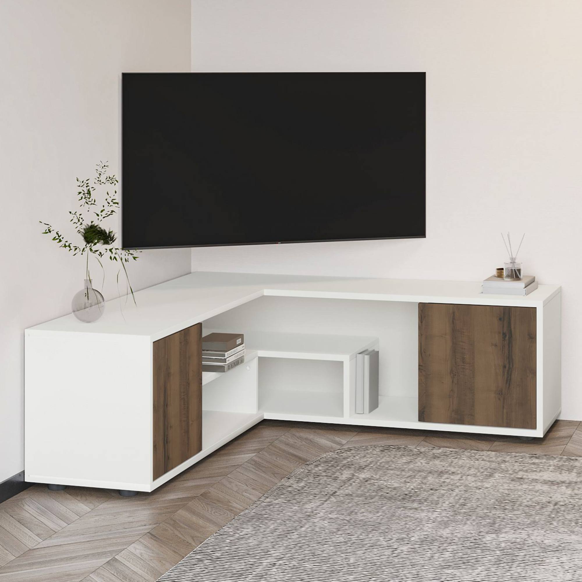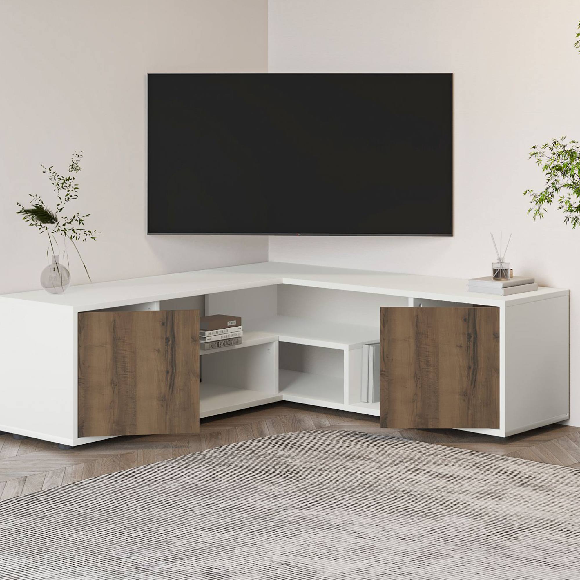 Jeho součástí je nejen prostor za otočnými dvířky, ale i 2 vložené police. Díky tomu vám poskytne místo nejen pro TV příslušenství, ale i pro další věci, které v obývacím pokoji potřebujete mít po ruce.