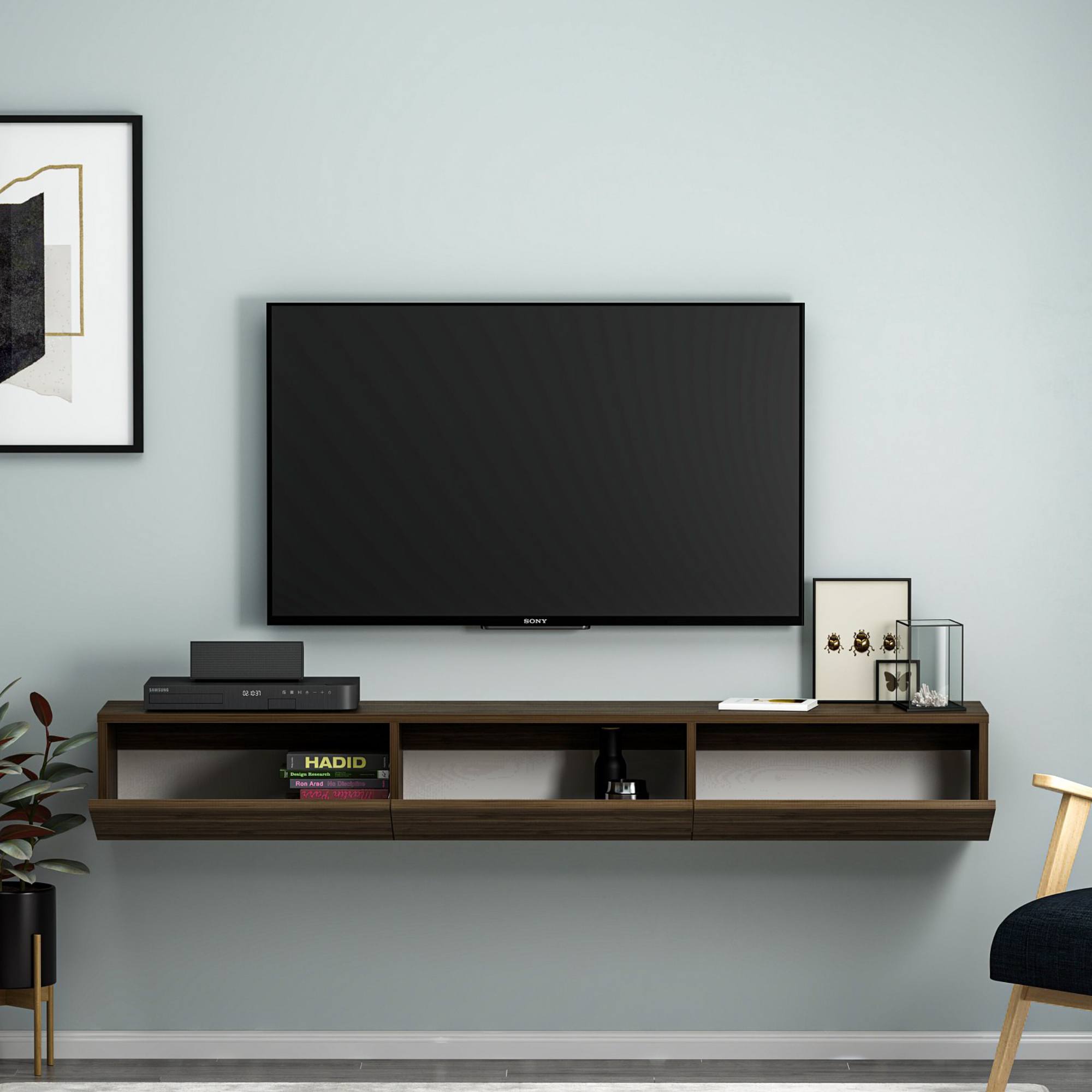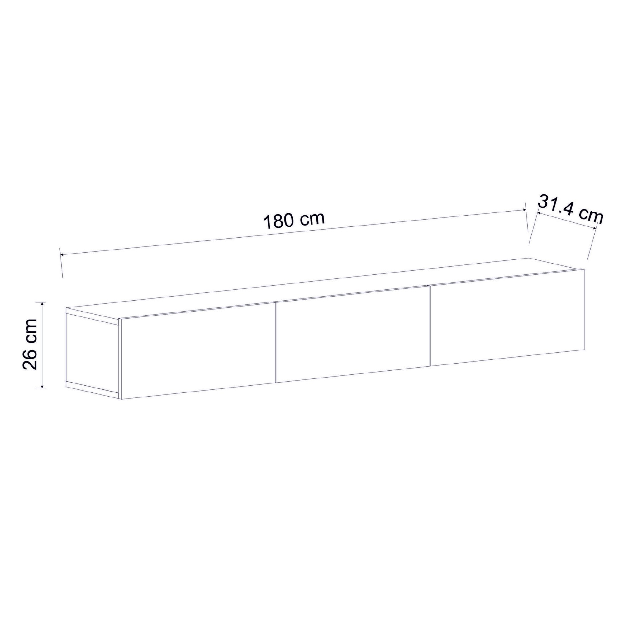 Disponuje výklopnými dvířky, která odkrývají 3 oddělené úložné prostory. Ty vytvářejí dostatek místa pro odložení všeho, co potřebujete mít po ruce. Vrchní deska o šířce 180 cm nabízí prostor pro elektroniku, ovladače či dekorace. Díky nástěnnému provedení jej lze umístit tak, jak vám to nejlépe vyhovuje. Provedení bez úchytek a nohou perfektně podtrhuje jeho čistý design. Díky tomu se bude snadno kombinovat s dalšími doplňky v interiéru.