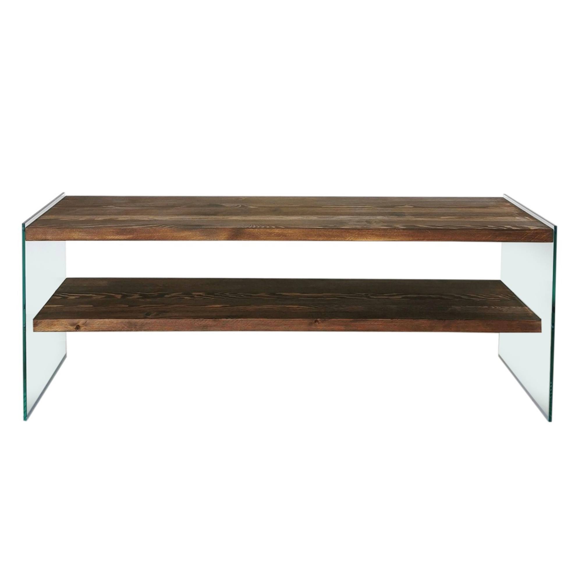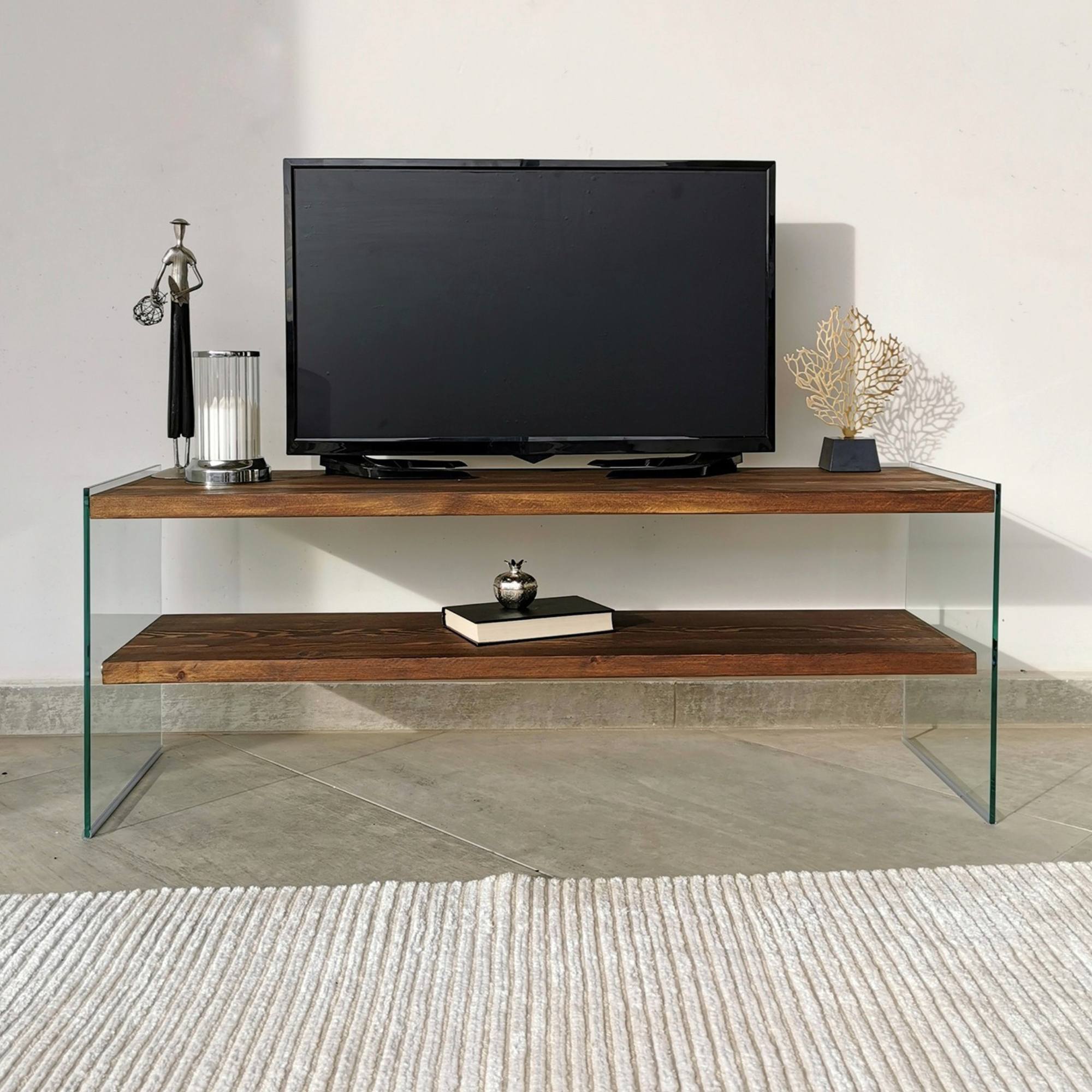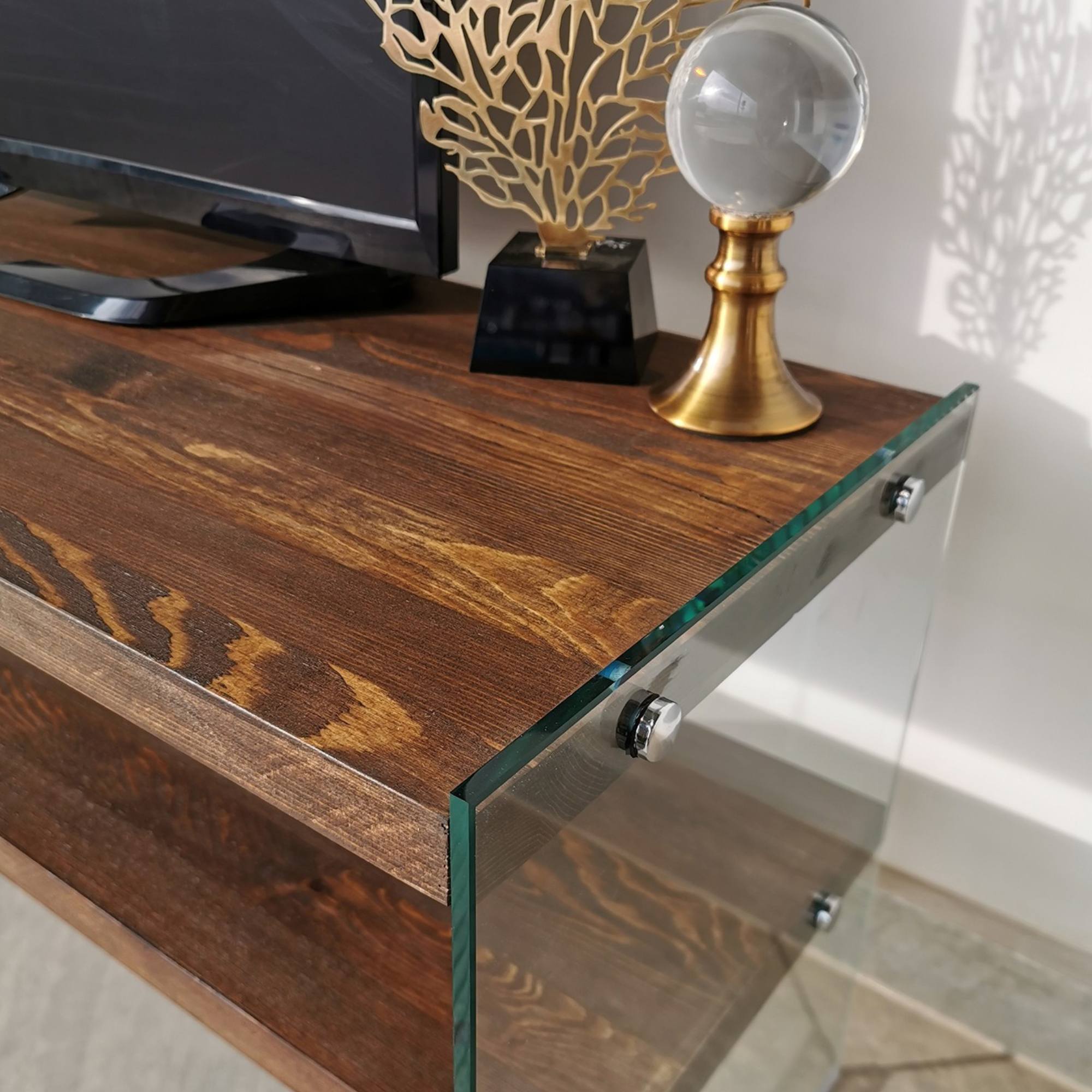 Stabilní nohy tohoto TV stolku jsou vyrobeny z tvrzeného skla. Horní deska a 1 vložená police jsou z masivního borovicového dřeva.