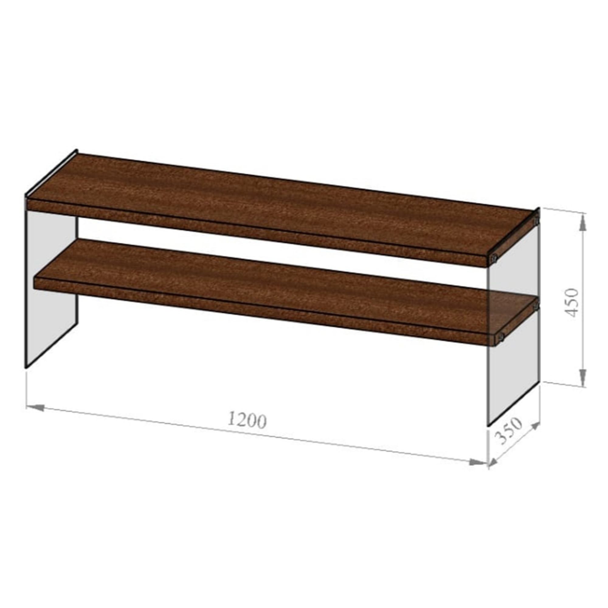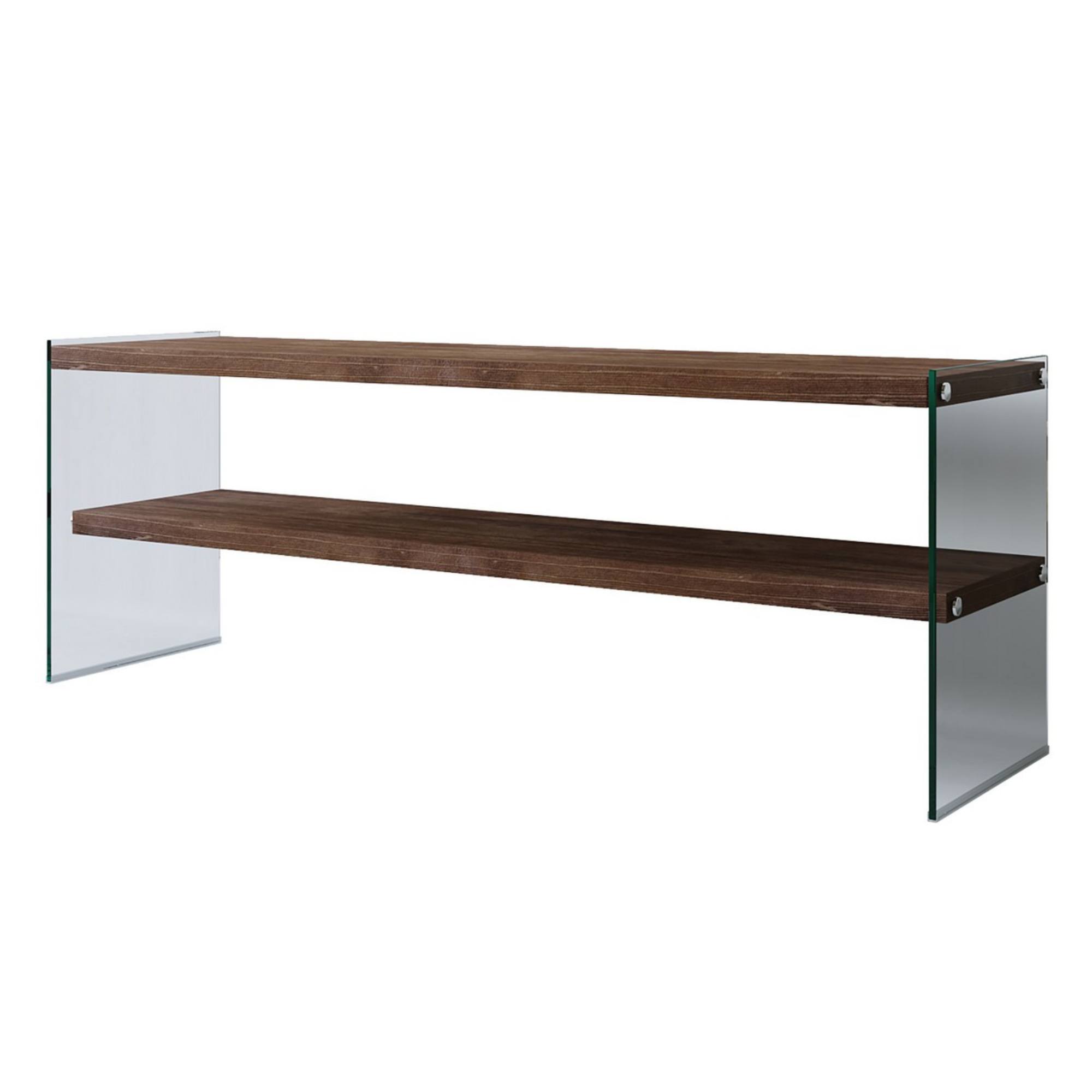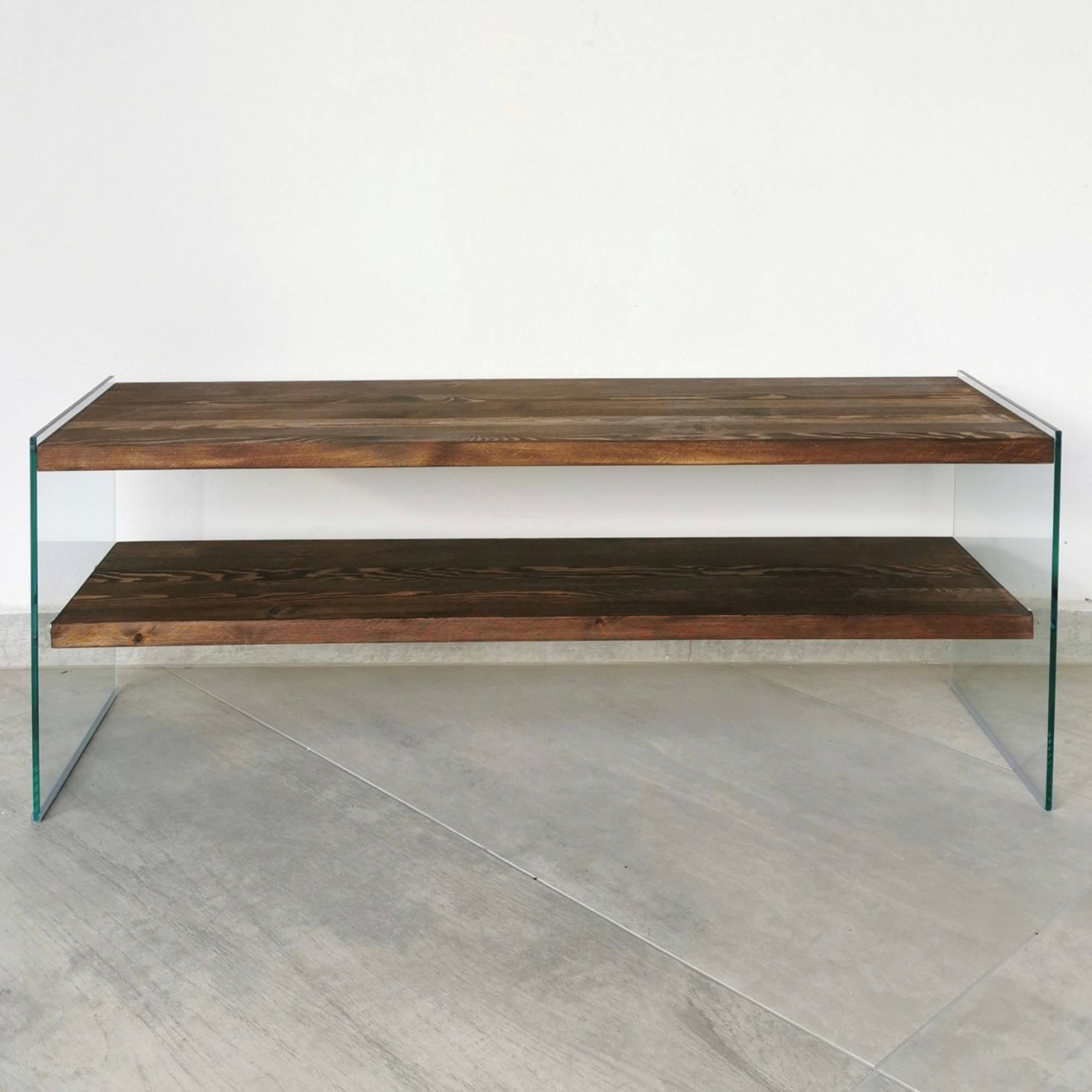 Stabilní nohy tohoto TV stolku jsou vyrobeny z tvrzeného skla. Horní deska a 1 vložená police jsou z masivního borovicového dřeva.