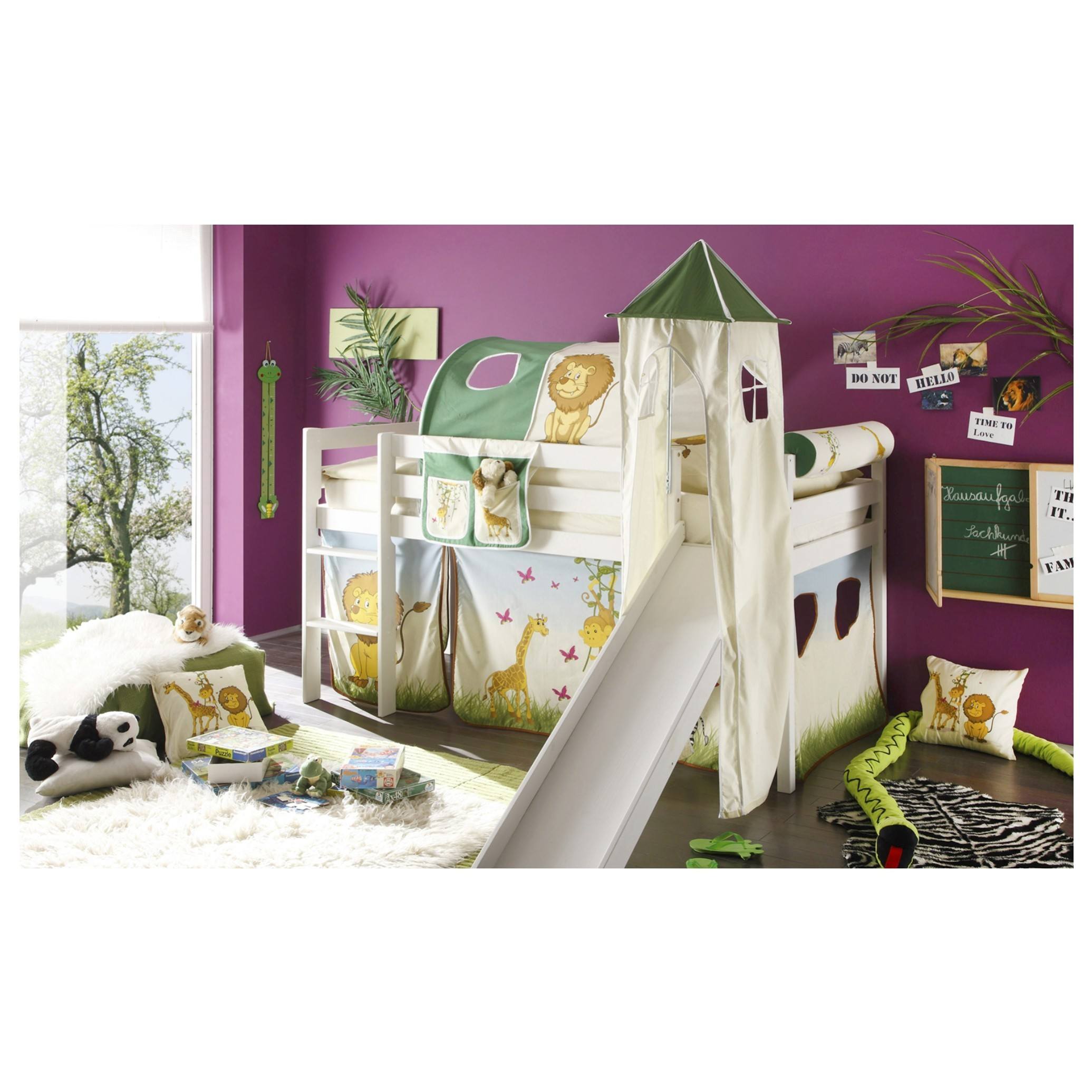 Originální barevný doplněk k posteli, který dává dětem pocit většího soukromí. Kovový věžový rám se záclonkou. Motiv safari.