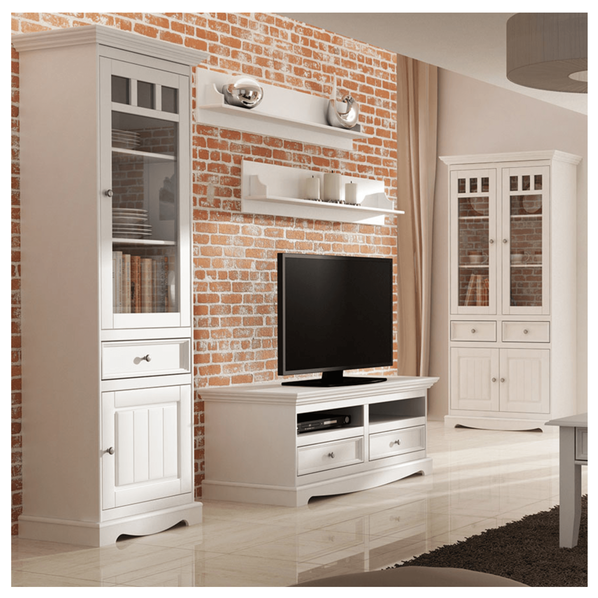 Vitrína BELLU 2D nabízí praktický, úložný prostor a také atraktivní vzhled, díky kterému zaujme na první pohled. Je vyhotovena z masivního dřeva finské borovice zaručujícího odolnost a dlouhou životnost. Pod bílou barvou nenápadně prosvítá přírodní kresba dřeva, která dělá z každého kusu nábytku originál. Romantický vzhled s nádechem venkova dotváří množství klasických zdobných prvků jako je dekorativní frézování, pilastr ve vrchní části a zajímavě tvarovaná podstava.