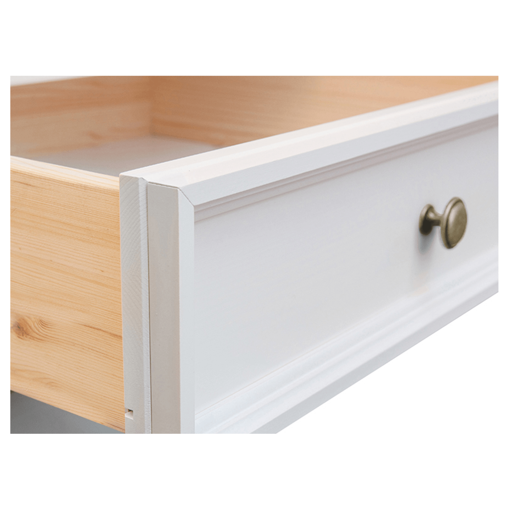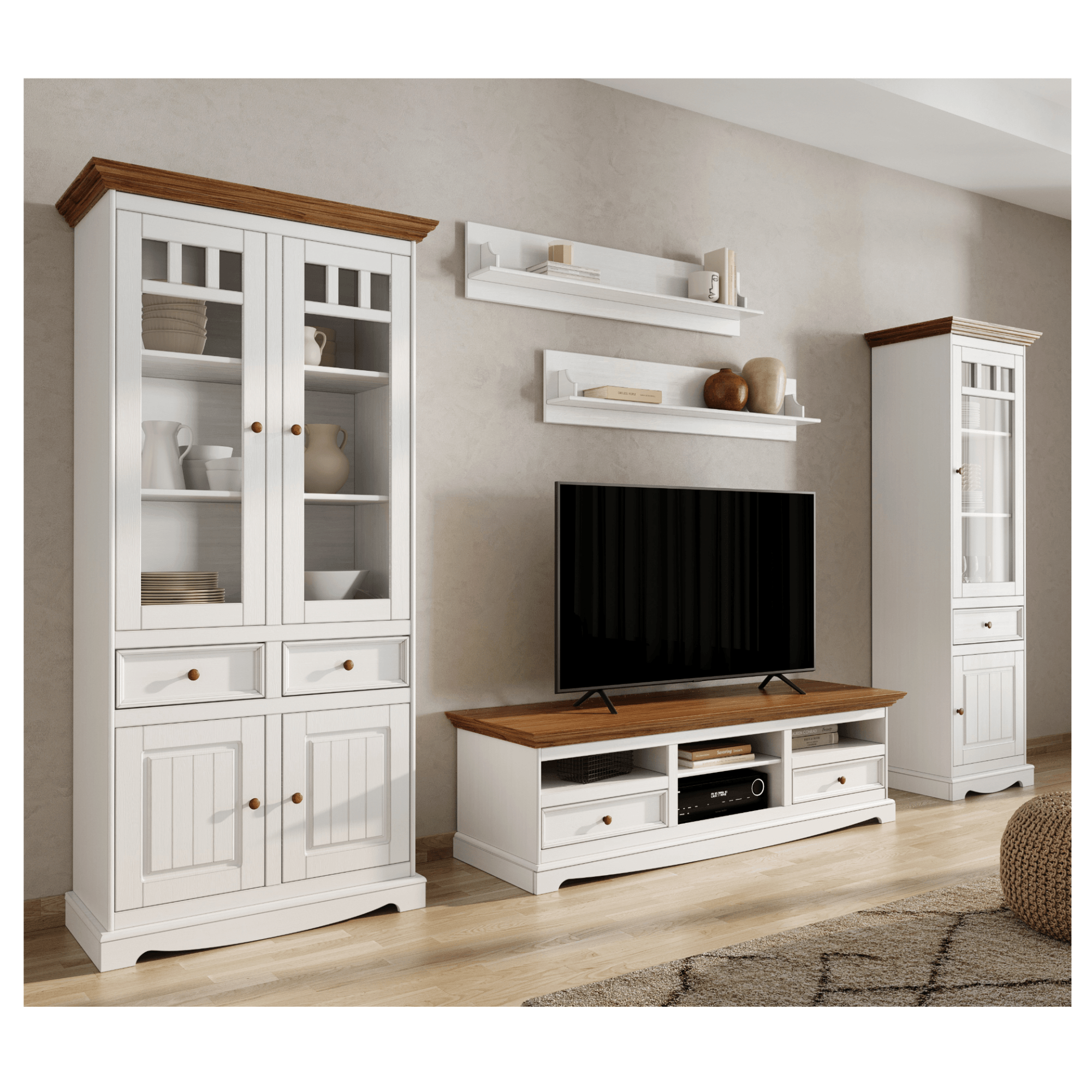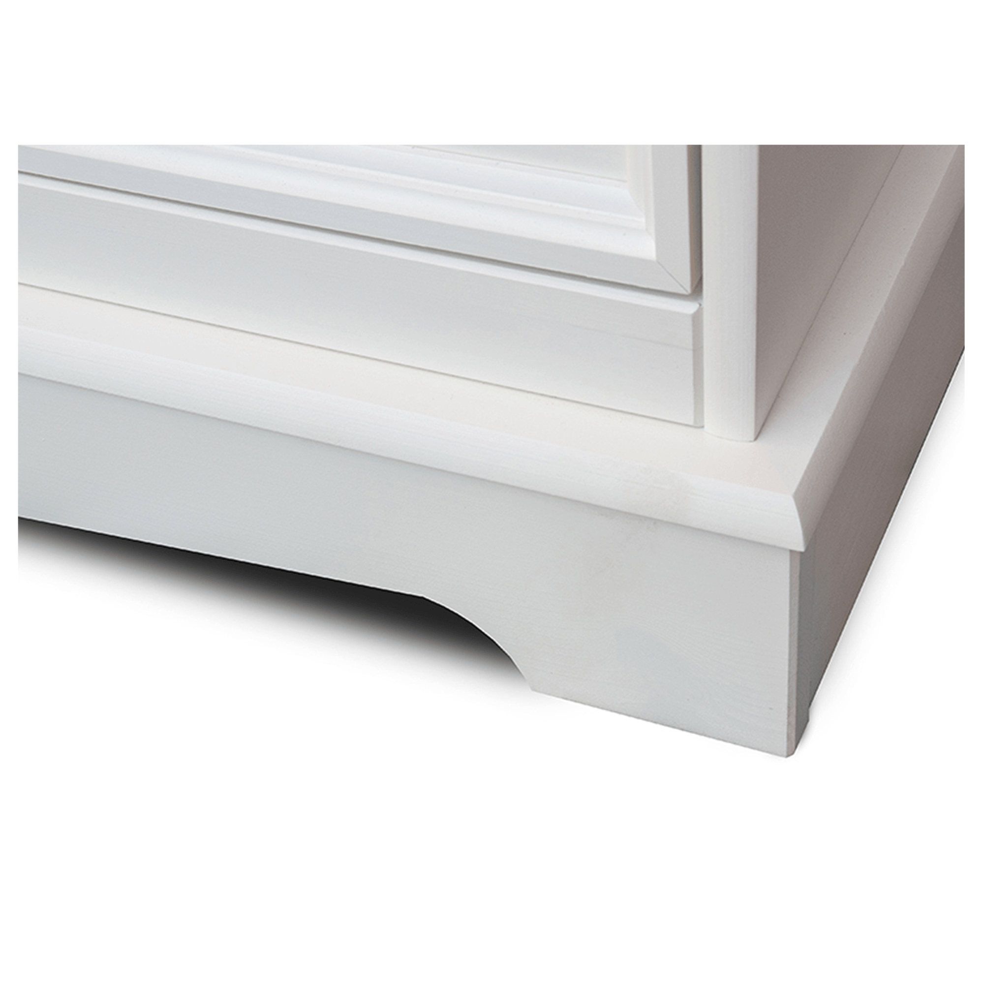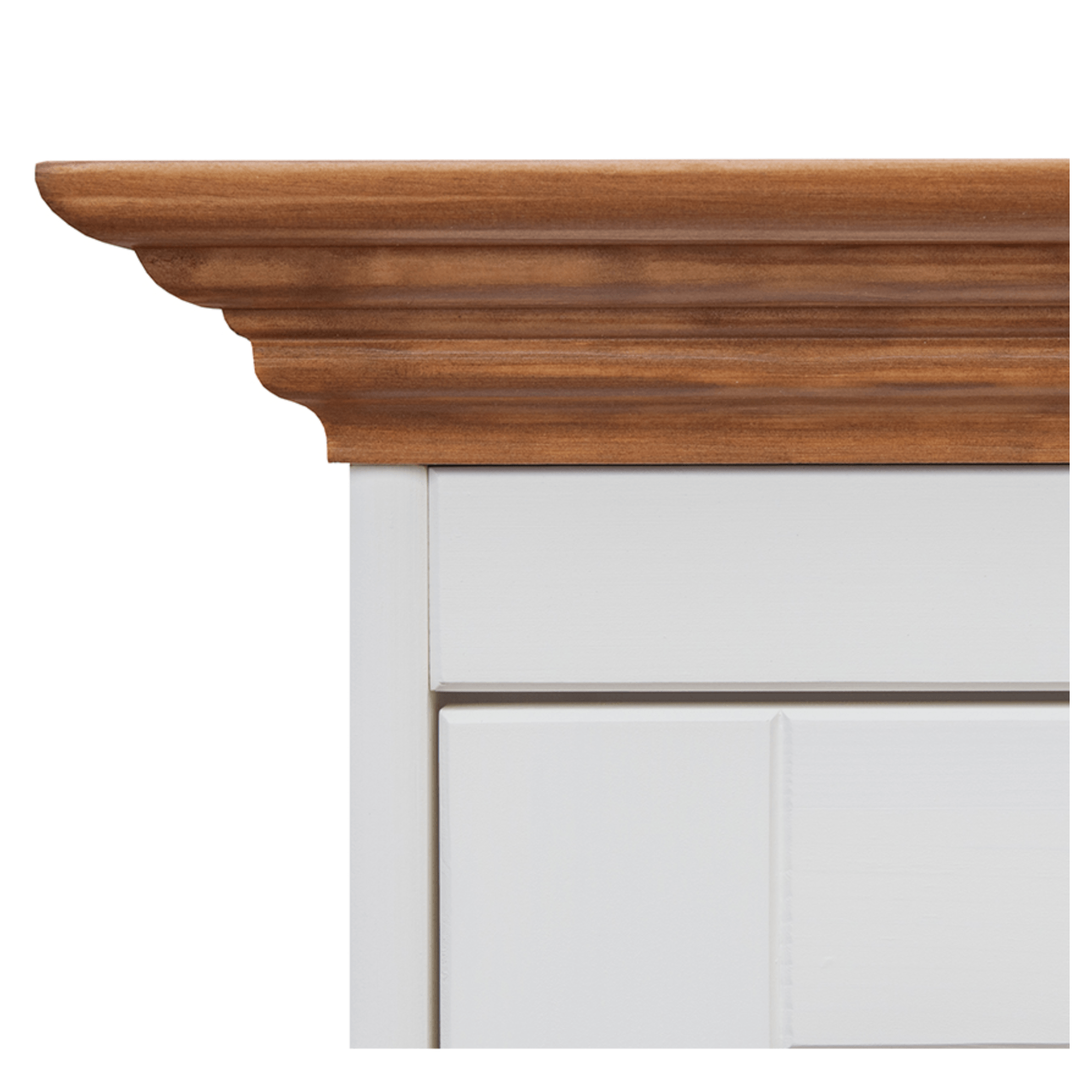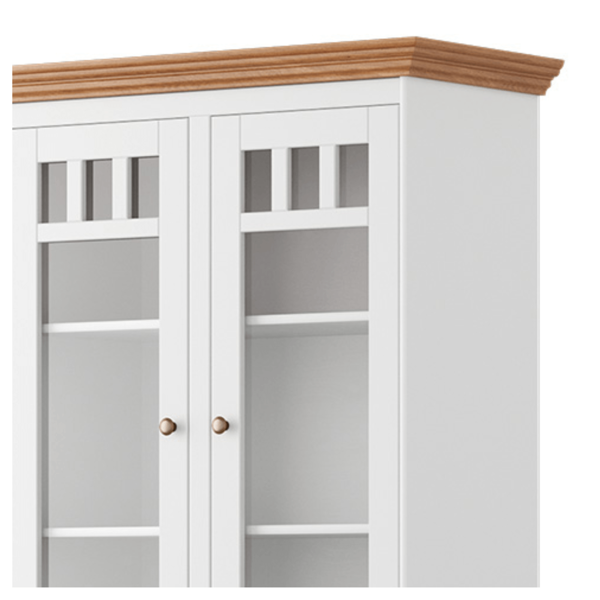 Vitrína BELLU 2D nabízí praktický, úložný prostor a také atraktivní vzhled, díky kterému zaujme na první pohled. Je vyhotovena z masivního dřeva finské borovice zaručujícího odolnost a dlouhou životnost. Pod bílou barvou nenápadně prosvítá přírodní kresba dřeva, která dělá z každého kusu nábytku originál. Romantický vzhled s nádechem venkova dotváří množství klasických zdobných prvků jako je dekorativní frézování, pilastr ve vrchní části a zajímavě tvarovaná podstava.