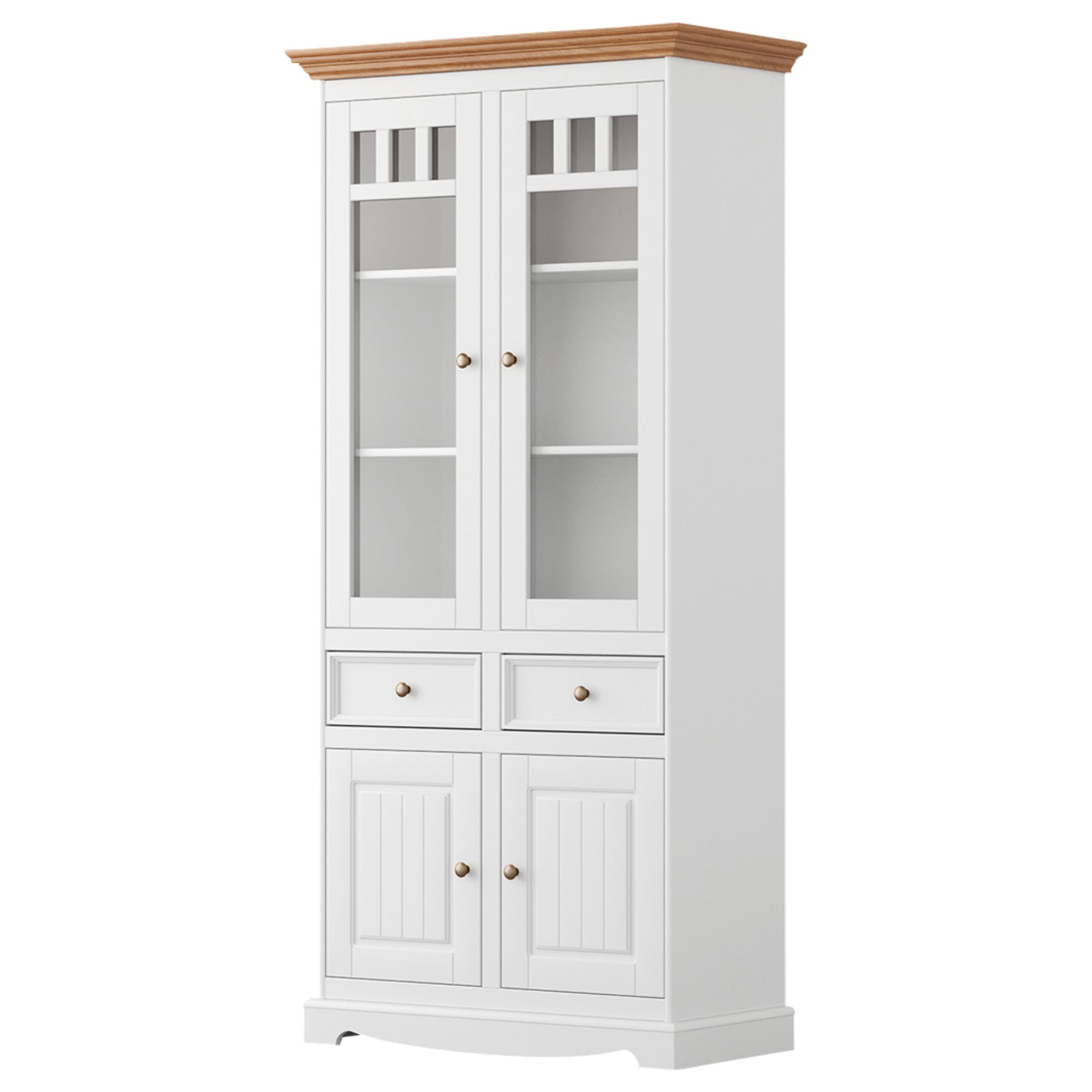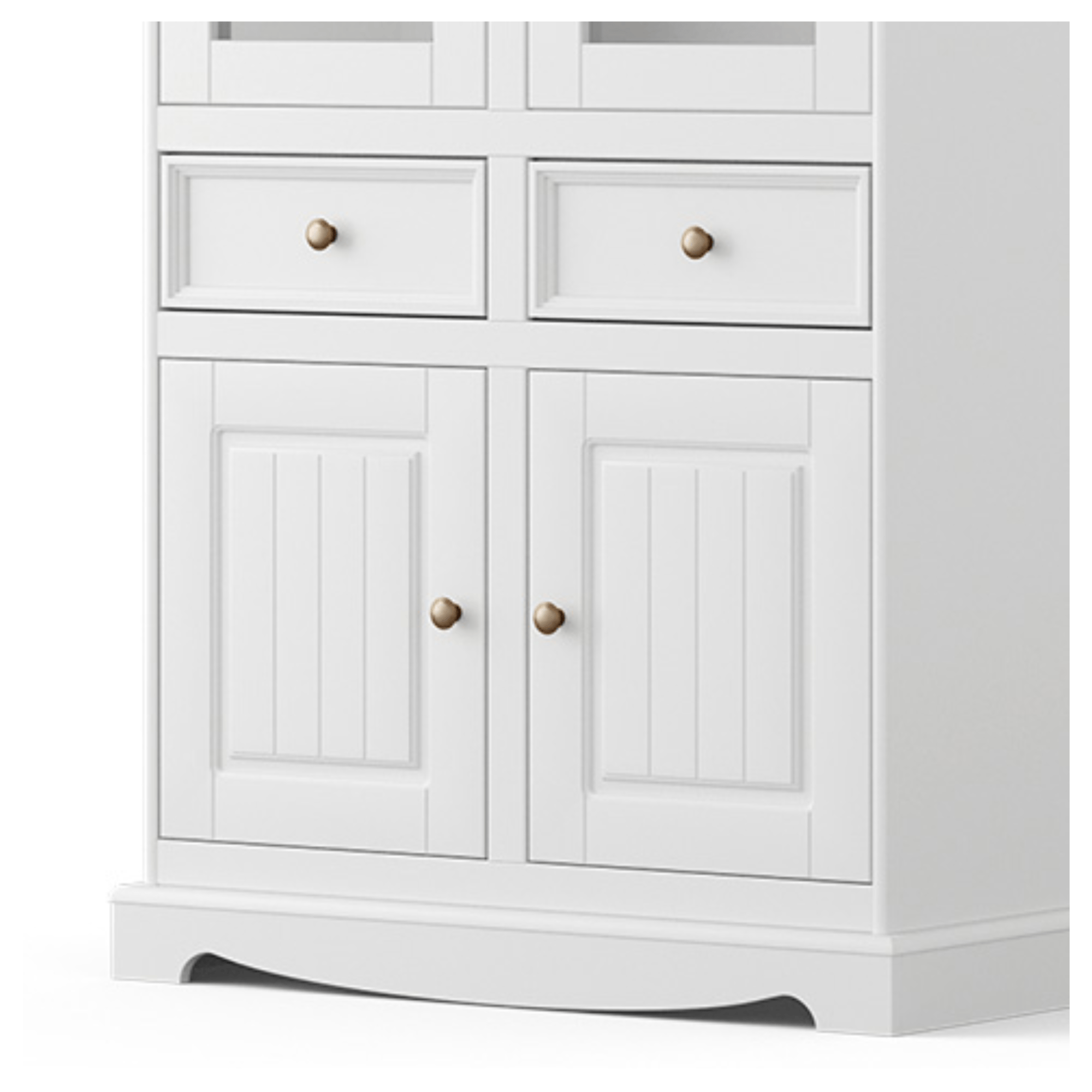 Vitrína je ideálním místem pro uložení předmětů, které chcete nechat skryté i těch, které chcete mít neustále na očích. Horní polovina obsahuje 2 otočné. prosklené dveře se 4 vloženými policemi, které jsou ideální pro vystavení vašich pokladů. Vystavené předměty budou chráněny před všudypřítomným prachem. Níže naleznete 2 praktické zásuvky s tichým dovíráním, díky kterým už nebudete muset složitě hledat různé drobnosti. Dvojice otočných dveří ve spodní části uzavírá vnitřní prostor se 2 vloženými policemi. Všechny přední plochy jsou doplněny o kovové, kulaté úchyty ve starožitné, zlaté barvě.