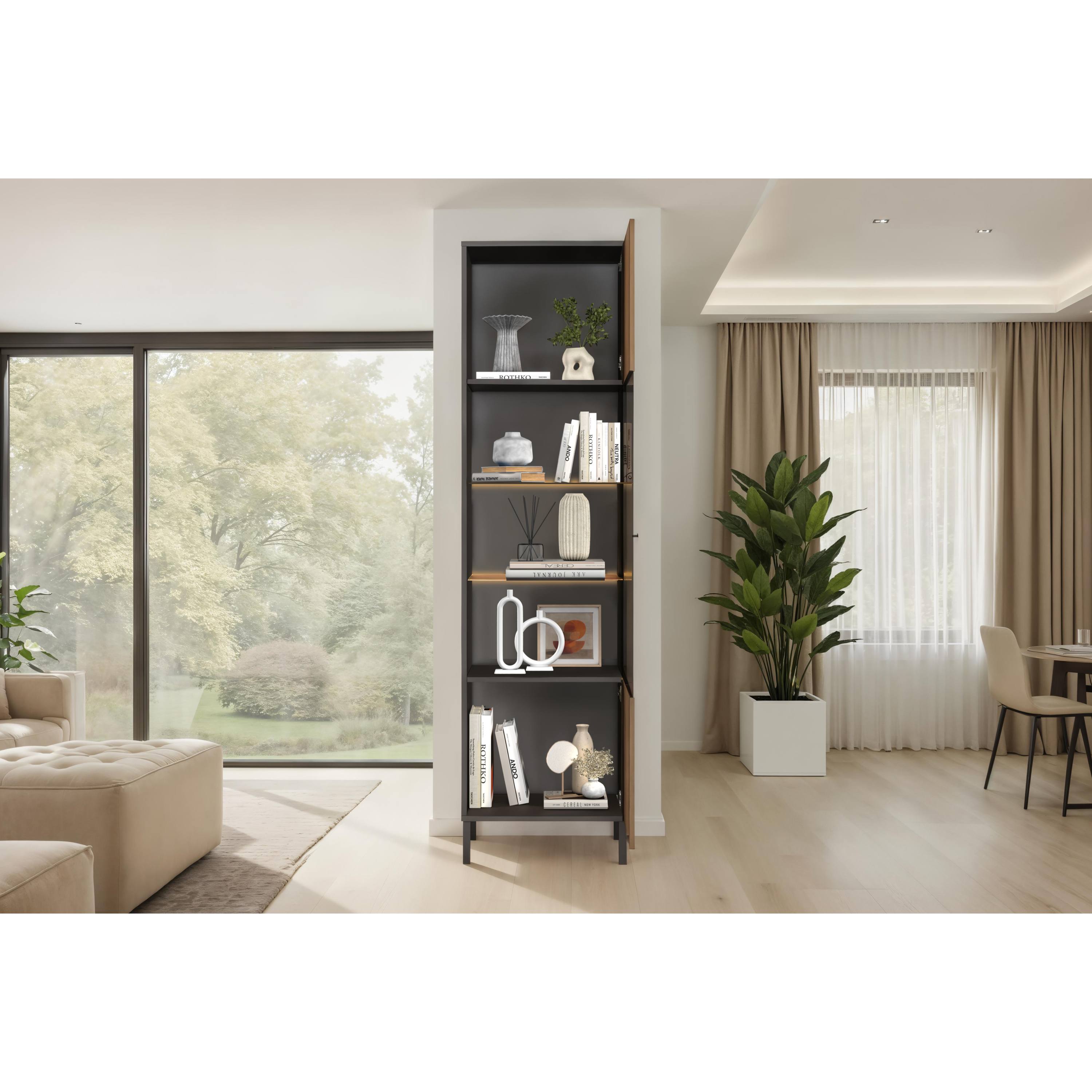 Za částečně prosklenými dvířky vitríny CORTINA se nacházejí 4 vložené police, které napomohou k přehlednému uložení vašich věcí. LED osvětlení je součástí balení.