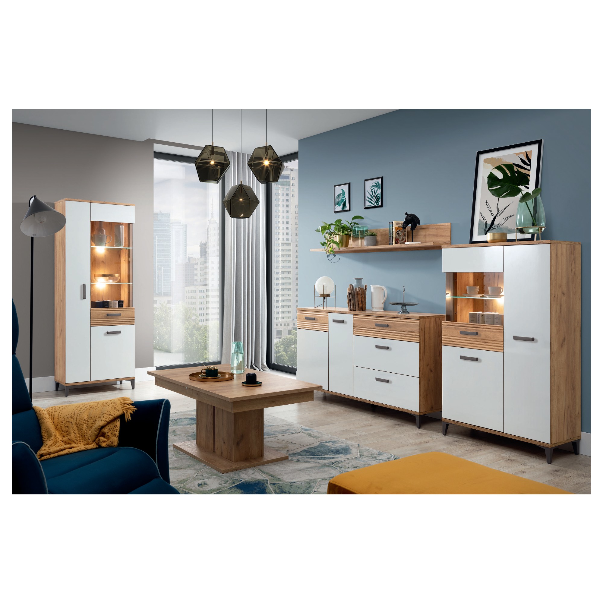 Vitrína DARCY SB7 stavěná ve skandinávském stylu vám poskytne funkční prostor pro uložení všeho potřebného, ale zároveň se stane ozdobou vašeho interiéru. Dokonalé spojení přírodního dekoru zlatého řemeslného dubu a alpské bílé vytvoří ve vašem obývacím pokoji reprezentativní vzhled.