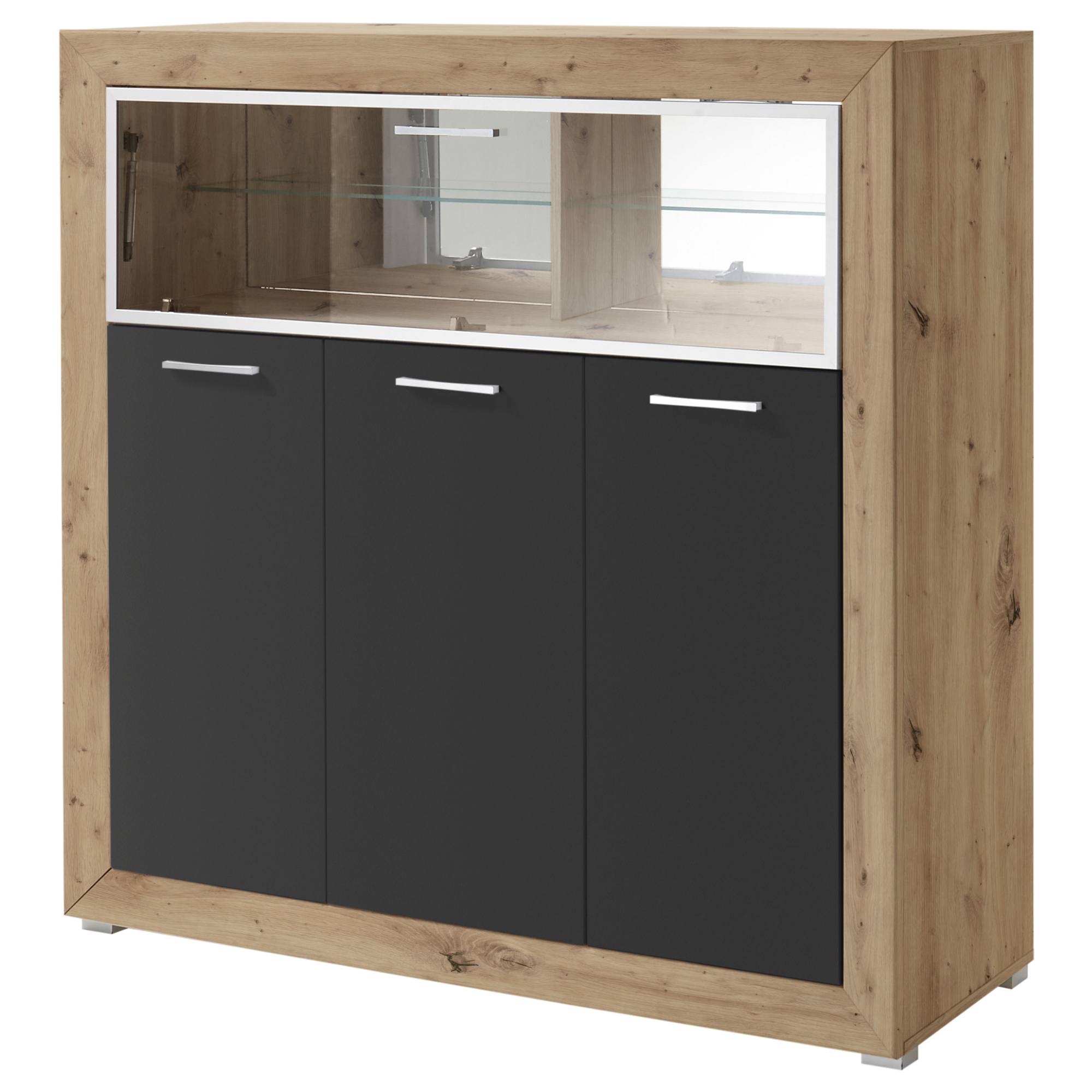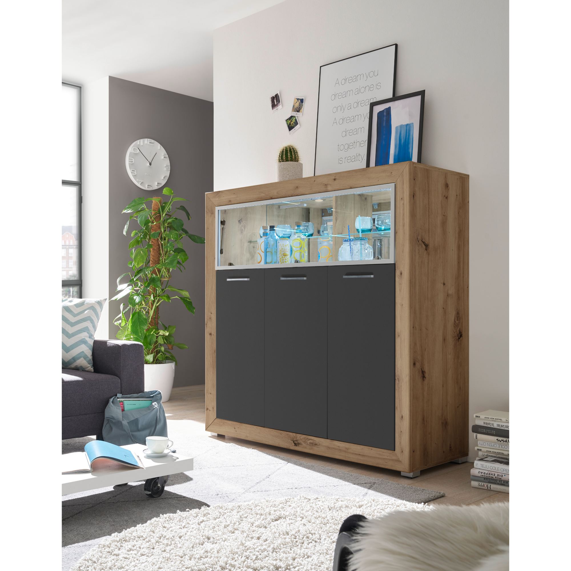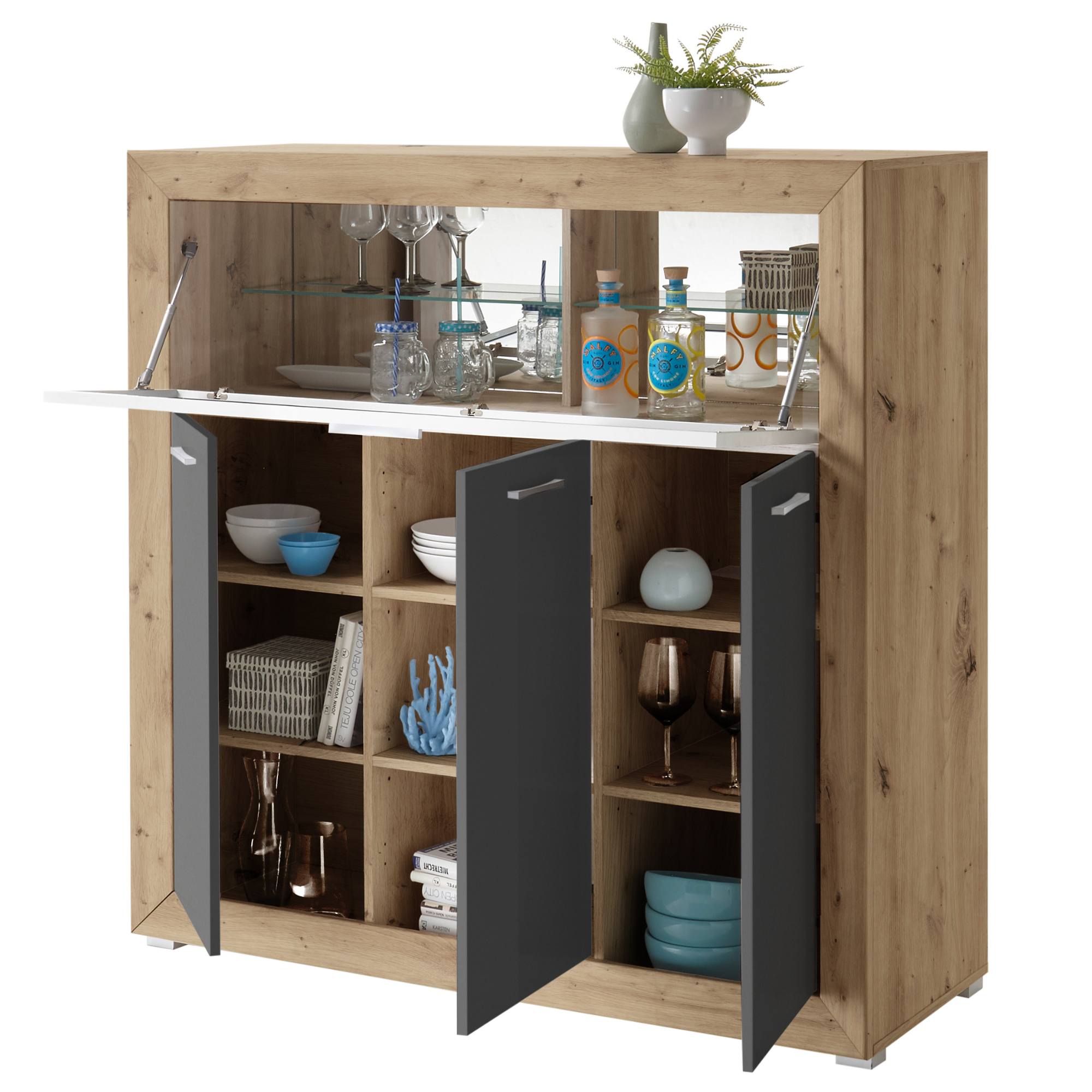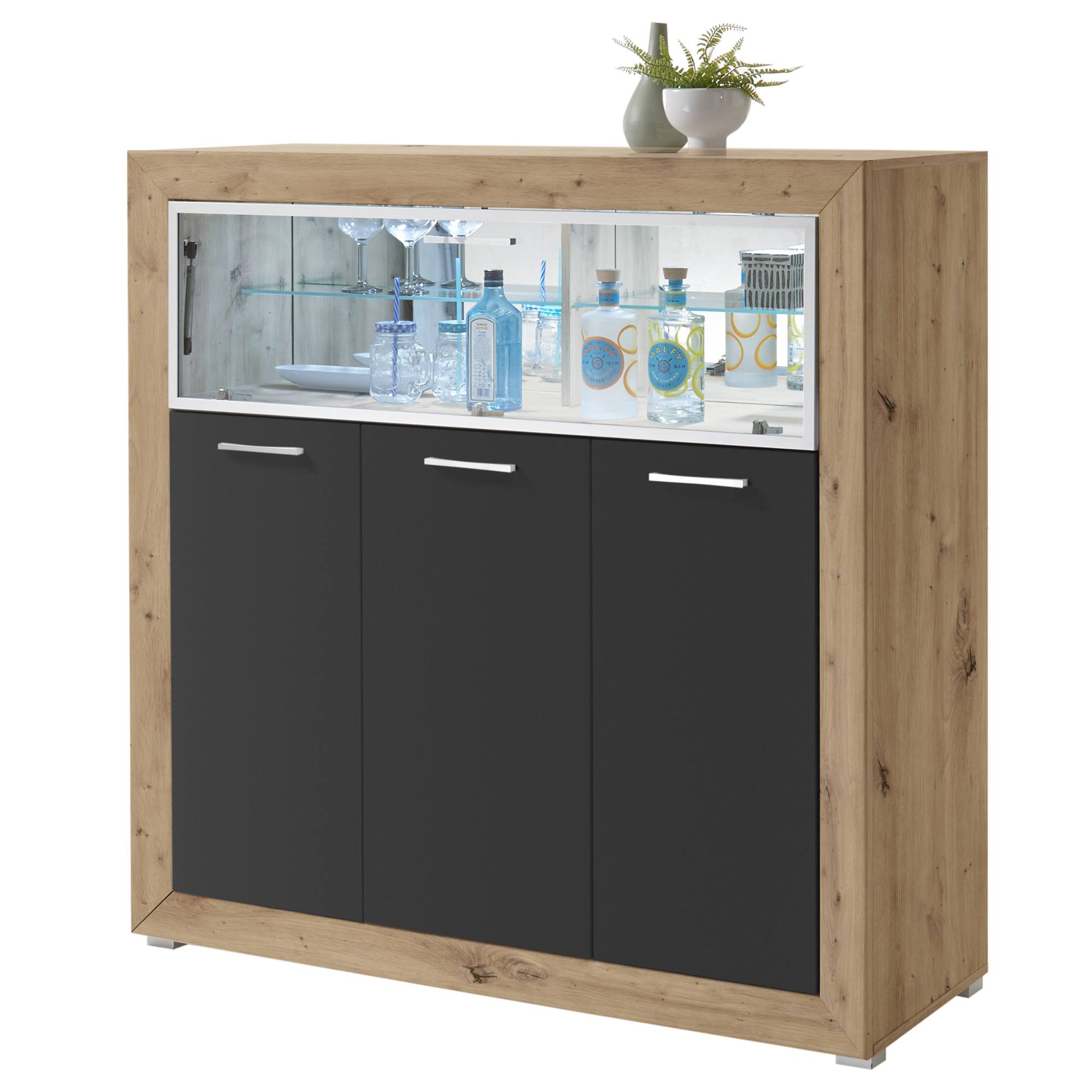 Spojení přírodního dekoru s barevnou přední částí působí moderním dojmem. Tato kombinace je zakomponována do prvotřídního designu konstrukce, který si vás získá na první pohled. K vystavení vašeho drahého alkoholu, sklenic či různých dekorací využijete skleněné police s podsvícením, které se nacházejí za prosklenými výklopnými dvířky. Spodní část je rozdělena do tří úložných prostorů s dvířkami, každý z nich obsahuje vždy dvě vložené police. Namontované stylové úchytky vám usnadní celkovou manipulaci. Vše, co potřebujete tak budete mít vždy po ruce.