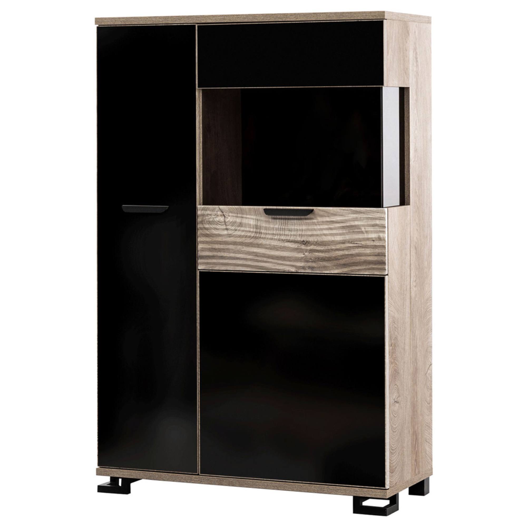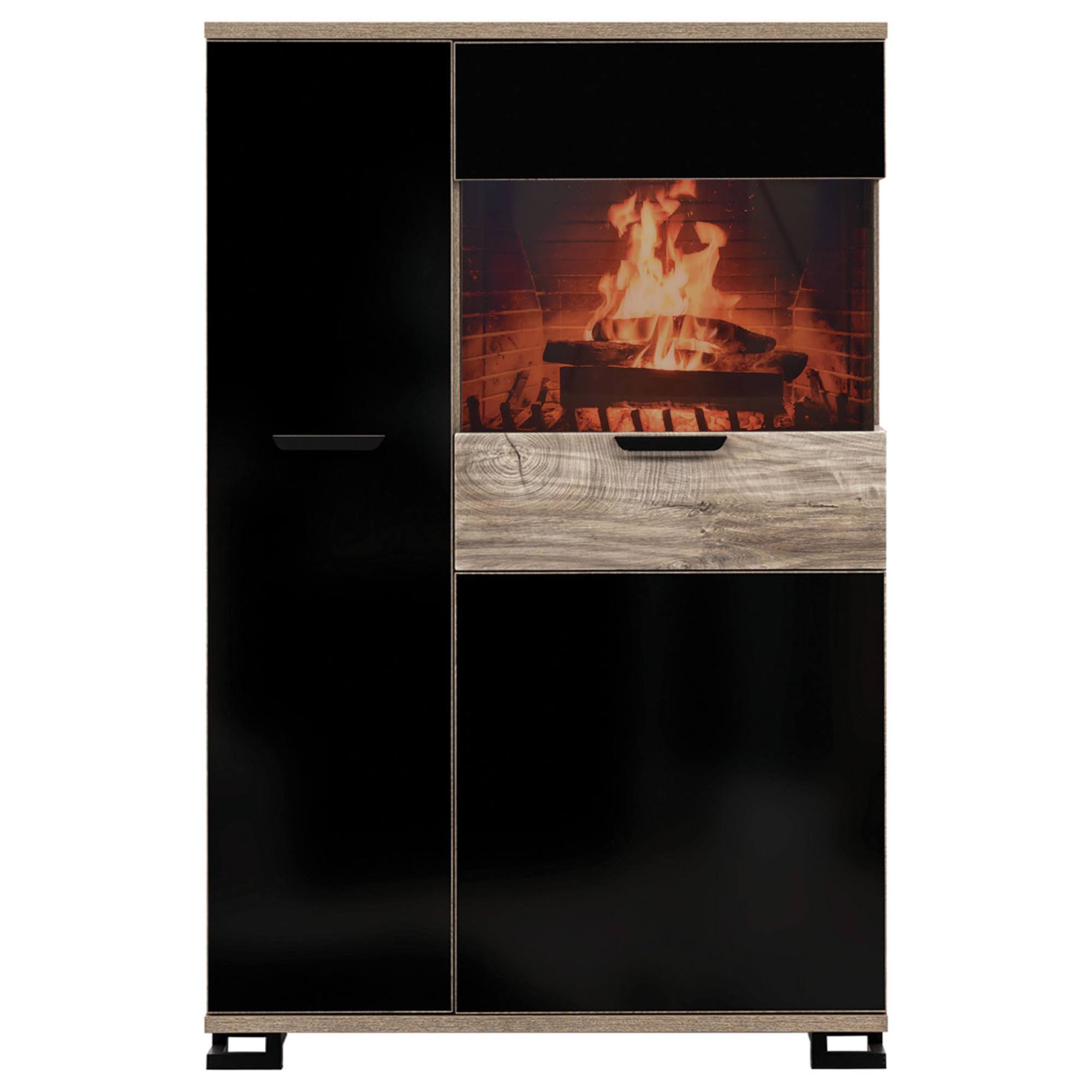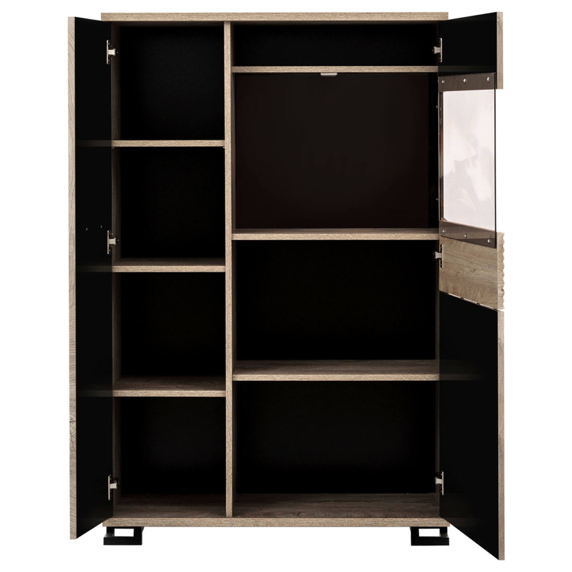 Kombinace přírodního dekoru dubu s lesklými prvky v odstínu černé barvy vytváří útulnou atmosféru. Obdržíte bohatý úložný prostor v podobě dvou dvířek s vnitřními policemi, do kterých umístíte vše potřebné. Do prosklené části je možné dodatečně dokoupit LED osvětlení nebo LED panel, který imituje reálný krb. Manipulaci usnadní decentní plastové úchytky. Veškeré dekorace tak budete mít vždy na očích. Celou konstrukci podepírají stylové nožky. Povrch vitríny se vám bude snadno udržovat.
