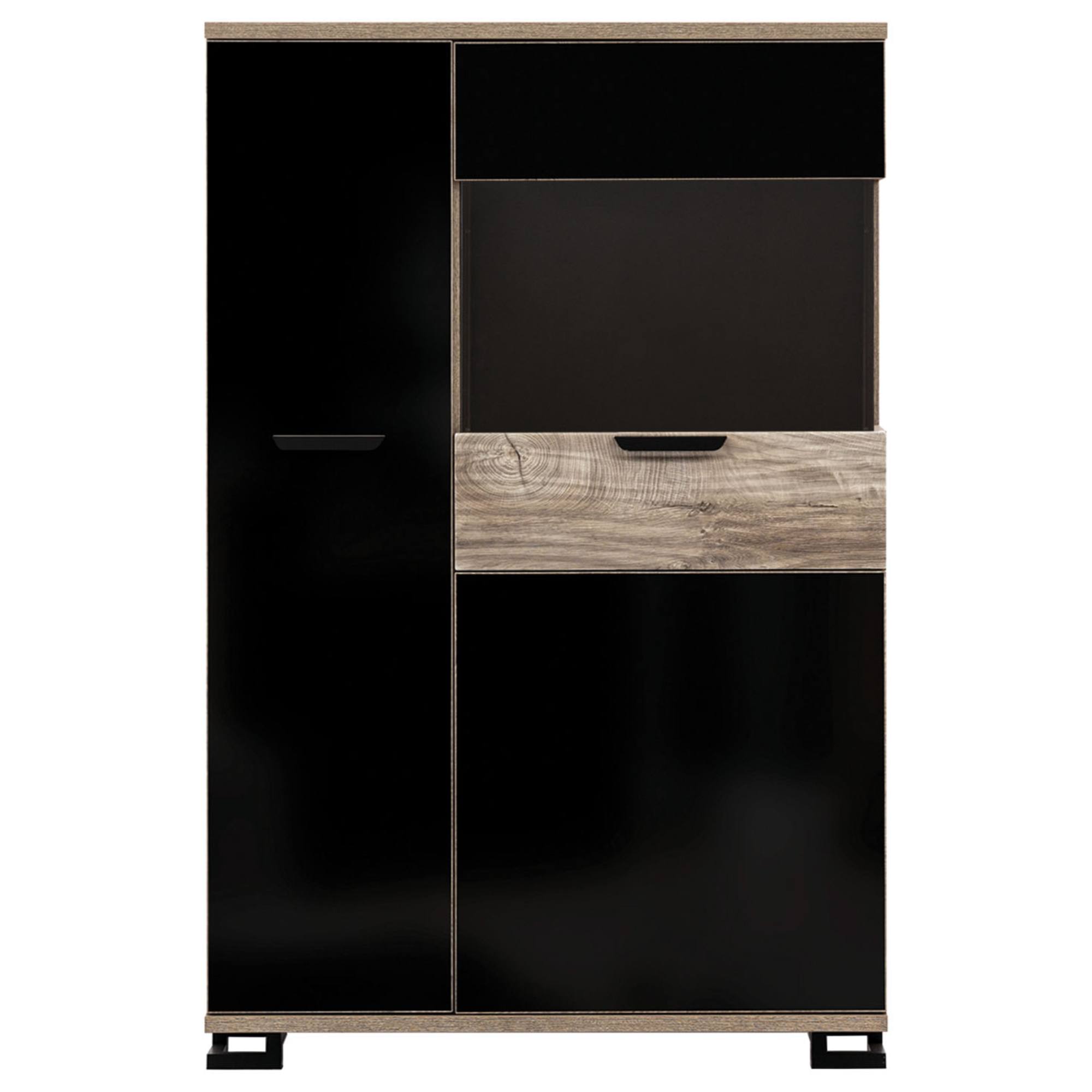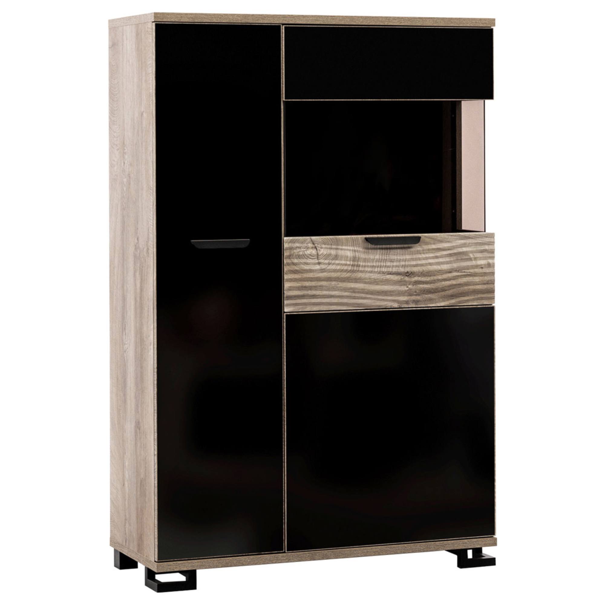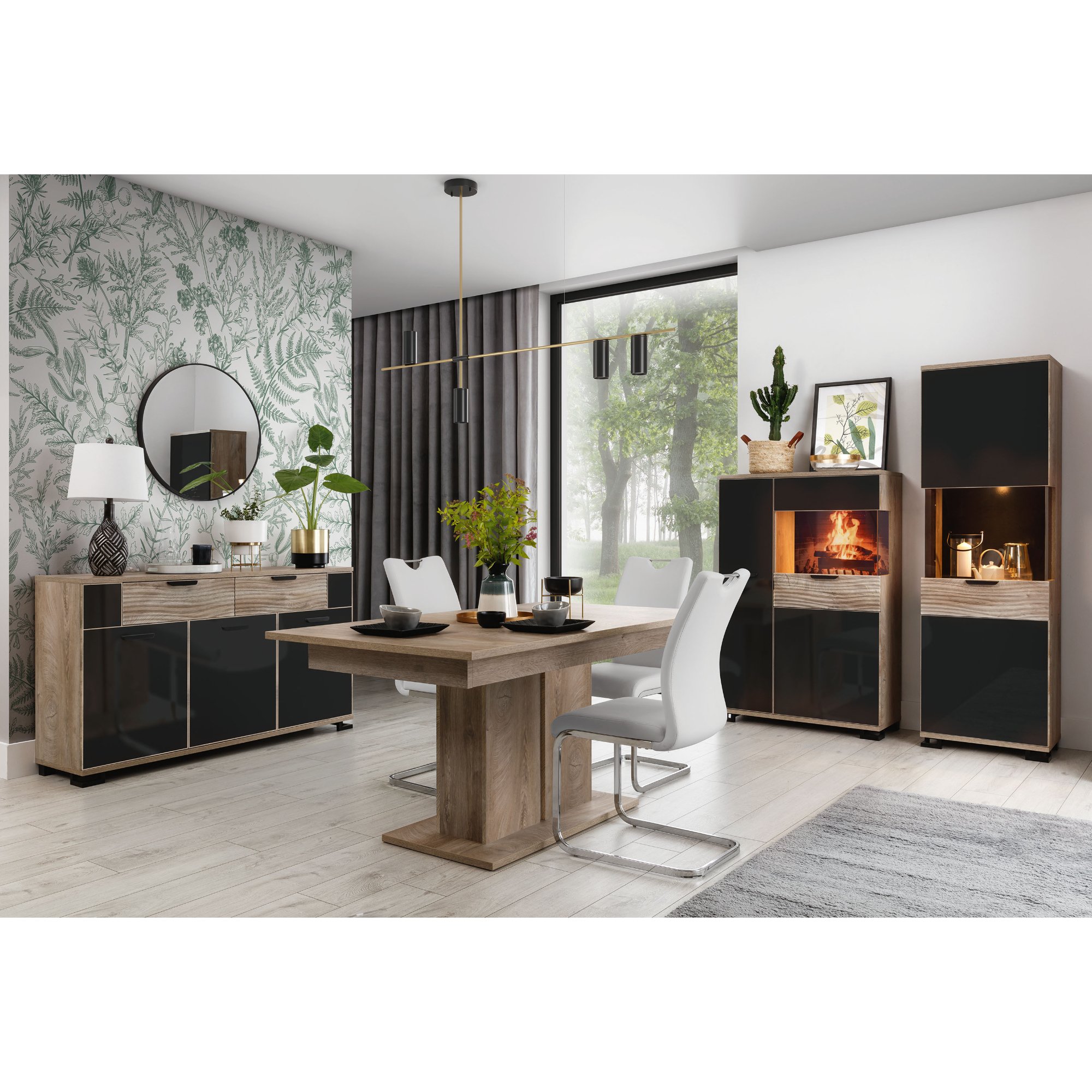 Kombinace přírodního dekoru dubu s lesklými prvky v odstínu černé barvy vytváří útulnou atmosféru. Obdržíte bohatý úložný prostor v podobě dvou dvířek s vnitřními policemi, do kterých umístíte vše potřebné. Do prosklené části je možné dodatečně dokoupit LED osvětlení nebo LED panel, který imituje reálný krb. Manipulaci usnadní decentní plastové úchytky. Veškeré dekorace tak budete mít vždy na očích. Celou konstrukci podepírají stylové nožky. Povrch vitríny se vám bude snadno udržovat.