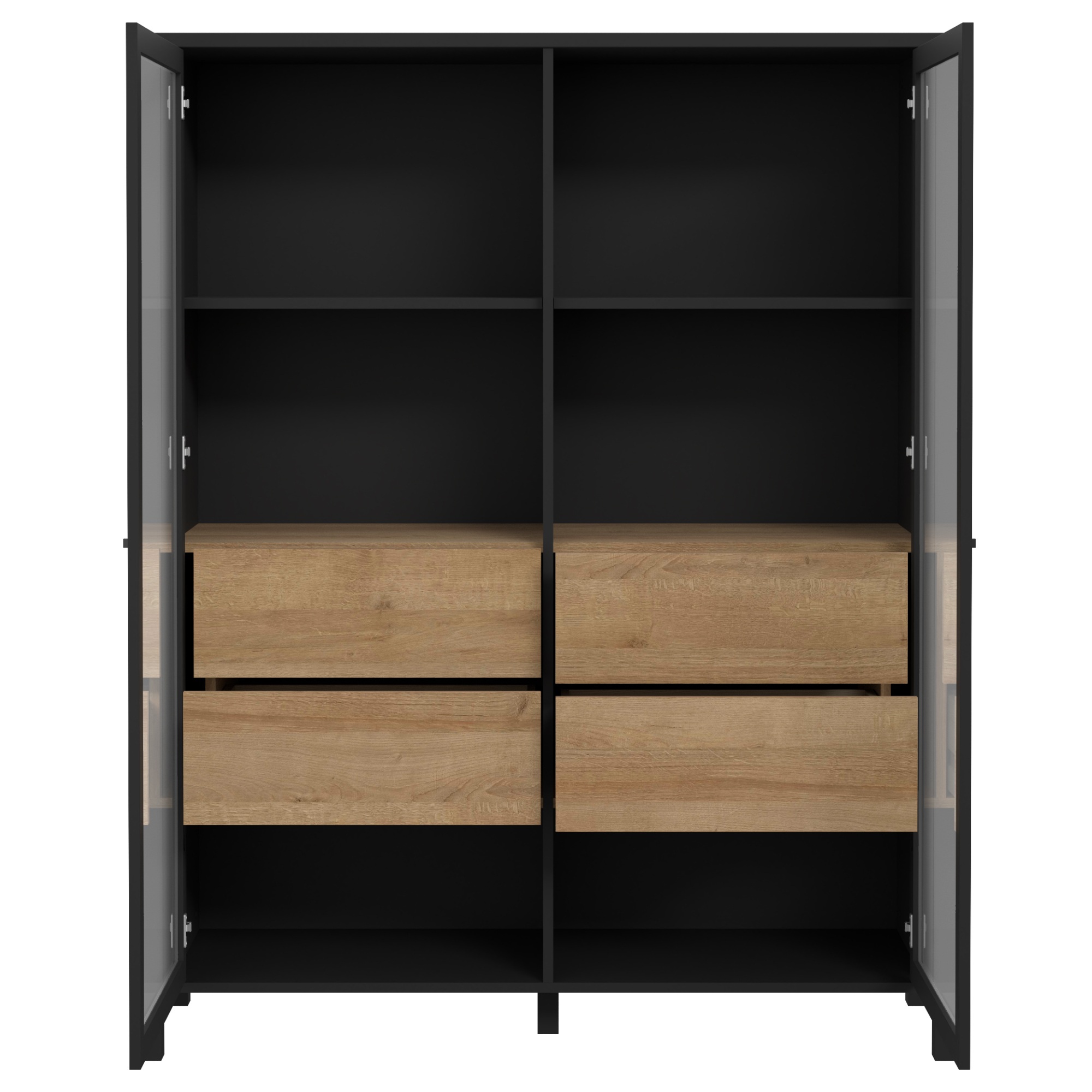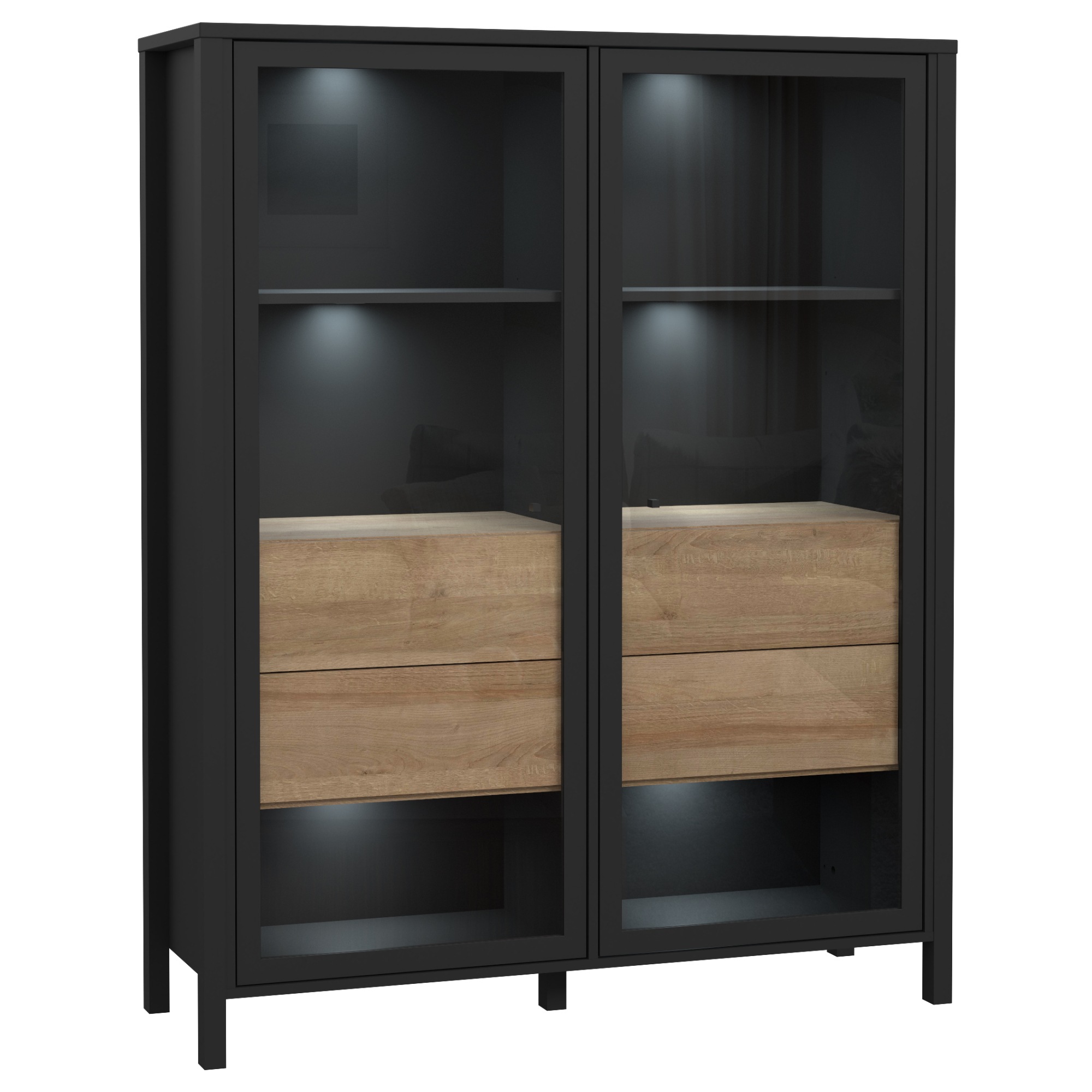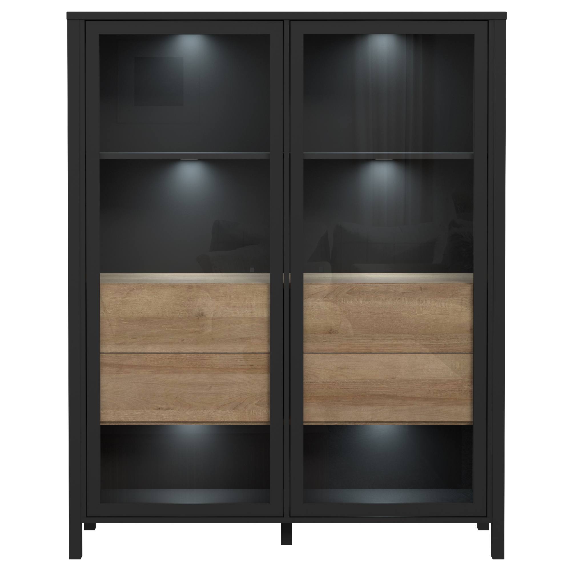 Naleznete zde místo pro vše potřebné, ať už se jedná o vystavení dekorací či odložení předmětů, které nechcete mít na očích. Vitrína disponuje prosklenými dvířky se dvěma vloženými policemi a čtyřmi zásuvkami. Decentní kovové úchytky vám usnadní celkovou manipulaci. ABS hrany navíc zvyšují odolnost celého korpusu, který se vám bude zároveň jednoduše udržovat. Vitrínu lze dodatečně vybavit LED osvětlením, není tedy součástí balení.