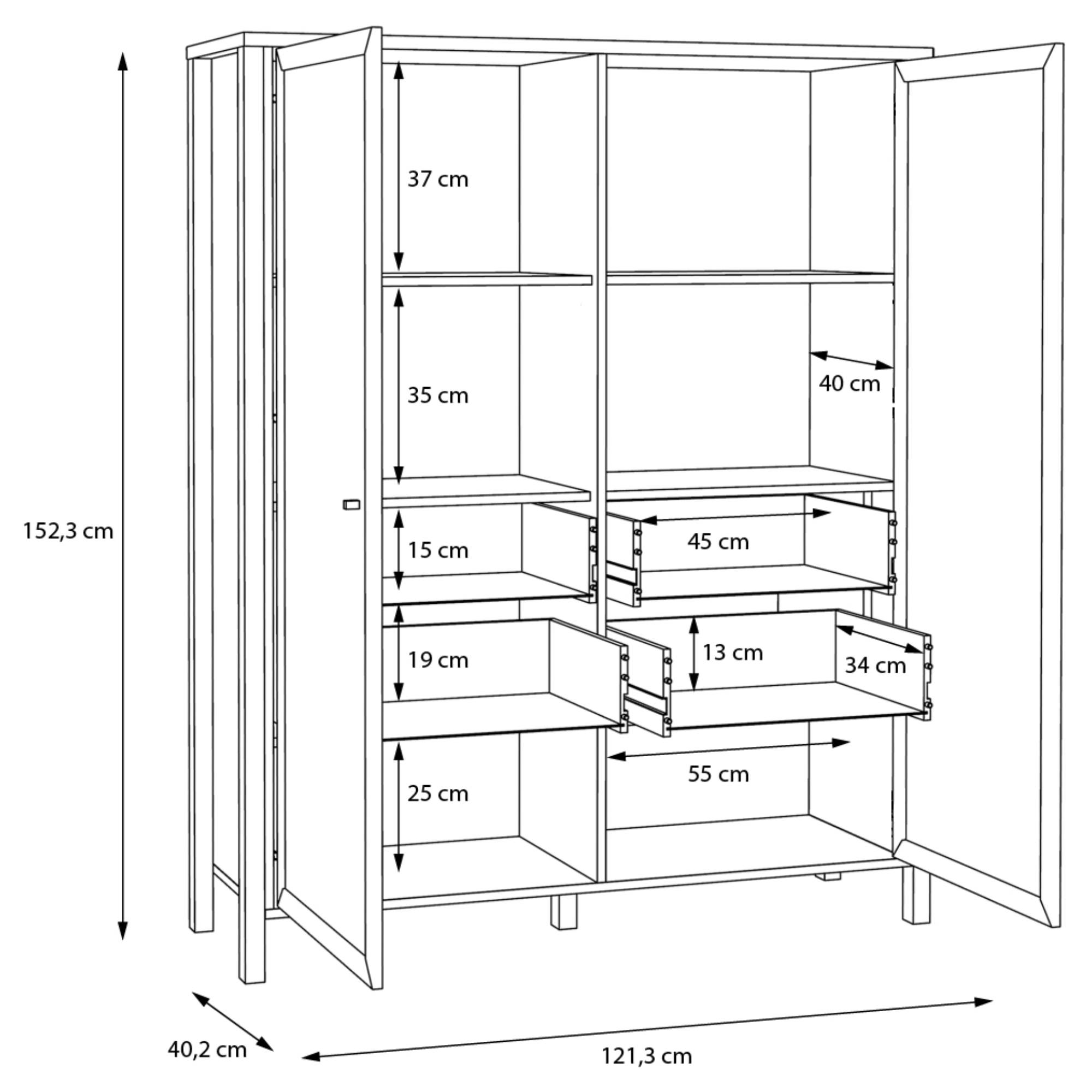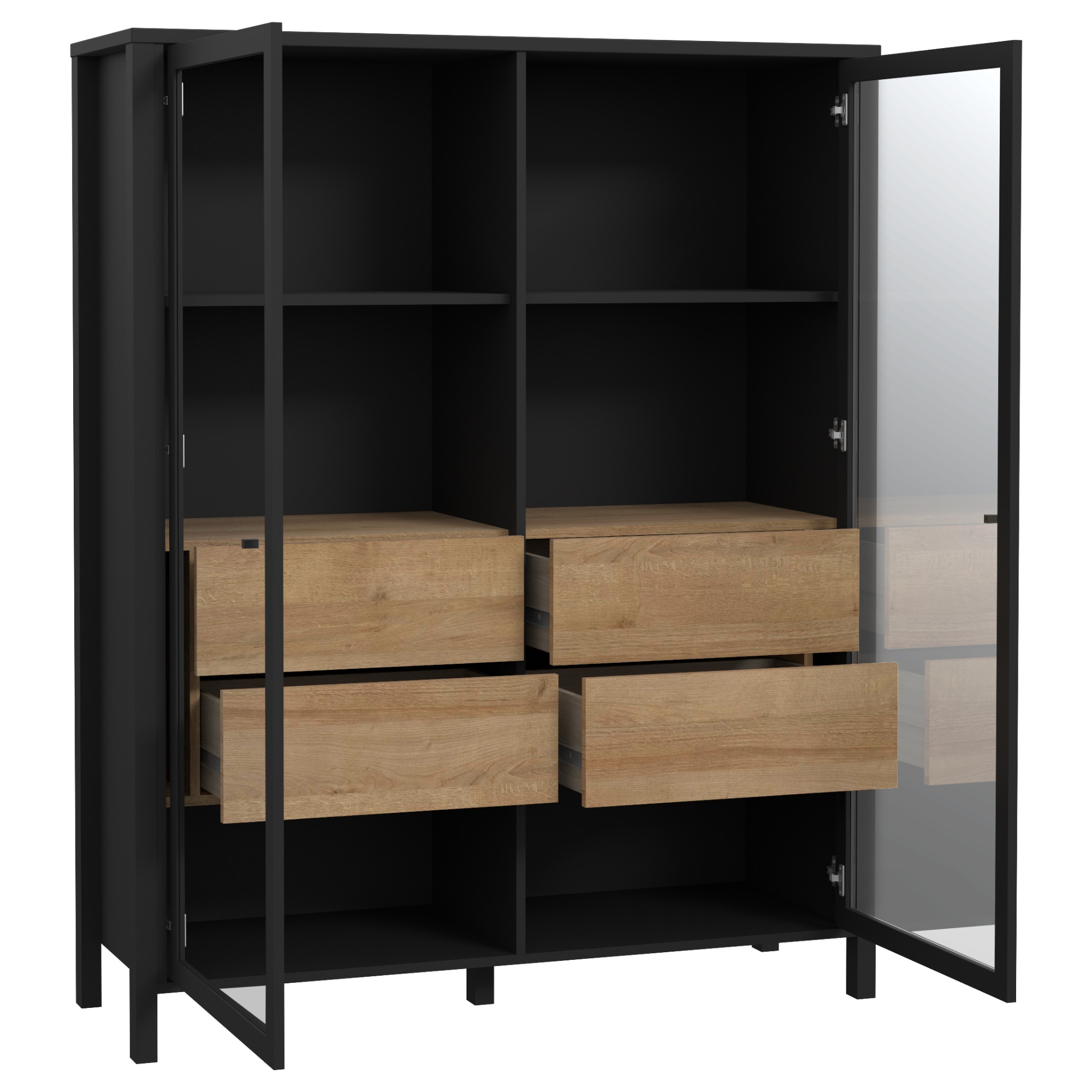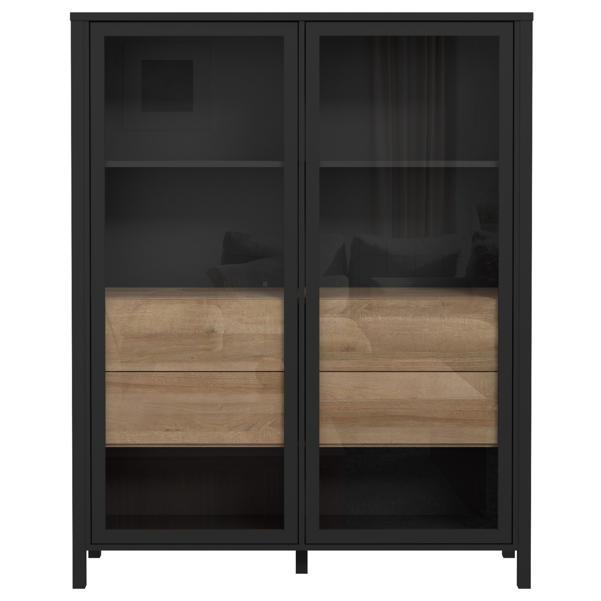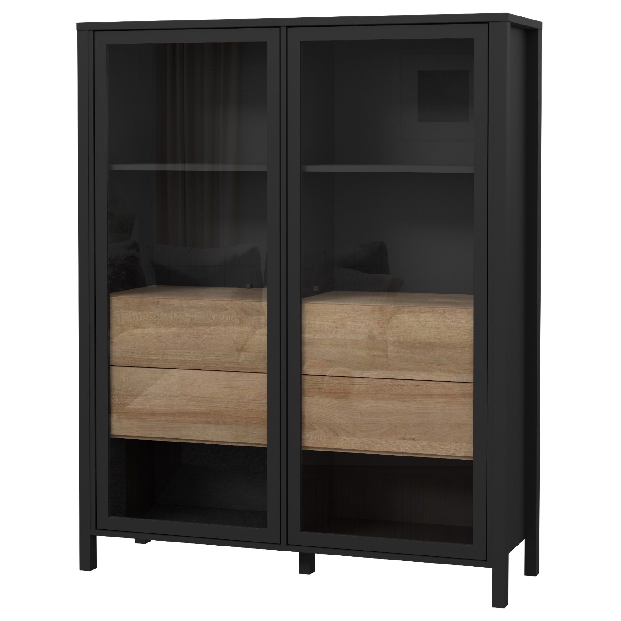 Naleznete zde místo pro vše potřebné, ať už se jedná o vystavení dekorací či odložení předmětů, které nechcete mít na očích. Vitrína disponuje prosklenými dvířky se dvěma vloženými policemi a čtyřmi zásuvkami. Decentní kovové úchytky vám usnadní celkovou manipulaci. ABS hrany navíc zvyšují odolnost celého korpusu, který se vám bude zároveň jednoduše udržovat. Vitrínu lze dodatečně vybavit LED osvětlením, není tedy součástí balení.