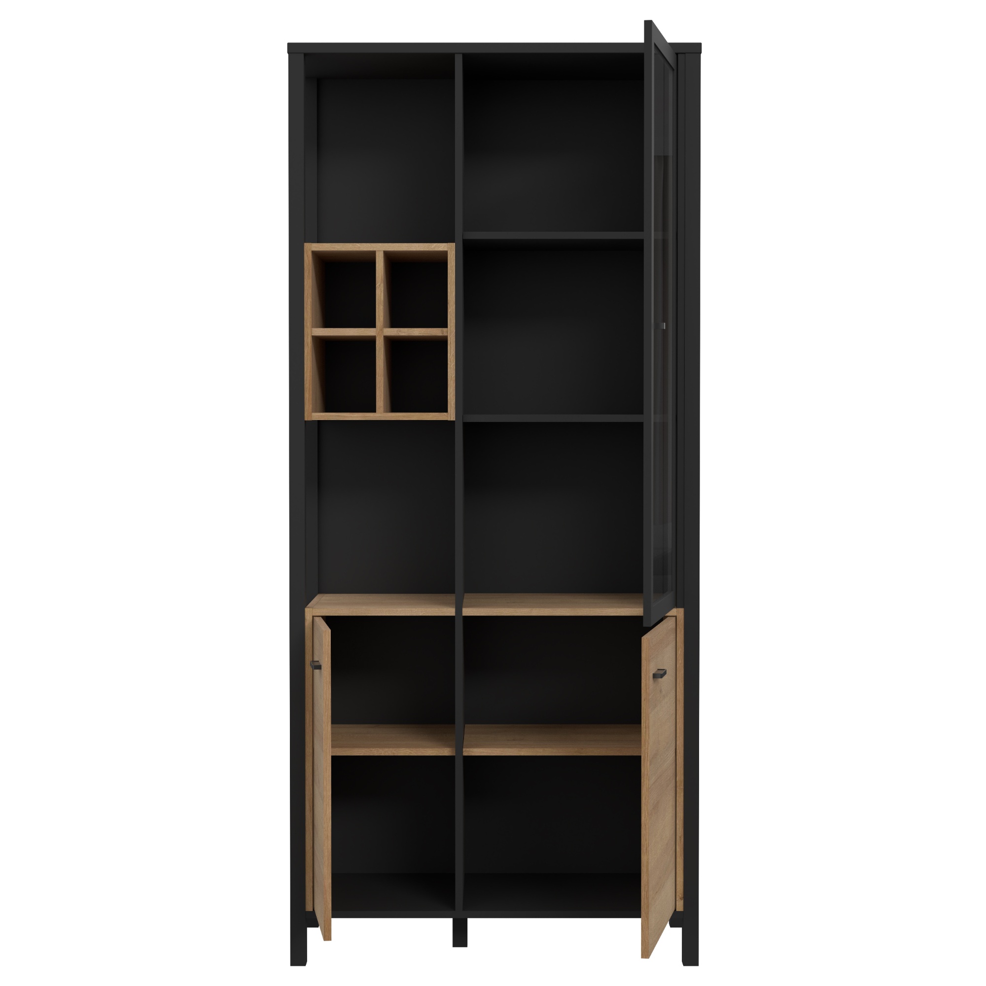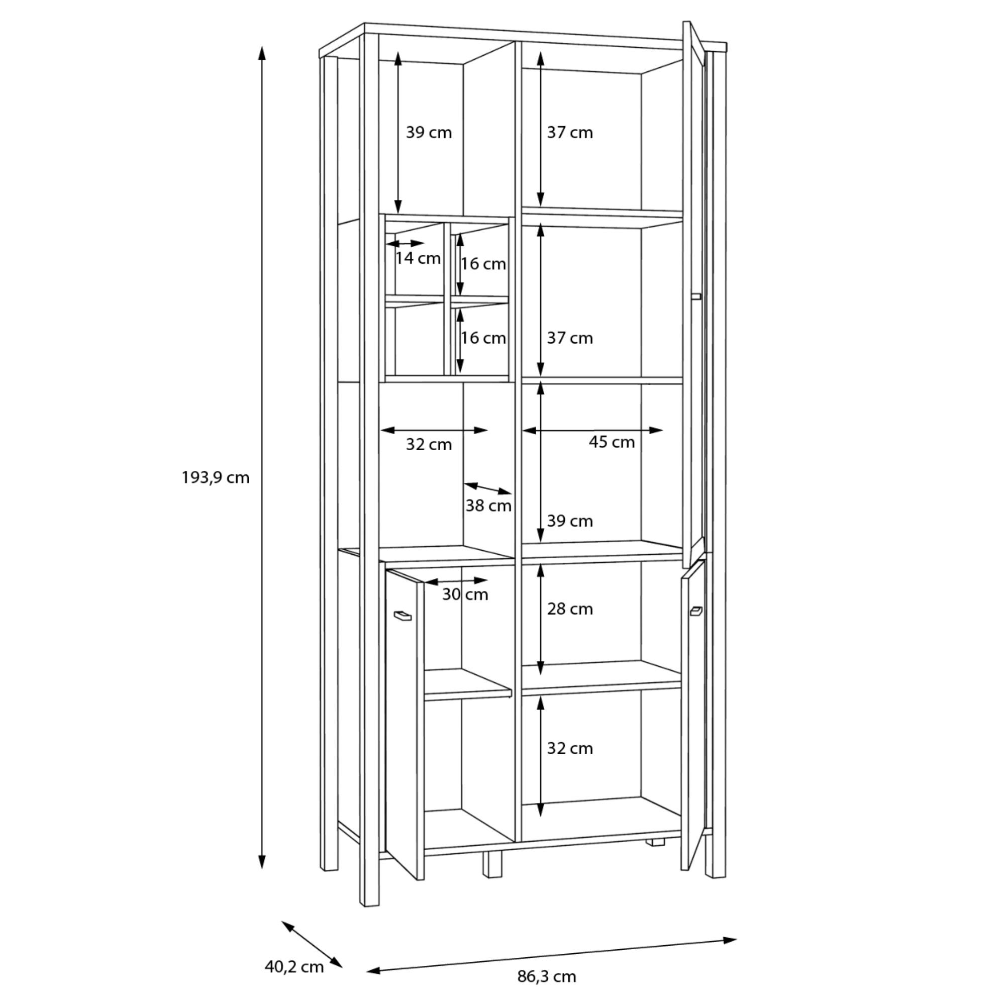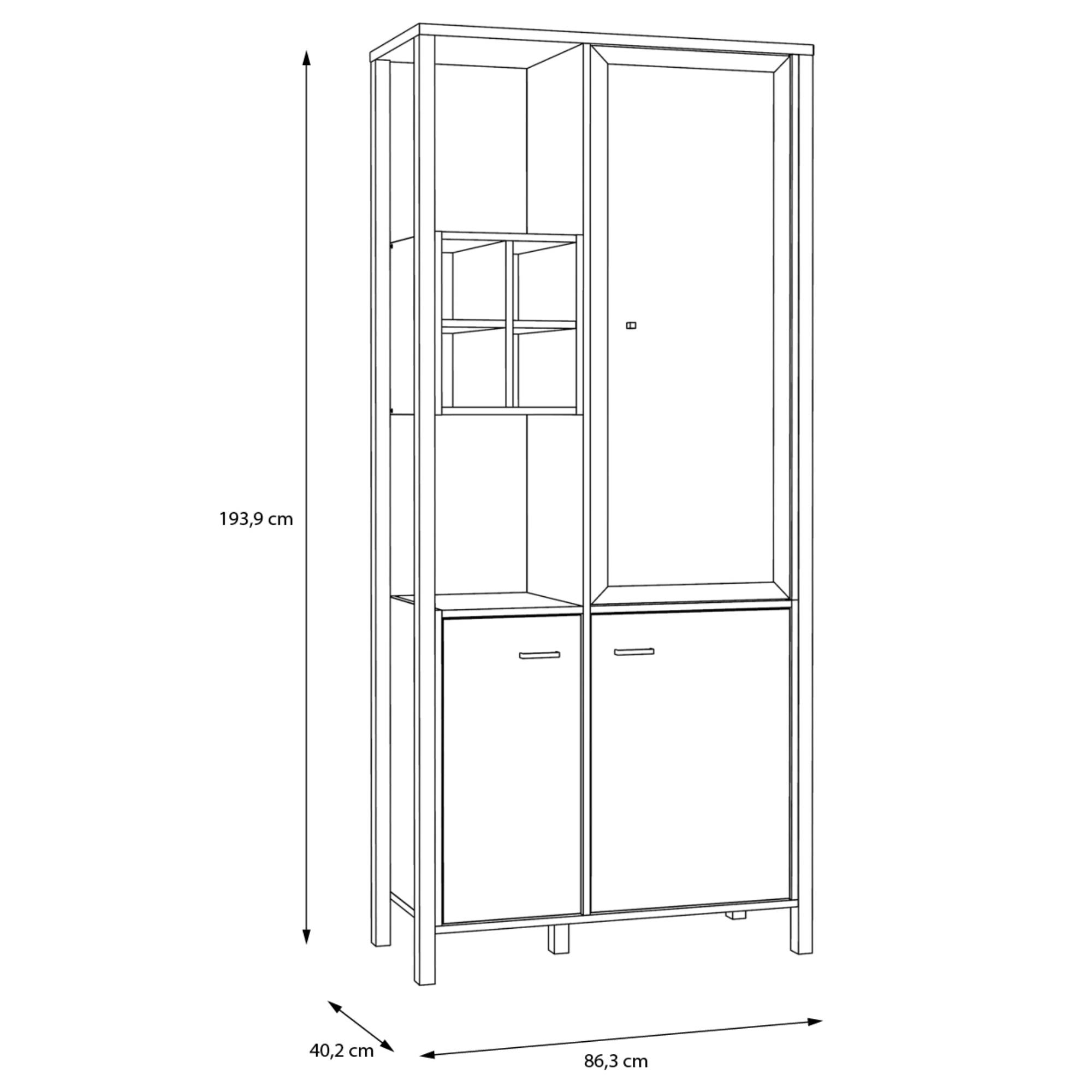 Naleznete zde místo pro vše potřebné, ať už se jedná o vystavení dekorací či odložení předmětů, které nechcete mít na očích. Vitrína disponuje plnými a prosklenými dvířky se čtyřmi vloženými policemi. Decentní kovové úchytky vám usnadní celkovou manipulaci. ABS hrany navíc zvyšují odolnost celého korpusu, který se vám bude zároveň jednoduše udržovat. Vitrínu lze dodatečně vybavit LED osvětlením, není tedy součástí balení.