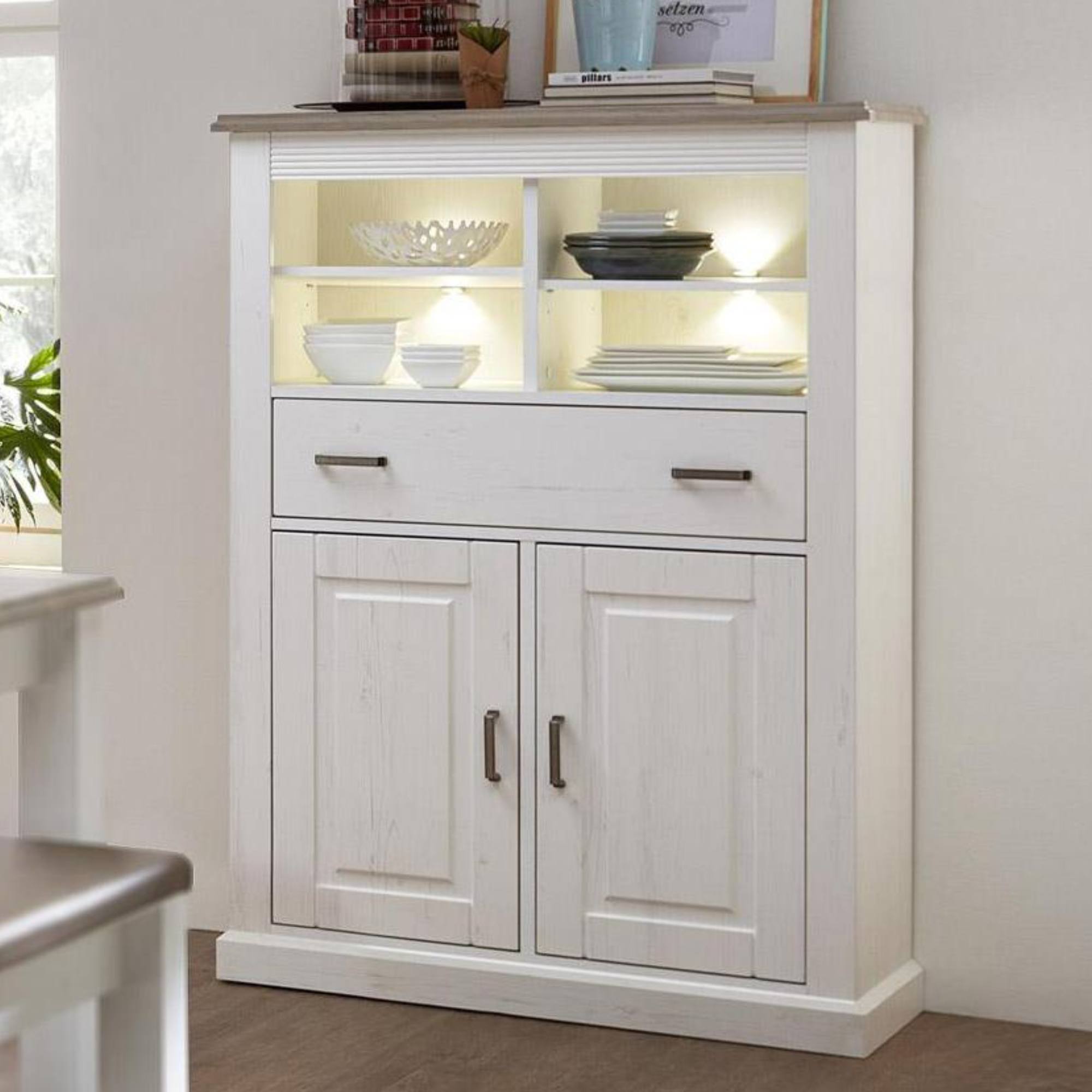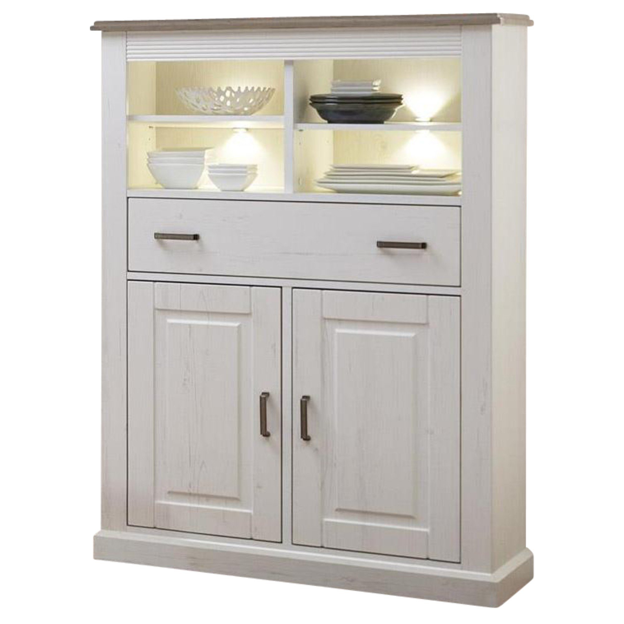 Elegantní vitrína LIMA inspirovaná provence stylem, která zaujme barevnou kombinací dřevěného dekoru pinie a bílé. Úložný prostor je prakticky rozdělen do čtyř polic a jedné prostřední zásuvky. Vystavené předměty v otevřené části vám zvýrazní dodávané LED osvětlení. Zásuvka a dvířka jsou opatřena systémem tichého dovírání SOFT CLOSE. Horní pilastr a kovové úchyty dotváří celkový vzhled. Element je dodáván částečně smontovaný.