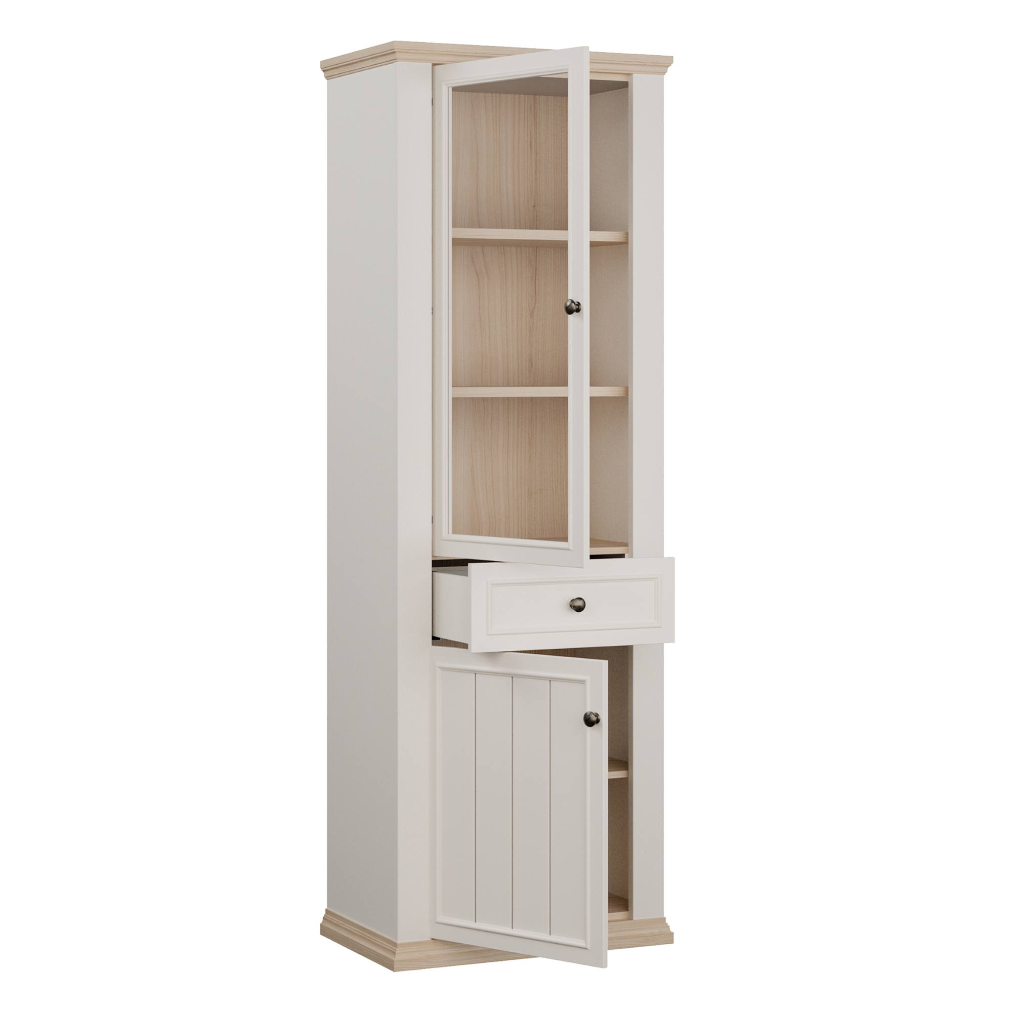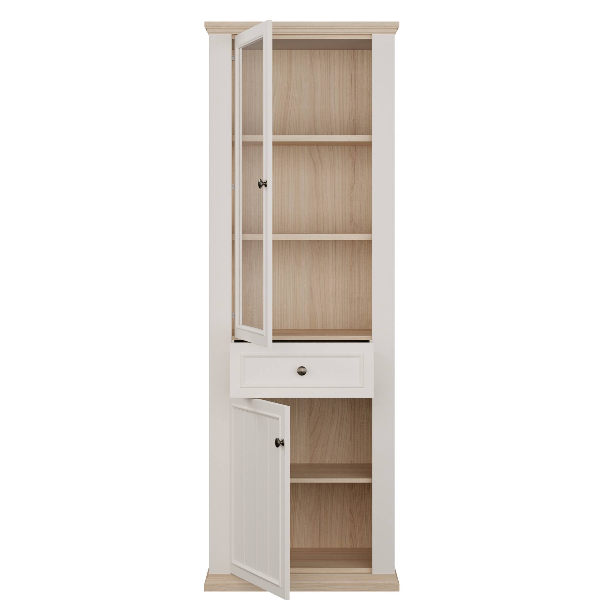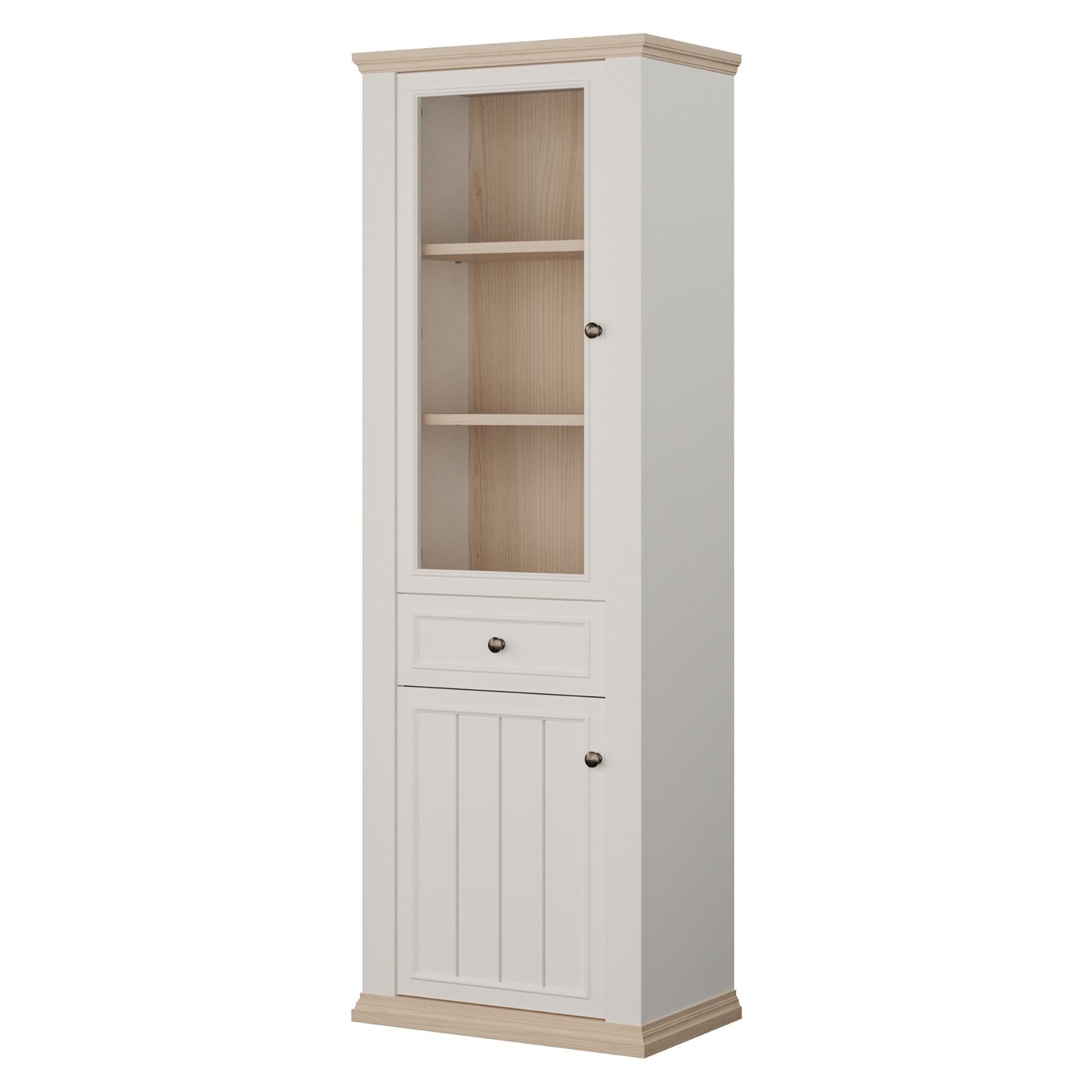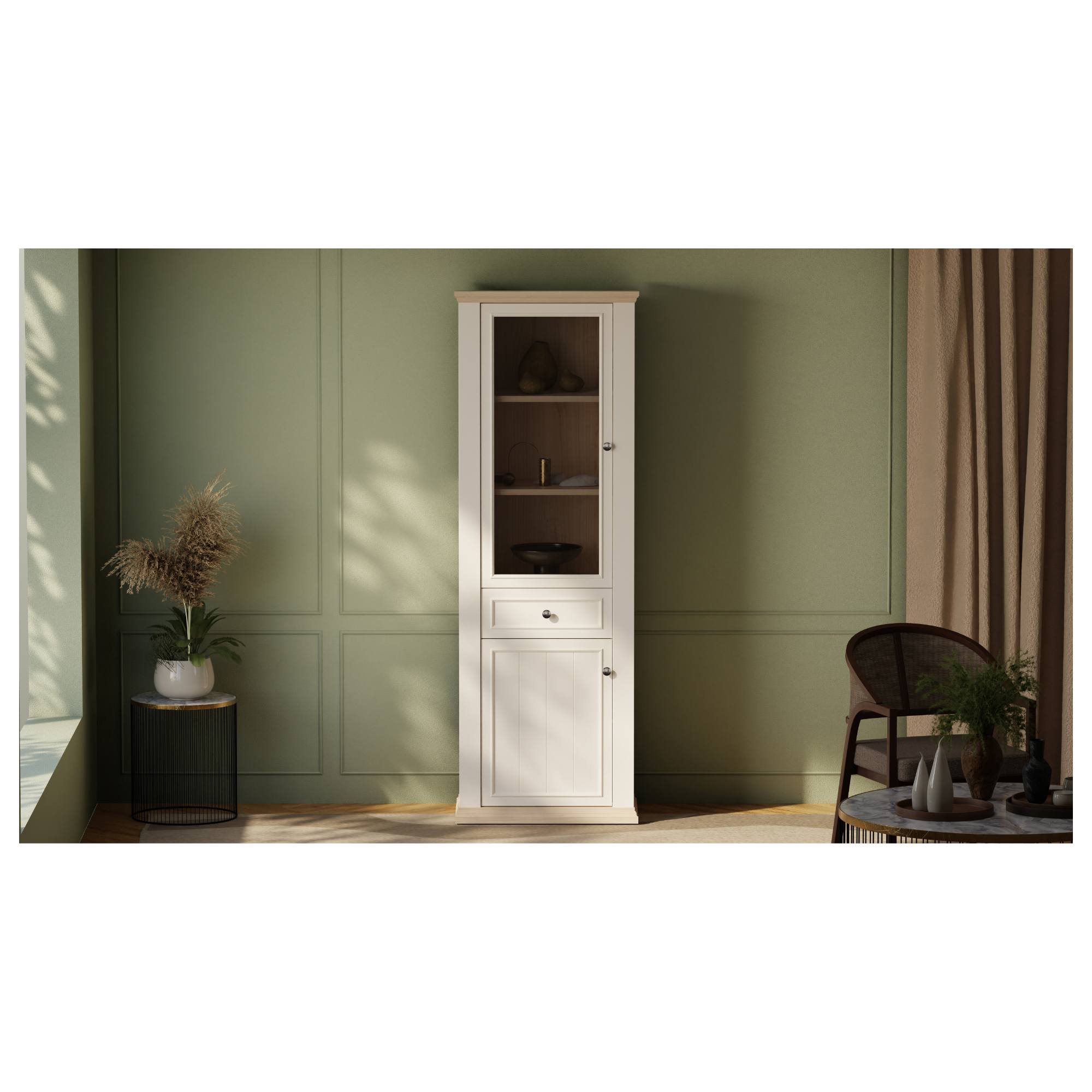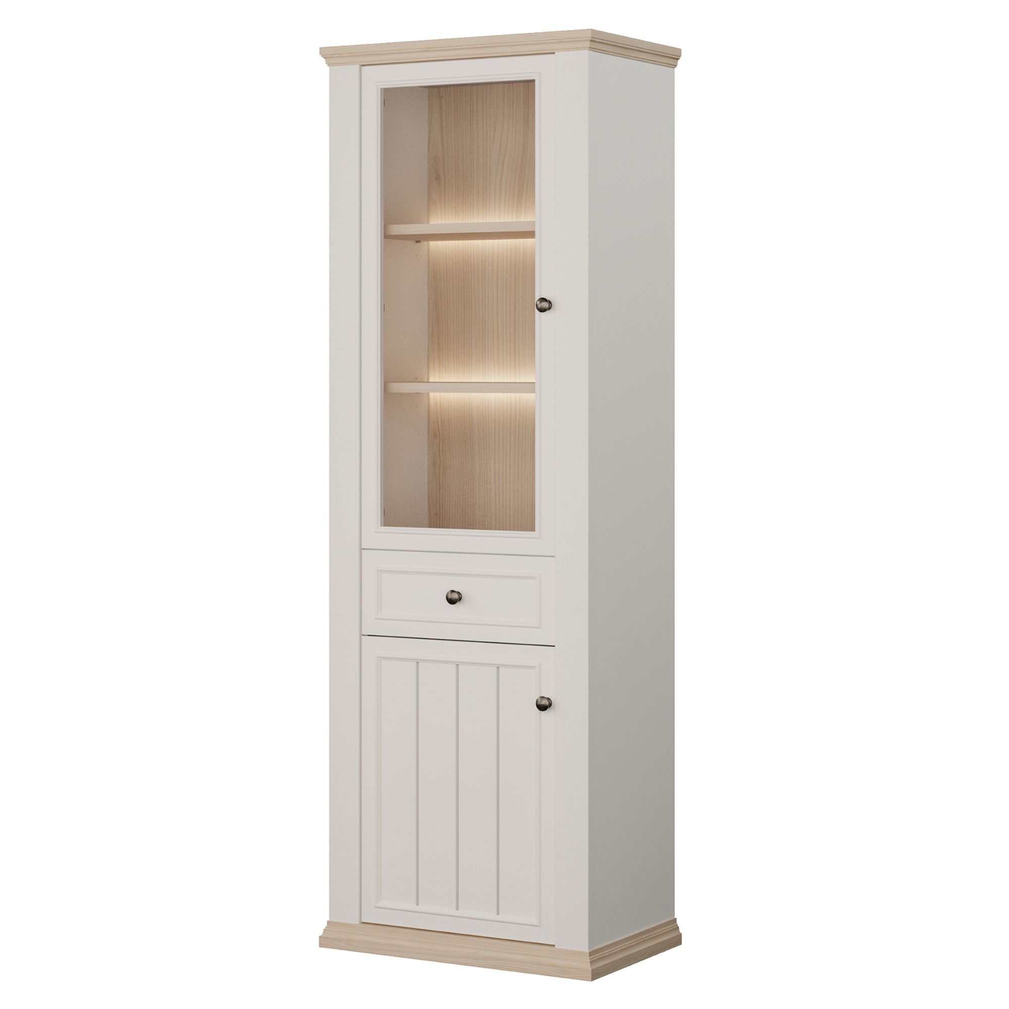 Za jejími dvířky, z nichž 1 jsou prosklená, najdete 3 vložené police. Nechybí ani 1 zásuvka. Vitrína tak poskytne nejen dostatek prostoru na přehledné uložení všeho, co potřebujete mít po ruce, ale i místo pro vystavení oblíbených dekorací. K vitríně si můžete dokoupit i LED osvětlení, díky kterému budou moct vystavené předměty vyniknout naplno. Dvířka i zásuvka jsou pro snadnější manipulaci vybaveny úchyty. Dvířka lze namontovat na pravou i levou stranu vitríny.