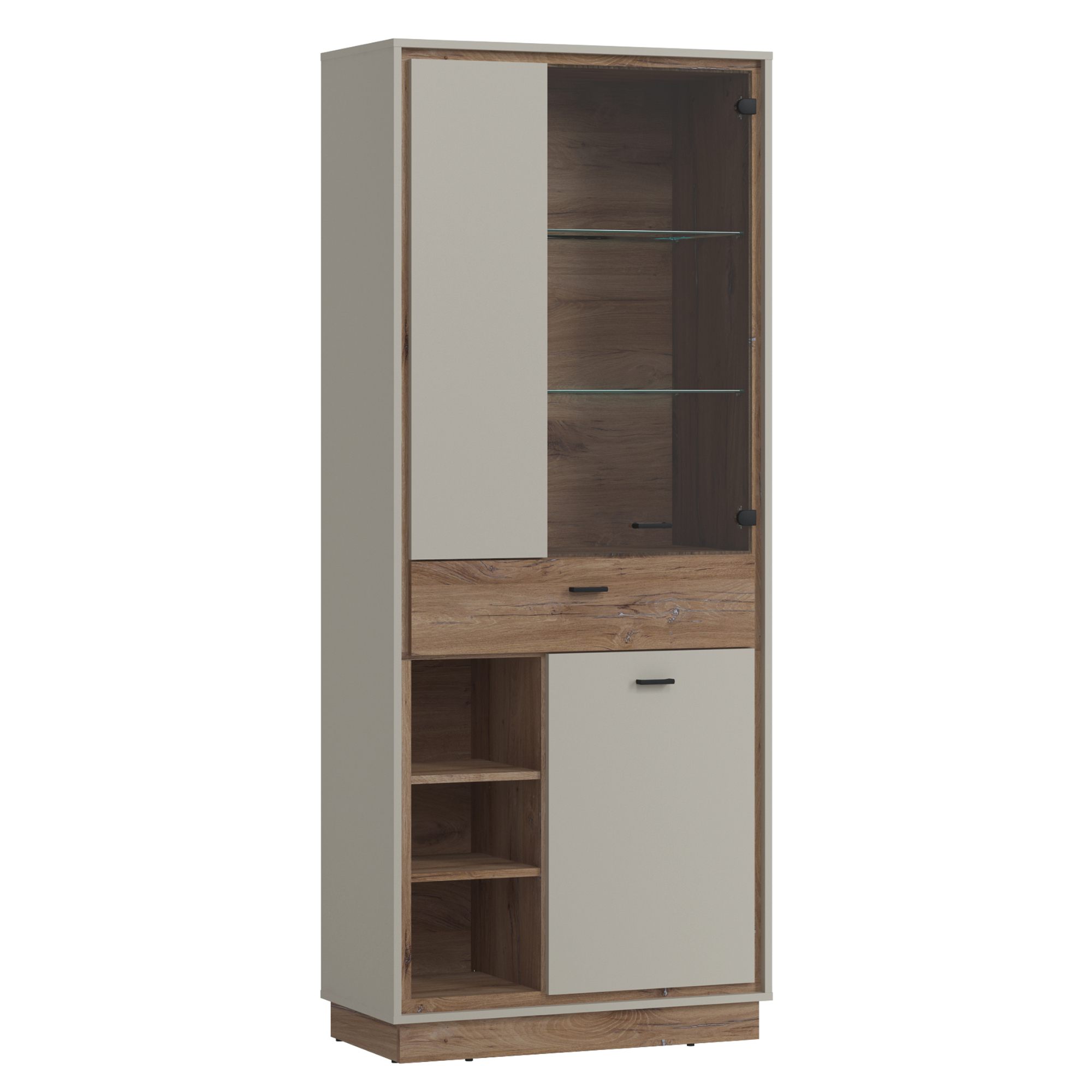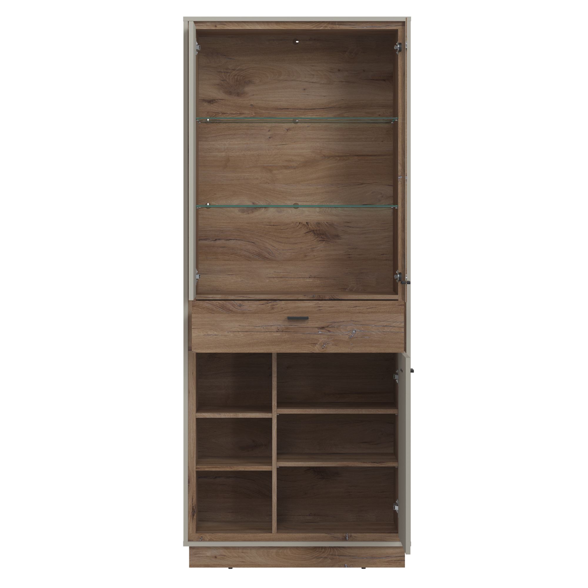 Vyrobena je z laminovaného dřevěného materiálu, pro který je typická snadná udržovatelnost i dlouhá životnost. Design podtrhuje barevné sladění šedé s dekorem dubu tmavého. Okraje nábytku jsou hraněny ABS hranami, které eliminují riziko mechanického poškození. Kombinovaný úložný prostor zajišťuje šest polic, z čehož dvě skleněné a středová zásuvka. Horní část kryje dvojice dvířek, z čehož jedny ze skla. Manipulaci navíc usnadňují černé kovové úchyty a tiché dovírání softclose.