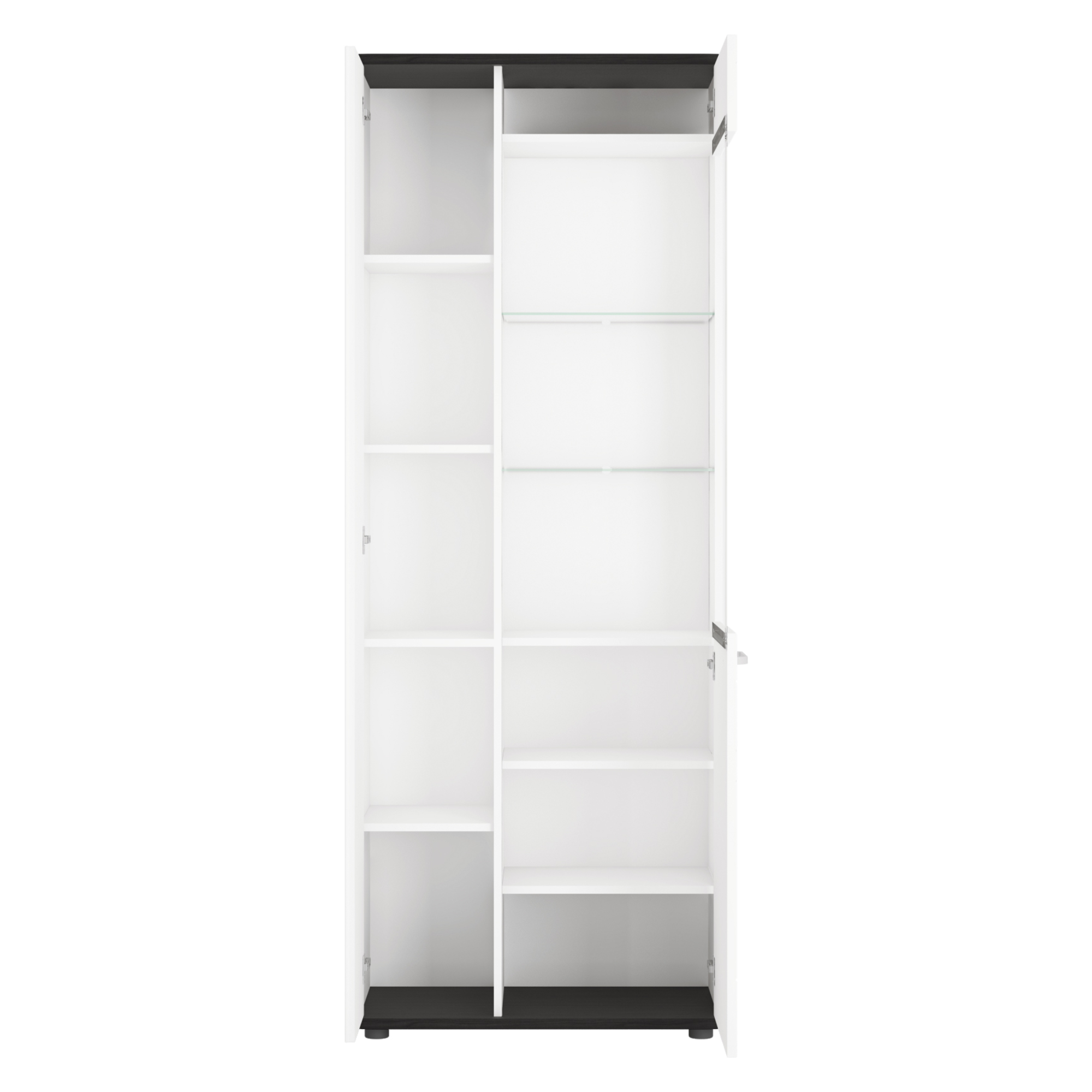 Vysoká vitrína na nožičkách VENEZIA VENV01 vyvedená v klasické barevné kombinaci alpské bílé a černé snadno zapadne do jakéhokoliv moderně laděného obývacího pokoje a dodá mu čistý nádech.