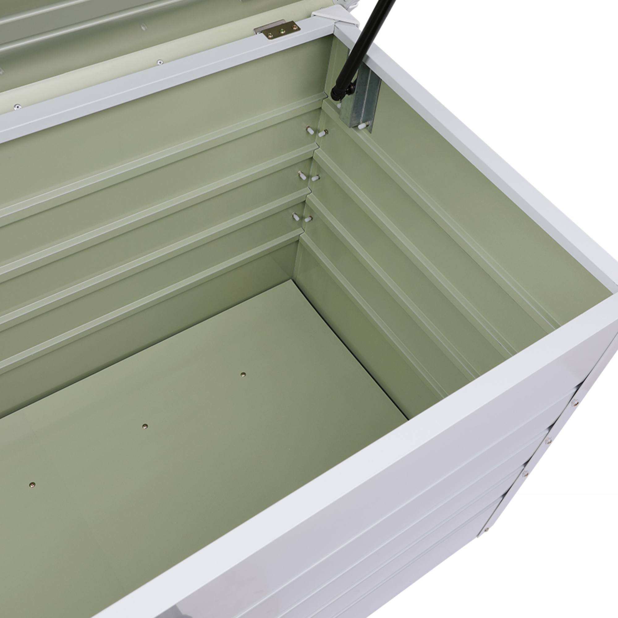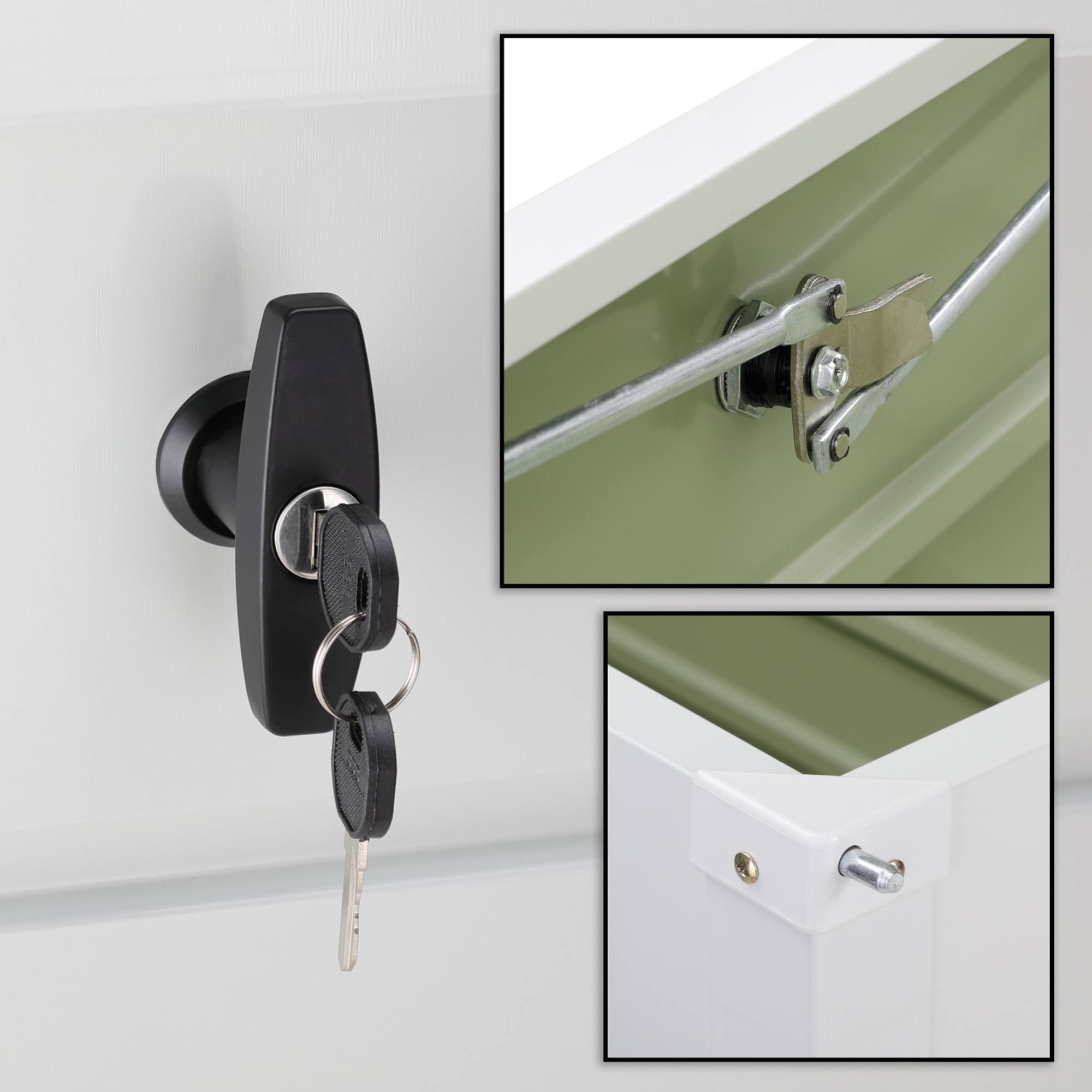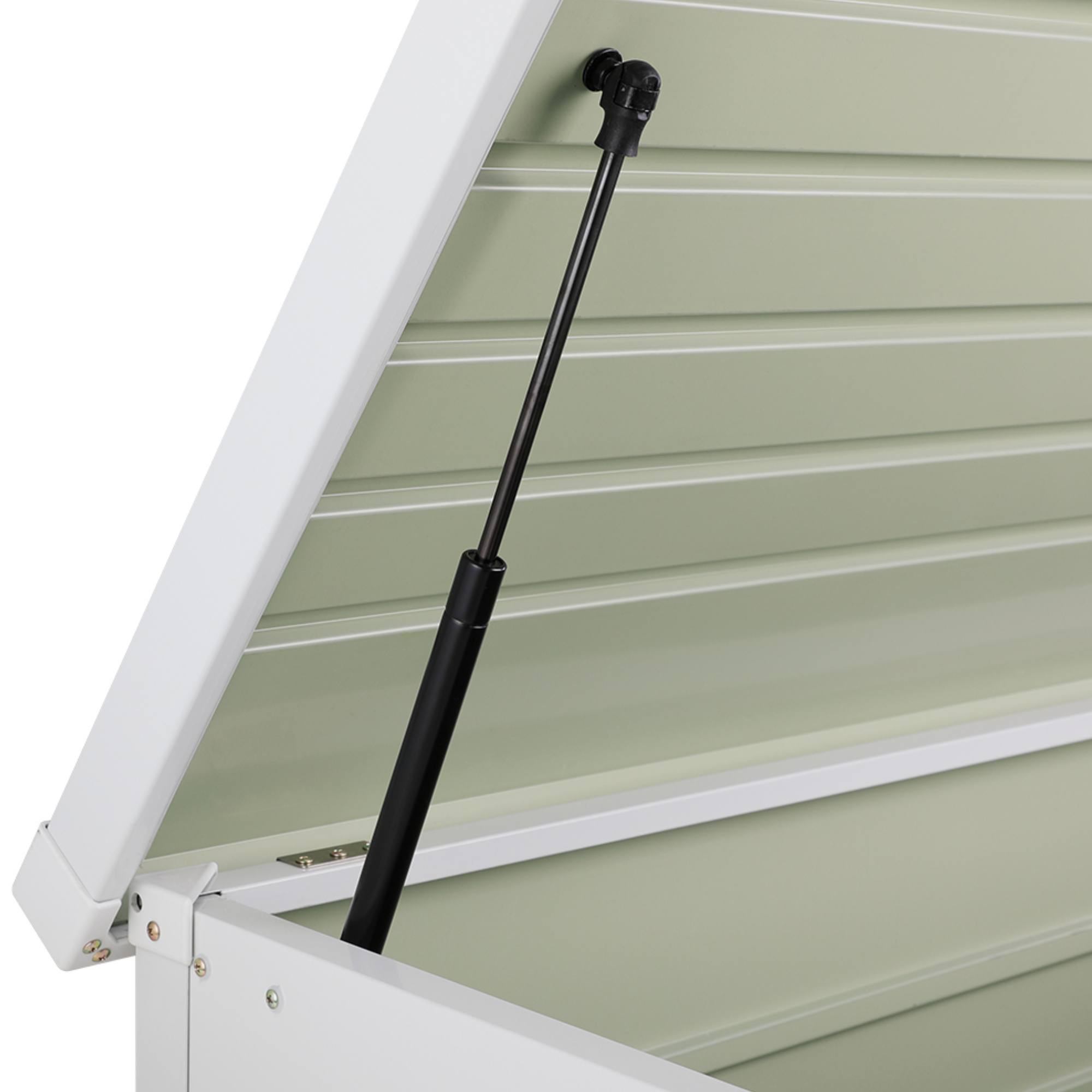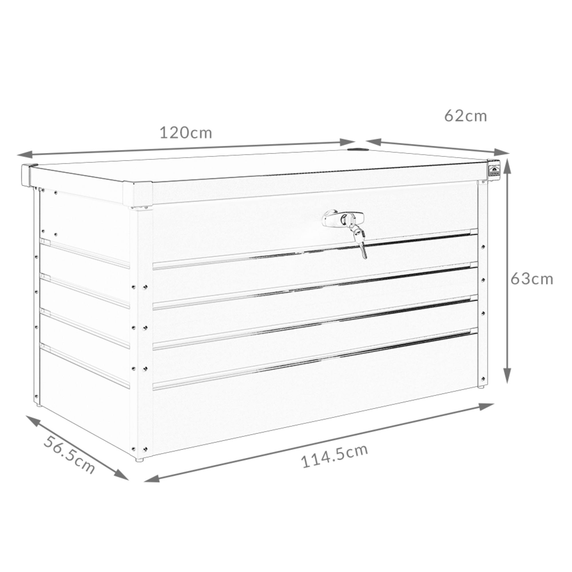 Je vyroben z pozinkovaného ocelového plechu, který zajišťuje ochranu proti rzi, UV záření i povětrnostním vlivům. S objemem 385 l a nosností základny 100 kg nabízí dostatek úložného prostoru na polštáře, nářadí či hračky. Víko s nosností 60 kg je vybaveno písty, které usnadňují manipulaci. Vyvýšené nohy chrání obsah před vlhkostí a integrovaný zámek na klíč jej uchová v bezpečí.