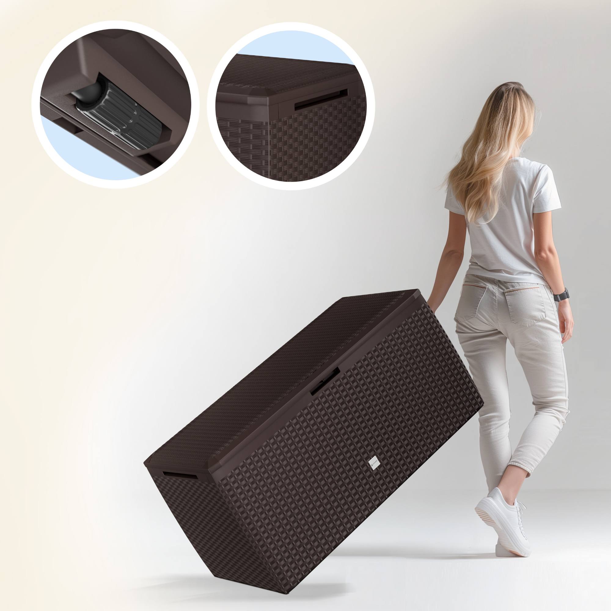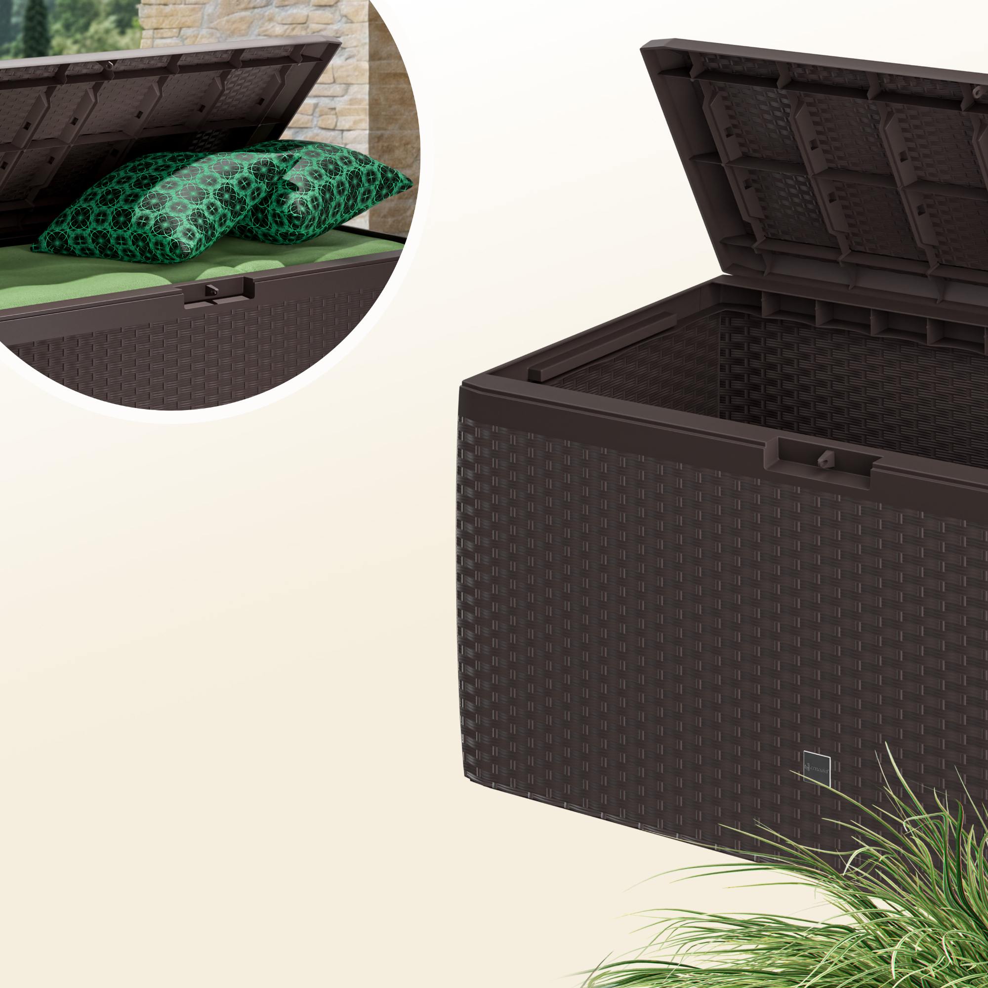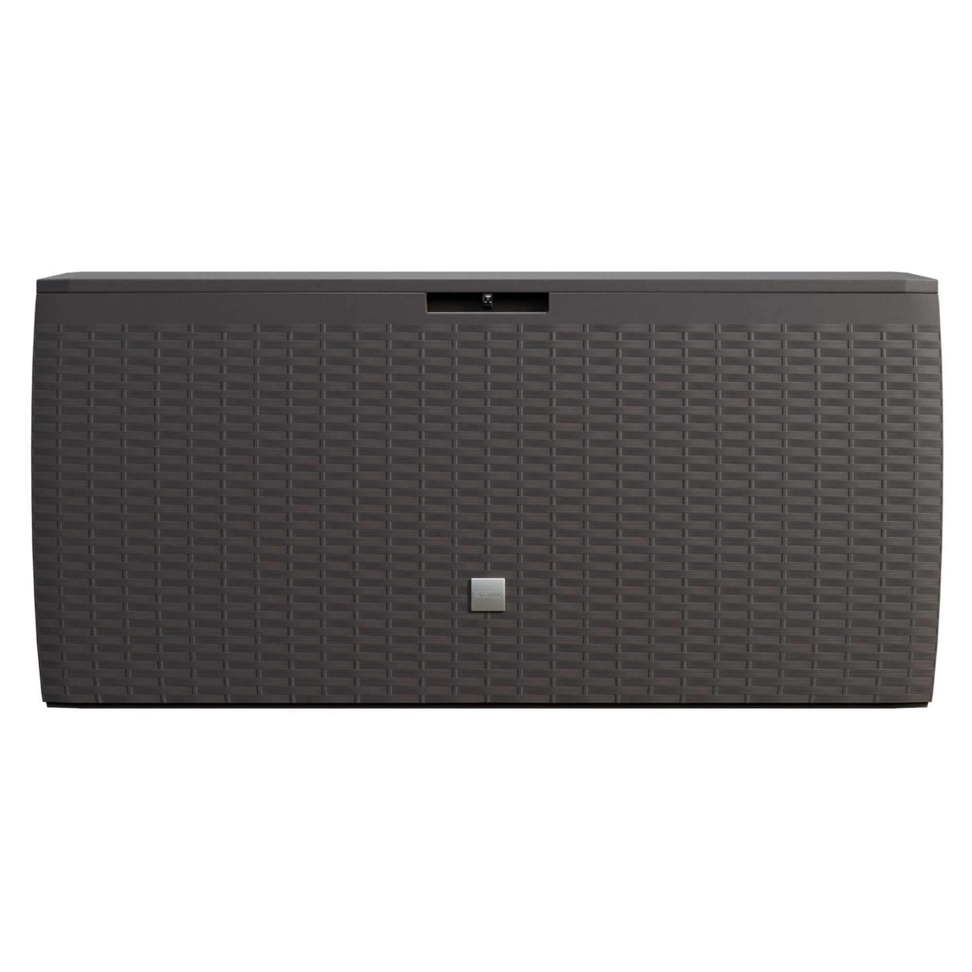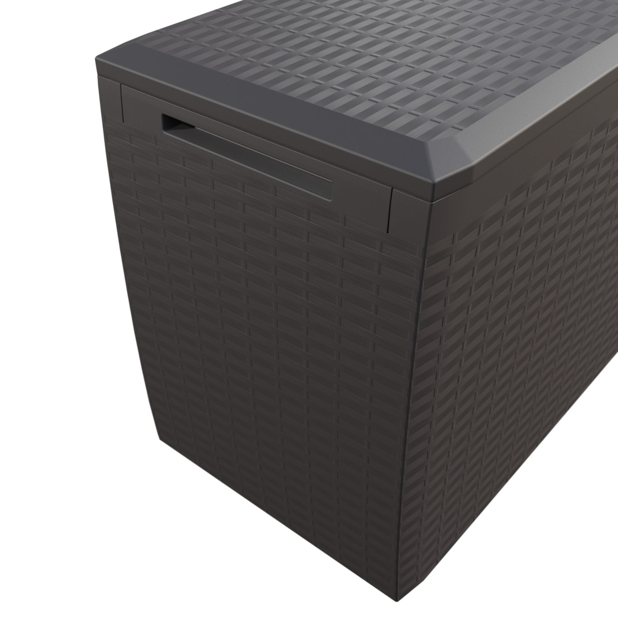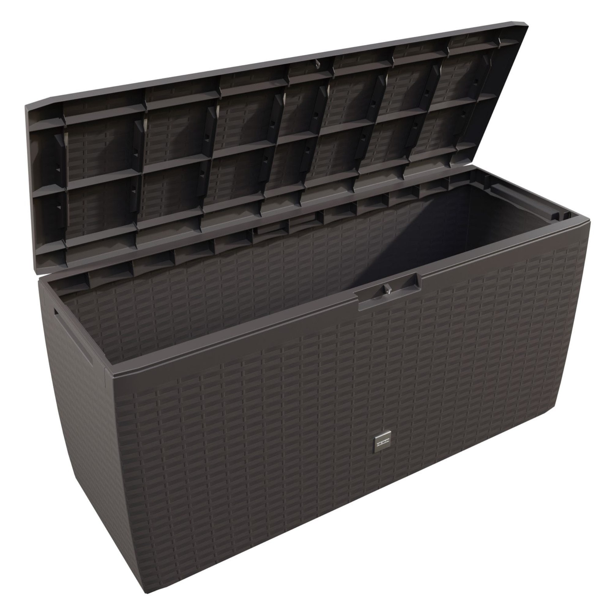 Je vyroben z polypropylenu, odolného vůči povětrnostním vlivům a UV záření. Je tedy ideální volbou pro celoroční použití. Jeho robustní provedení s objemem 290 l nabízí dostatek úložného prostoru na polštáře, deky, hračky a další doplňky.