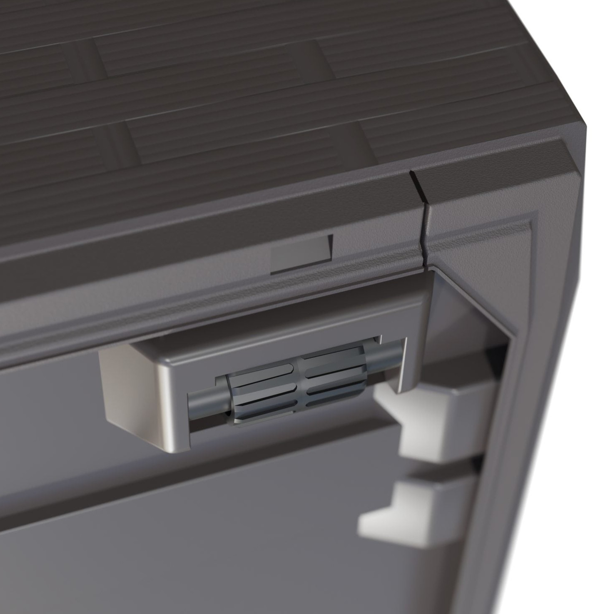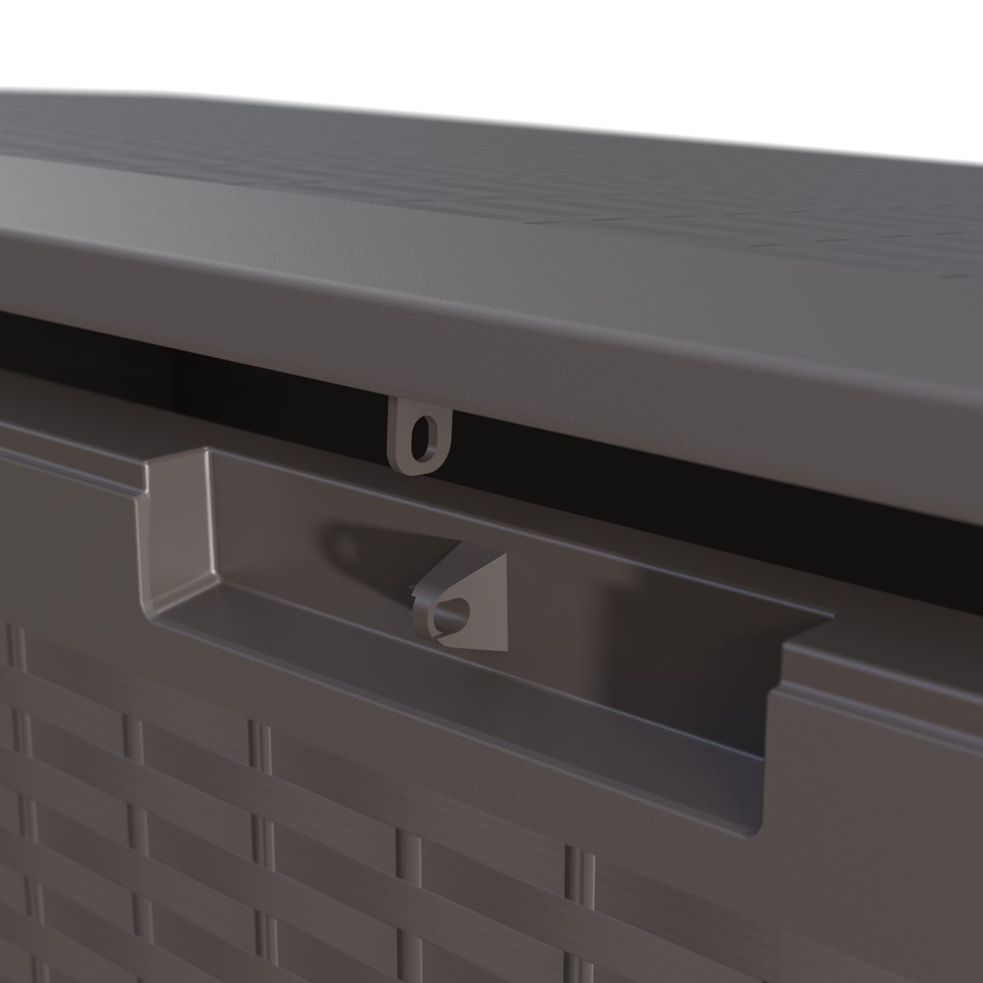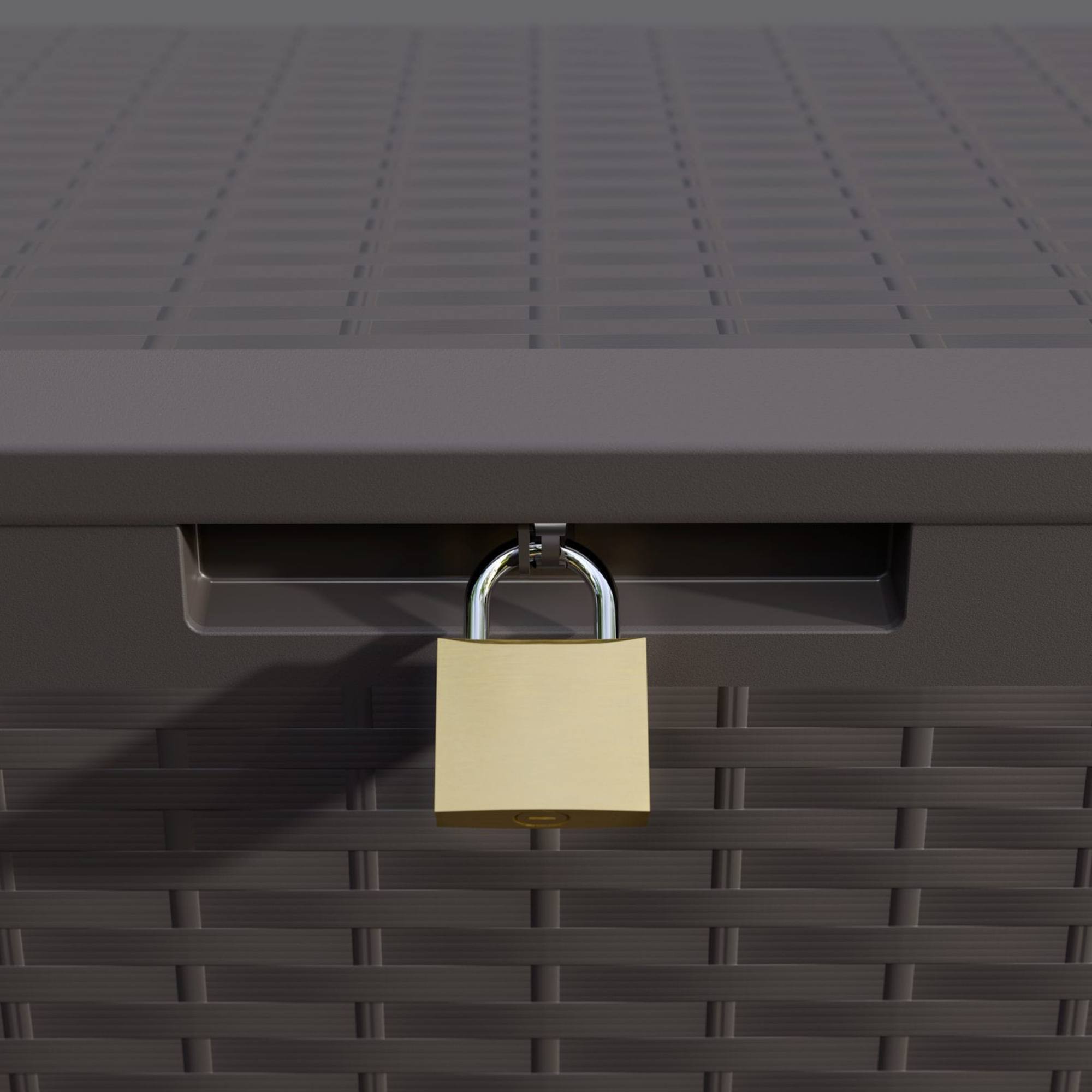 Výklopné víko lze uzamknout pomocí visacího zámku (není součástí balení), takže obsah bude v bezpečí. Box je vybaven 2 úchyty a 6 kolečky pro snadnou manipulaci. Pomocí zacvakávacího systému jej snadno a rychle sestavíte.