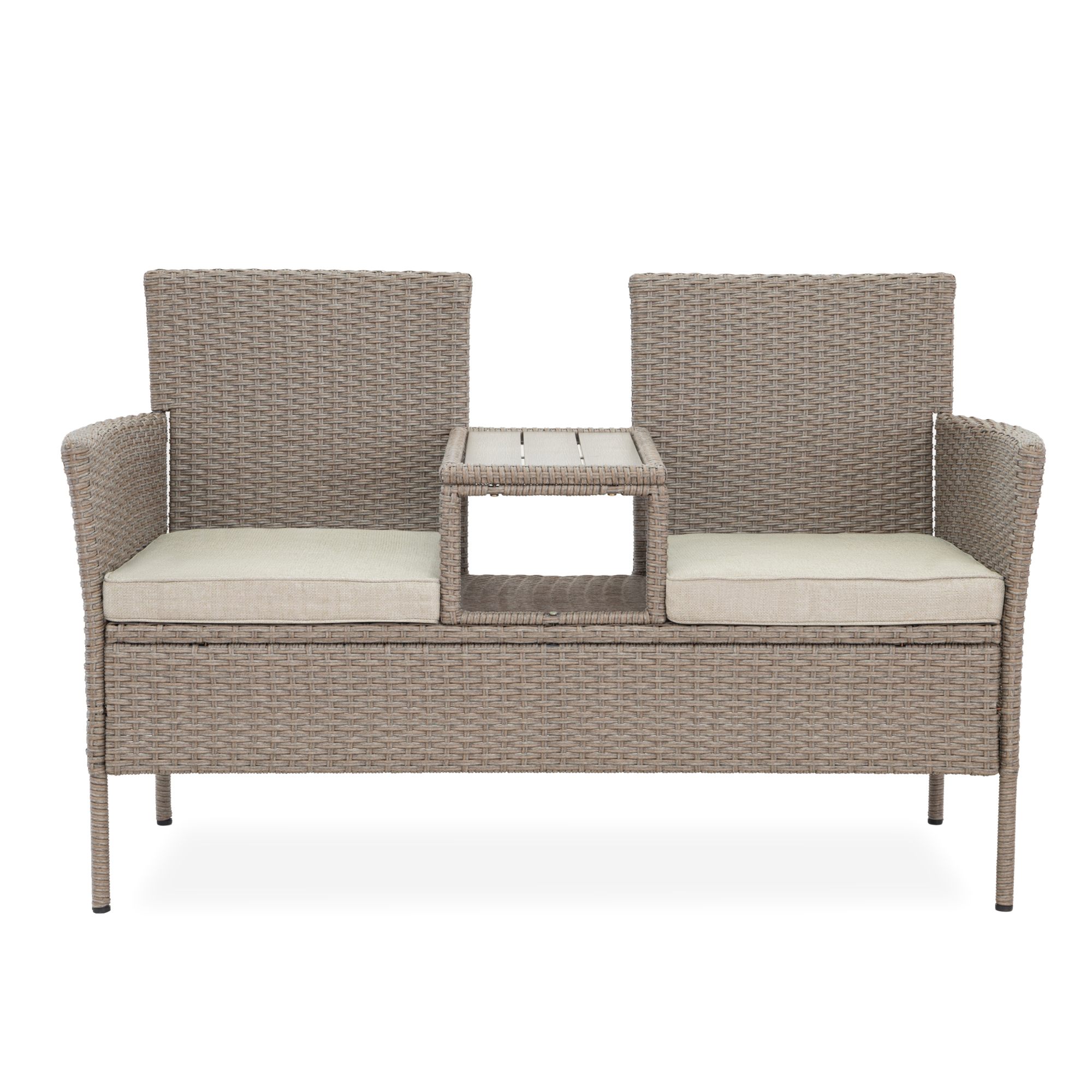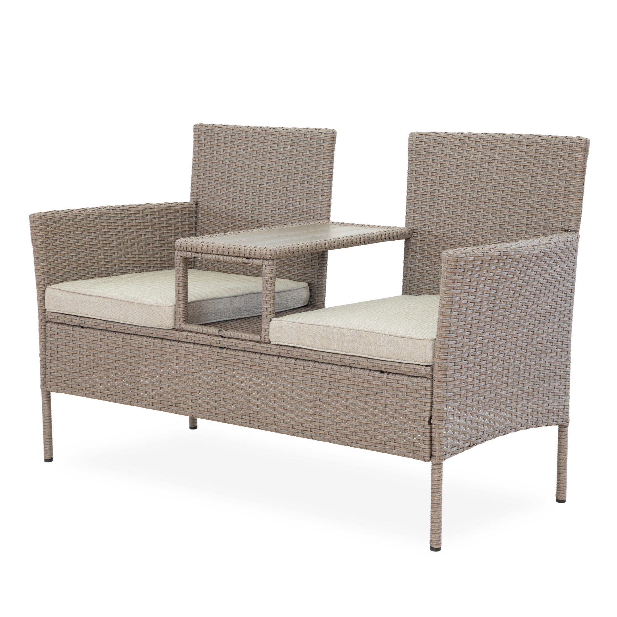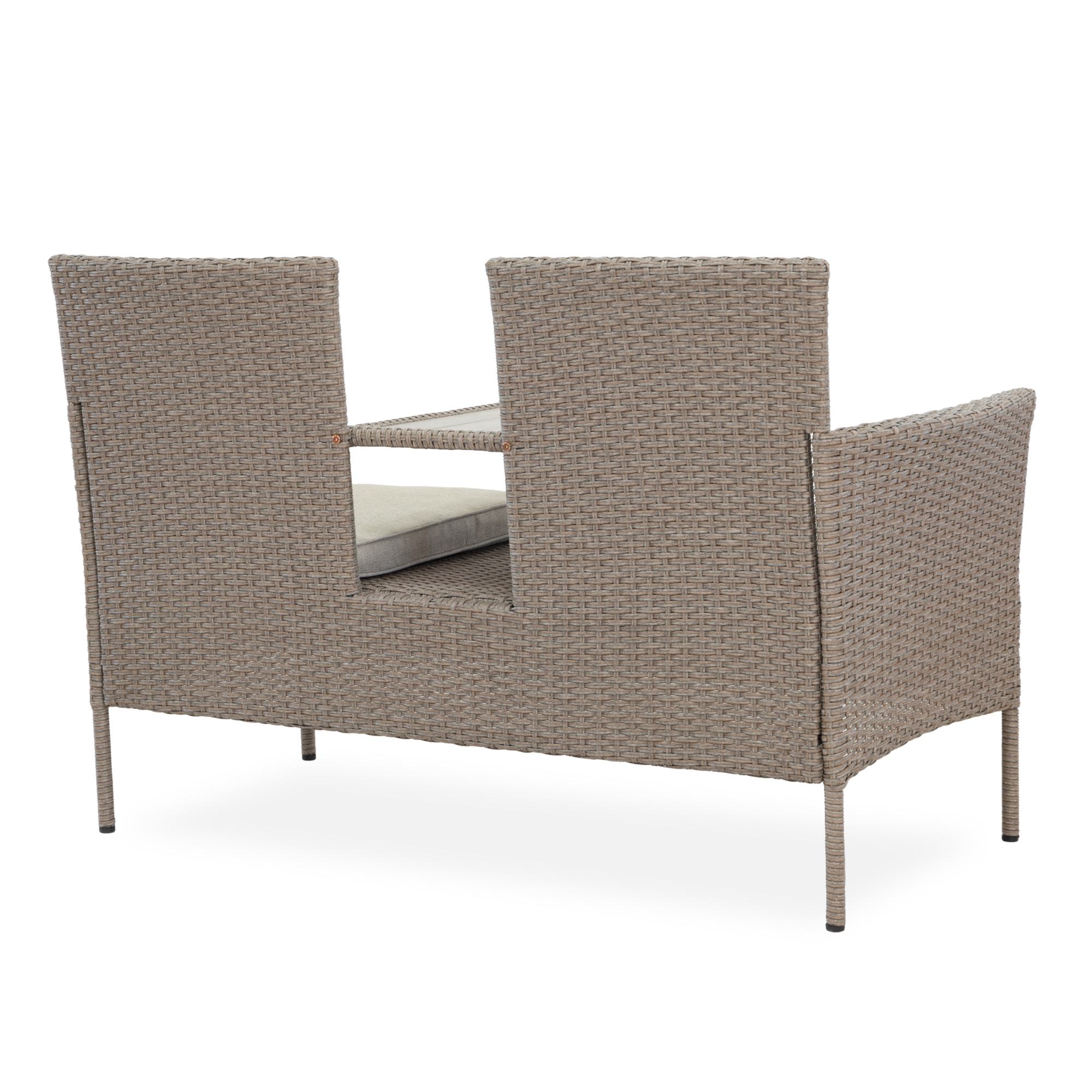Pevná a stabilní konstrukce této lavice je vyrobena z ocele a opletena polyratanem. O pohodlné sezení se starají nejen měkké pěnové sedáky, ale přispívají k němu i područky. Součástí lavice je i odkládací plocha s odolnou artwoodovou deskou, která vzhledem připomíná přírodní materiál.