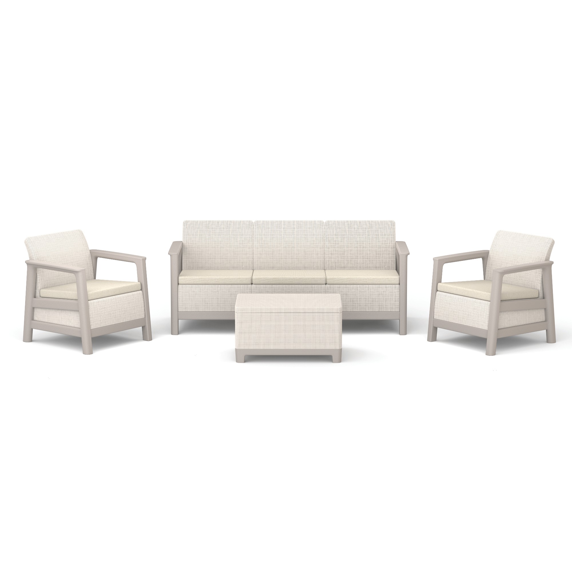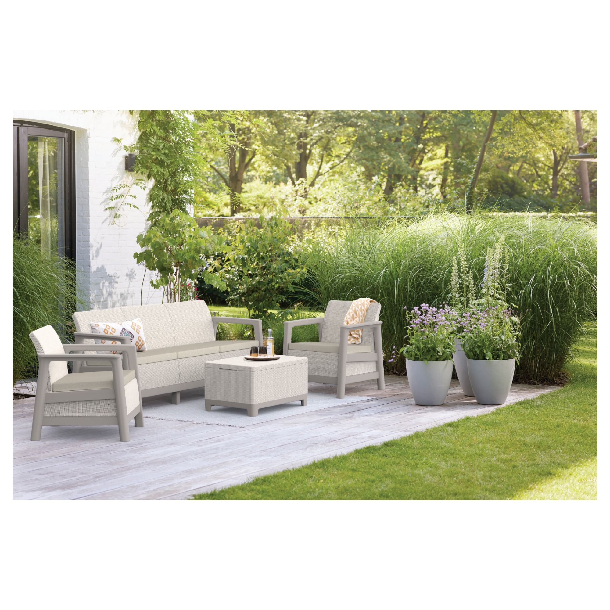 Zahradní sestava LARI, která se skládá ze stolku s praktickým úložným prostorem, trojmístné pohovky a 2 křesel, je jako stvořena pro všechny moderní zahrady.