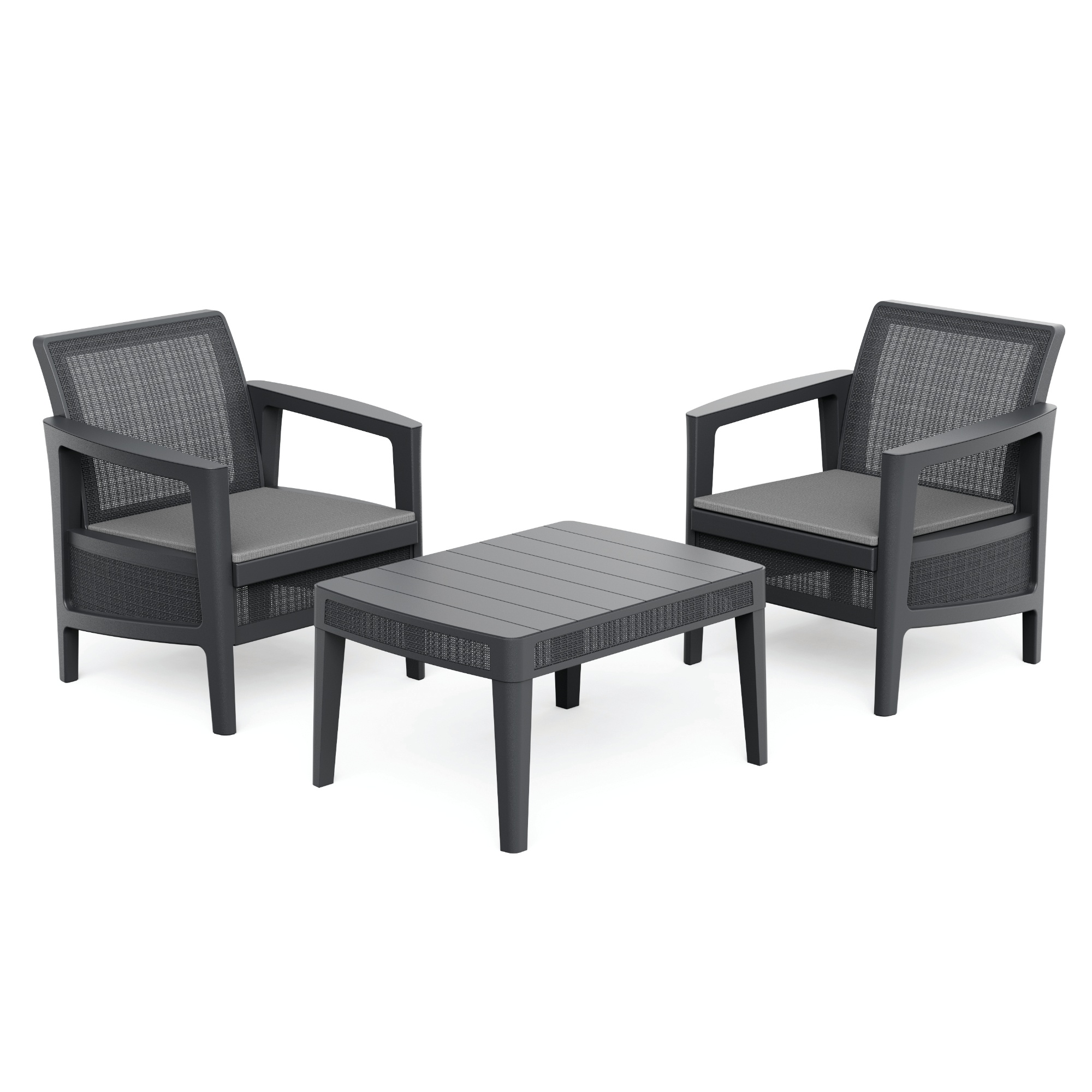 Sestava se skládá ze stolku a 2 křesel. Nábytek má pevnou a stabilní konstrukci, která je vyrobena z kvalitních plastových materiálů. K pohodlí při sezení přispívají nejen měkké sedáky, ale i praktické područky.