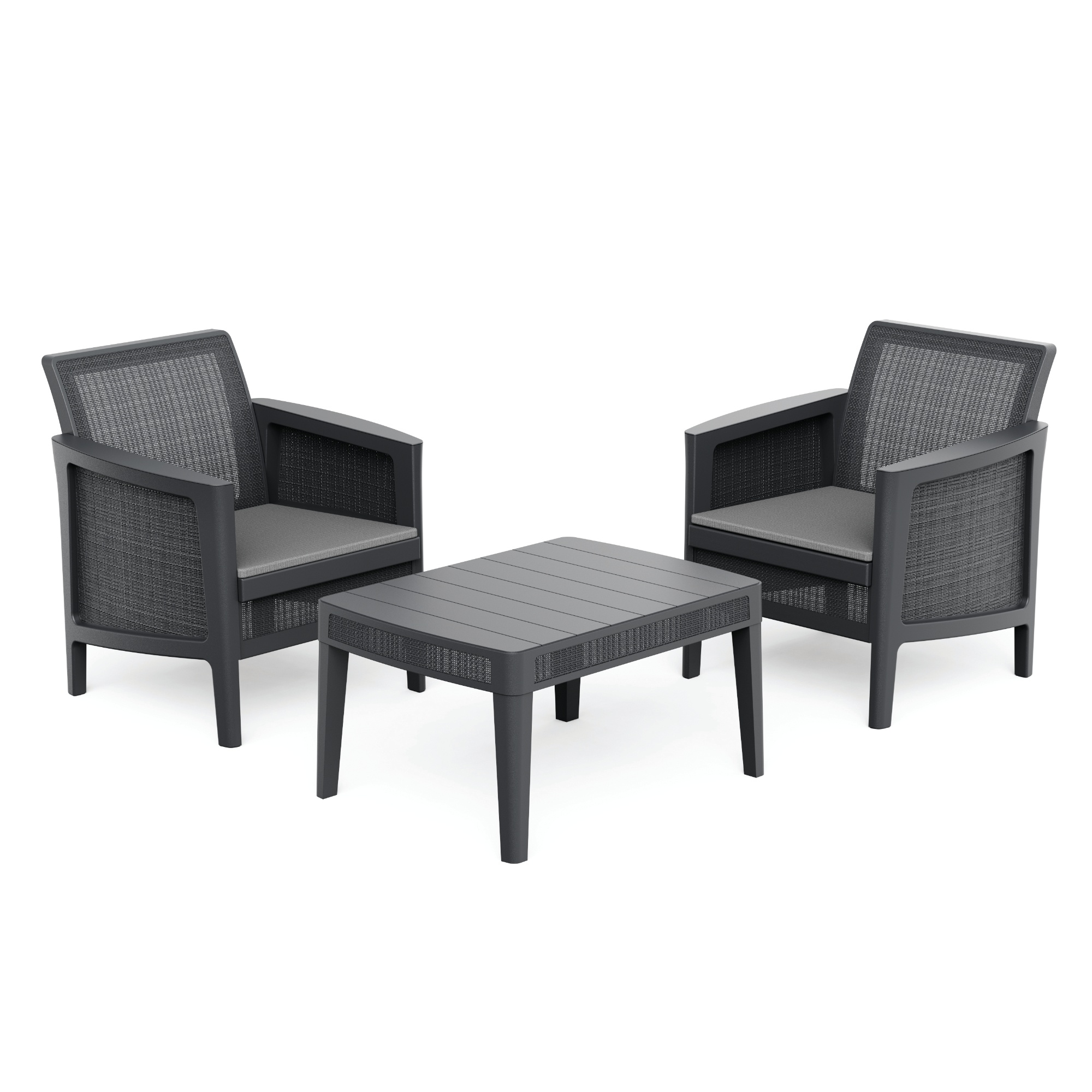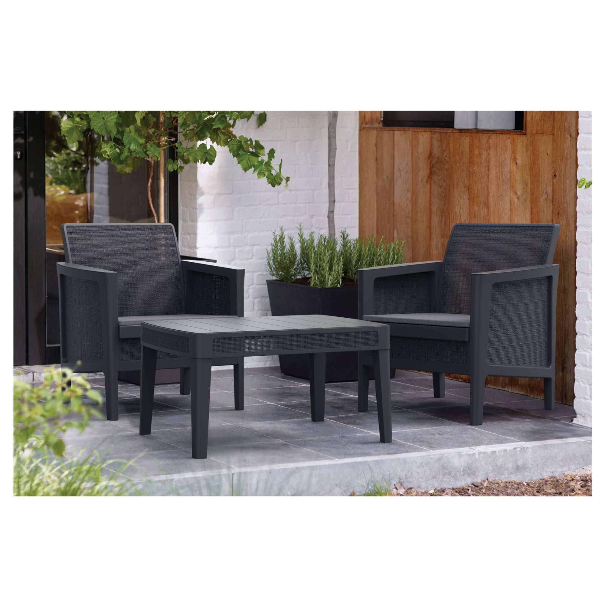 Sestava se skládá ze stolku a 2 křesel. Nábytek má pevnou a stabilní konstrukci, která je vyrobena z kvalitních plastových materiálů. K pohodlí při sezení přispívají nejen měkké sedáky, ale i praktické područky.