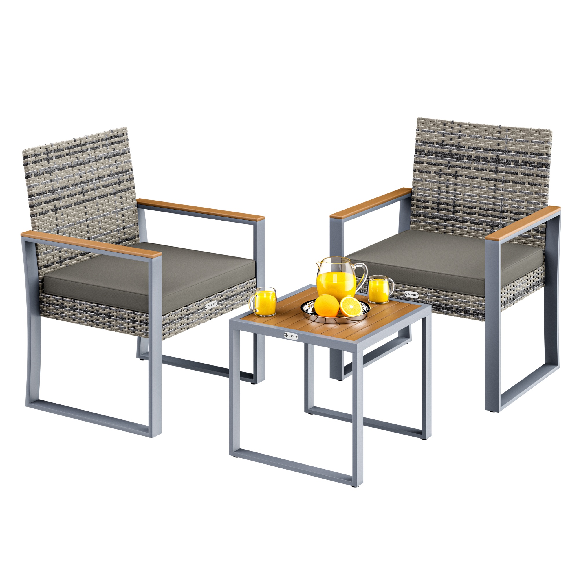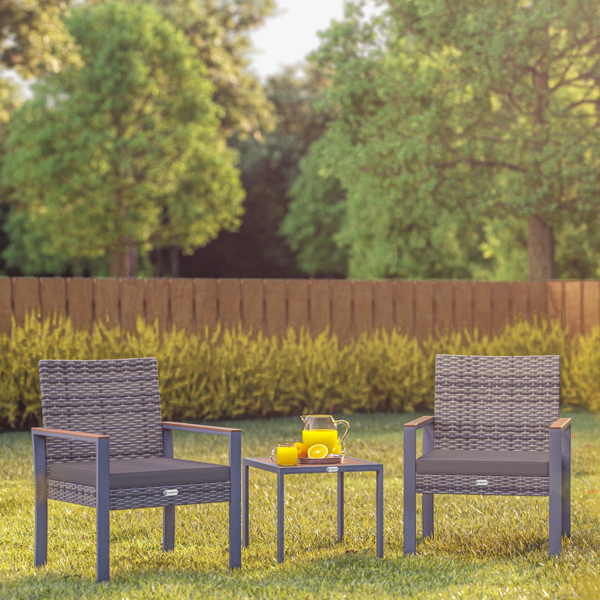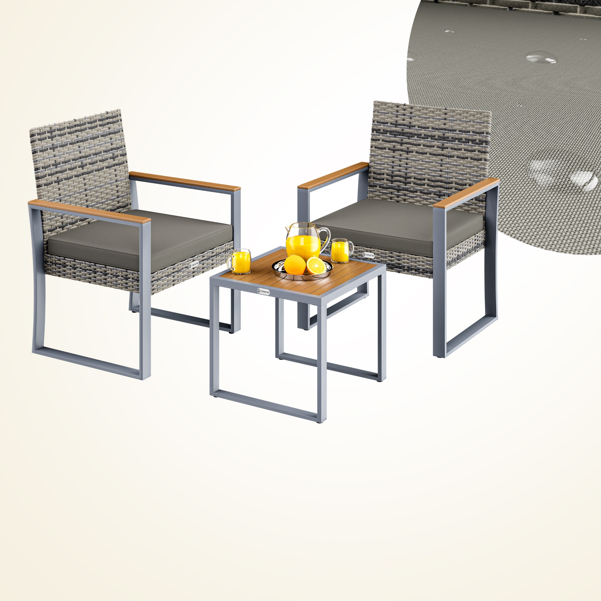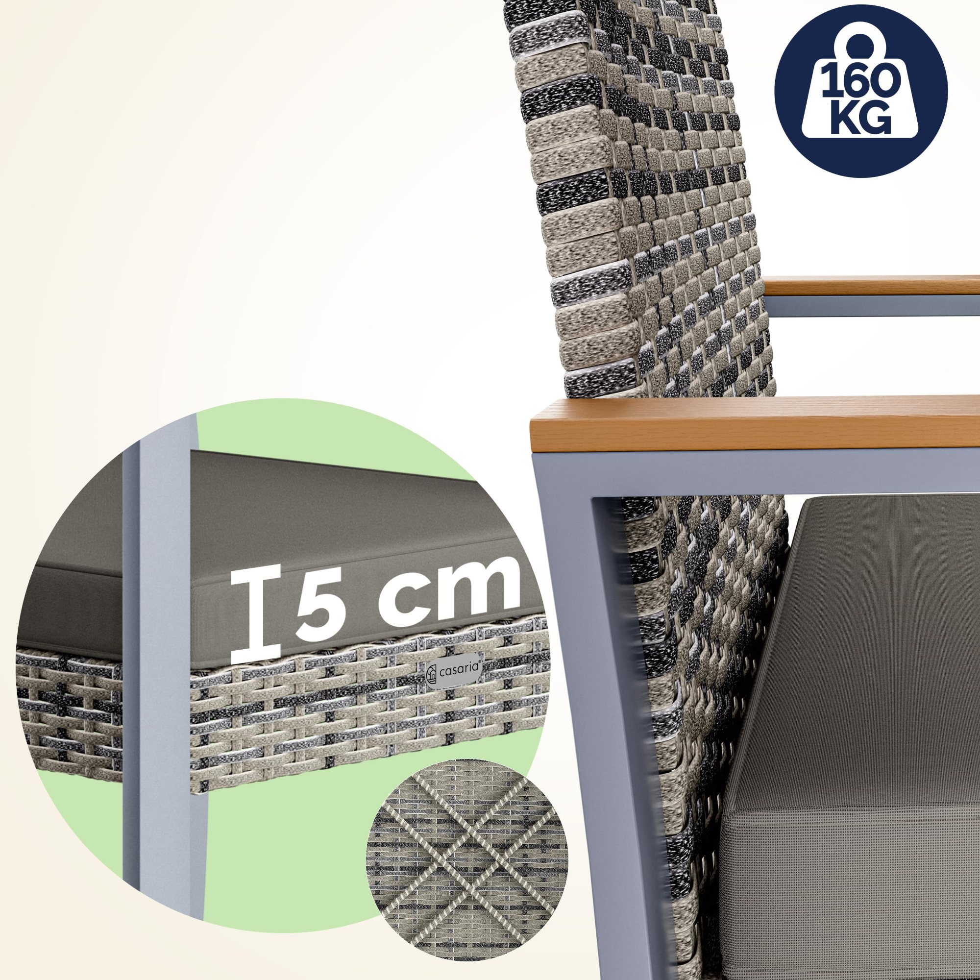 Pevná a stabilní konstrukce tohoto nábytku je vyrobena z pozinkované a práškově lakované ocele. Horní deska stolku je z masivního akáciového dřeva. Konstrukce křesel je opletena polyratanem. Aby se na křeslech sedělo pohodlně, jsou vybavena nejen područkami, ale i 5 cm silnými pěnovými sedáky s voděodolným potahem. Potahy mají skrytý zip, a tak je možné je v případě znečištění sundat a vyprat v pračce na 30 °C.