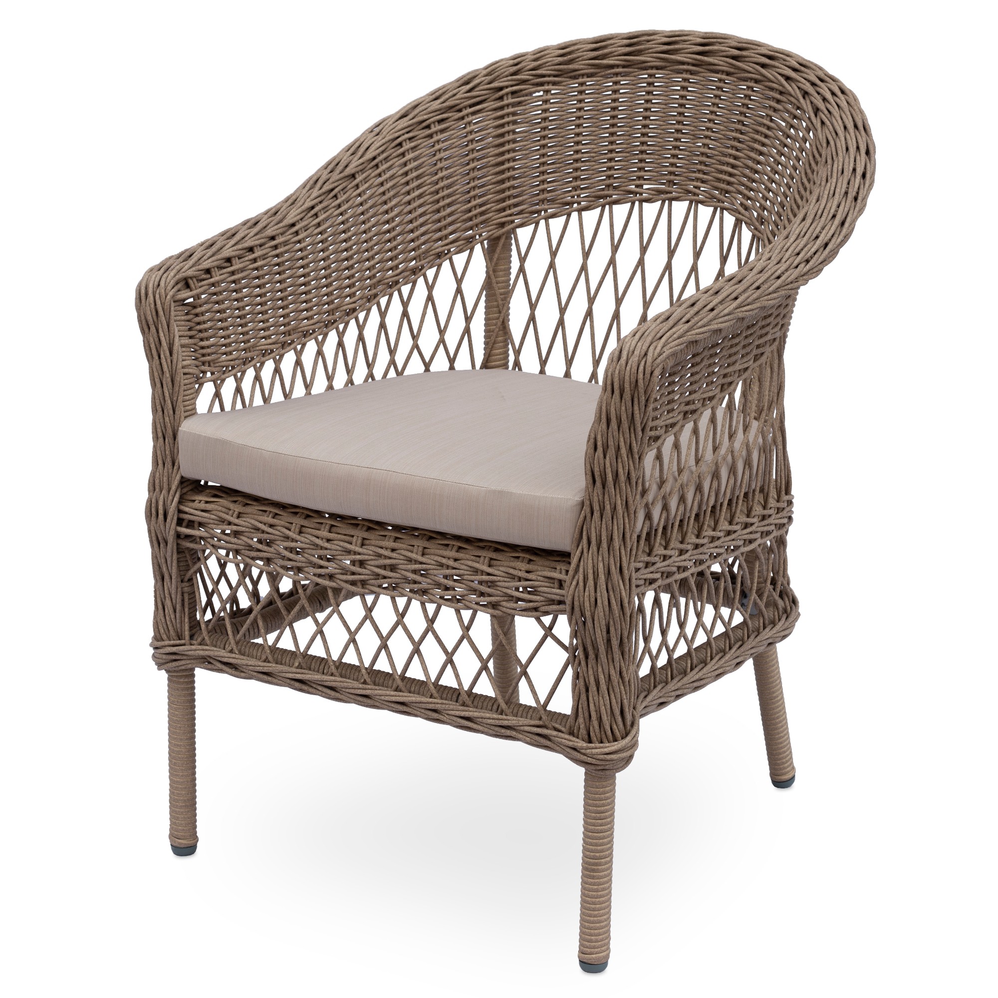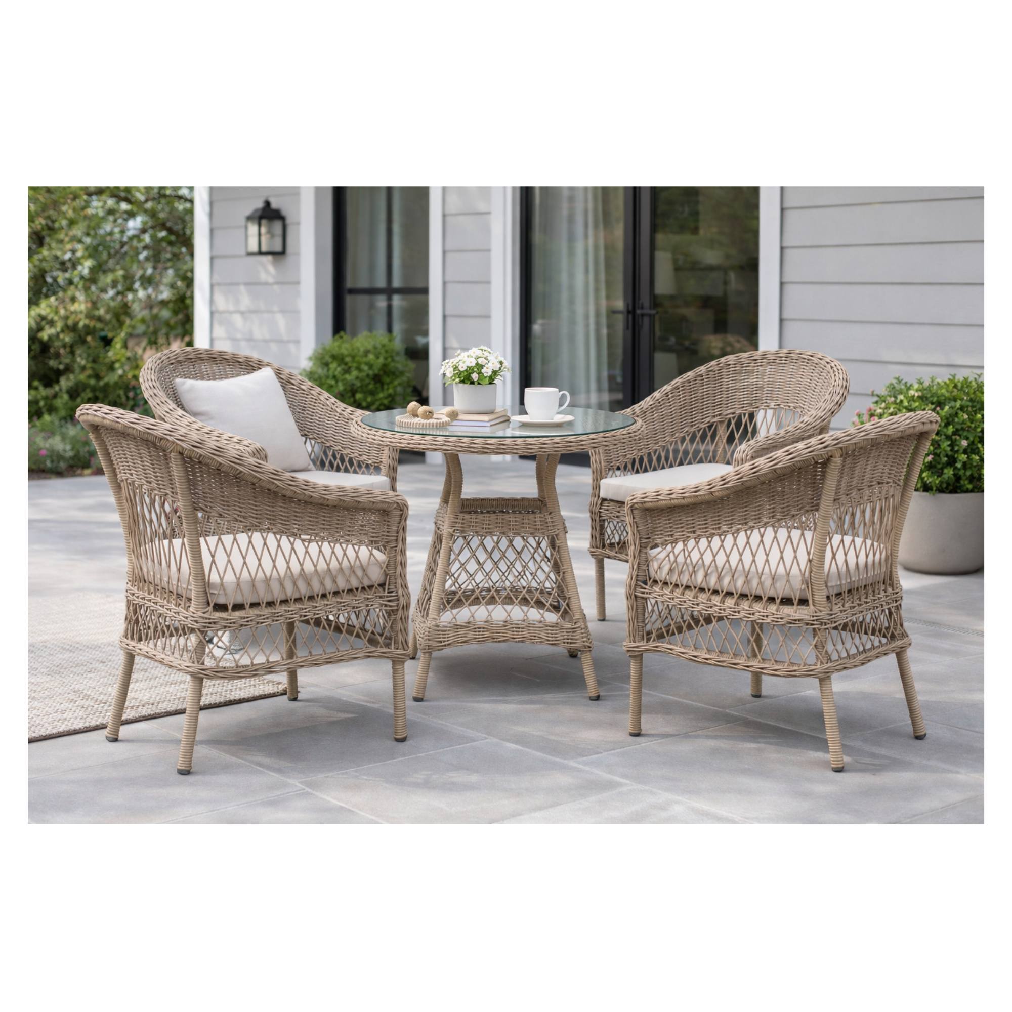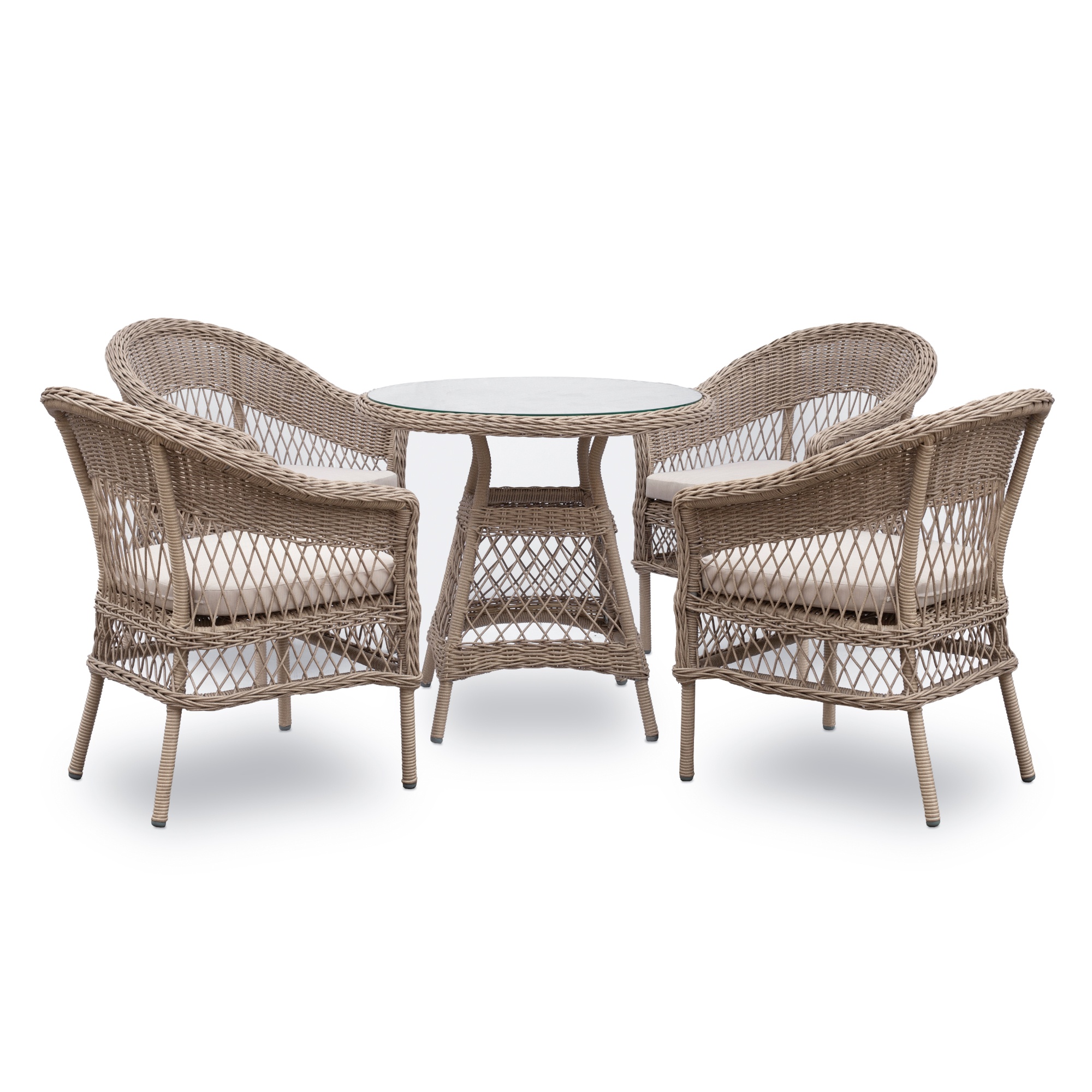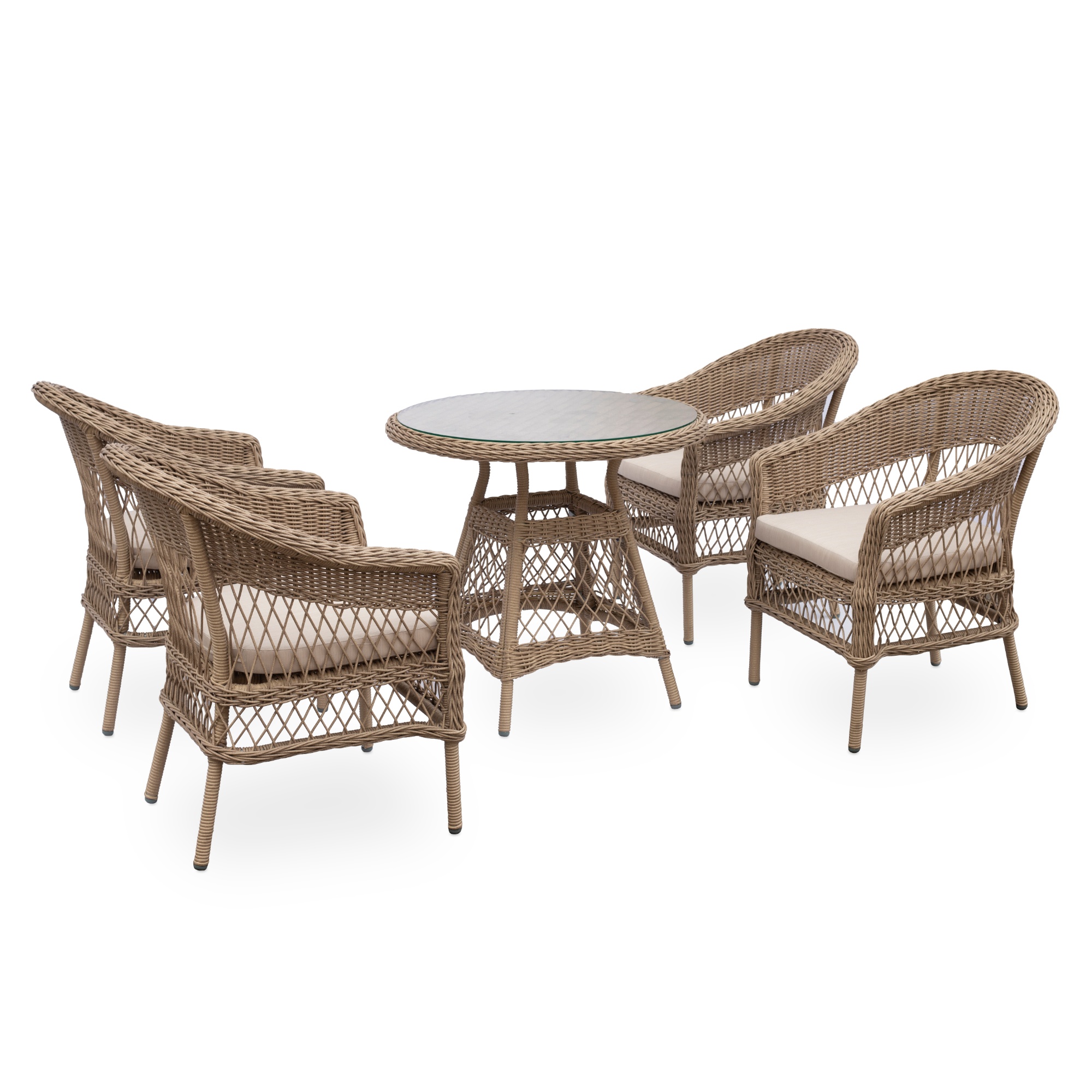 Pevná a stabilní konstrukce tohoto nábytku je vyrobena z ocele a opletena polyratanem. O pohodlné sezení se starají nejen měkké pěnové sedáky, ale přispívají k němu i područky. Horní deska stolu je ze skla.