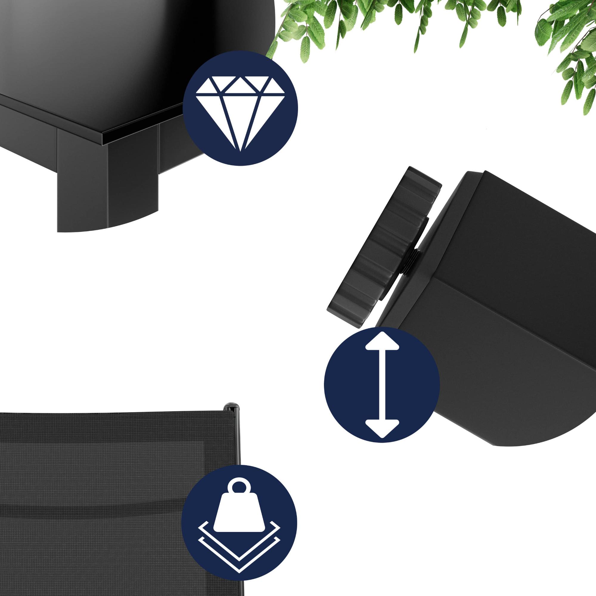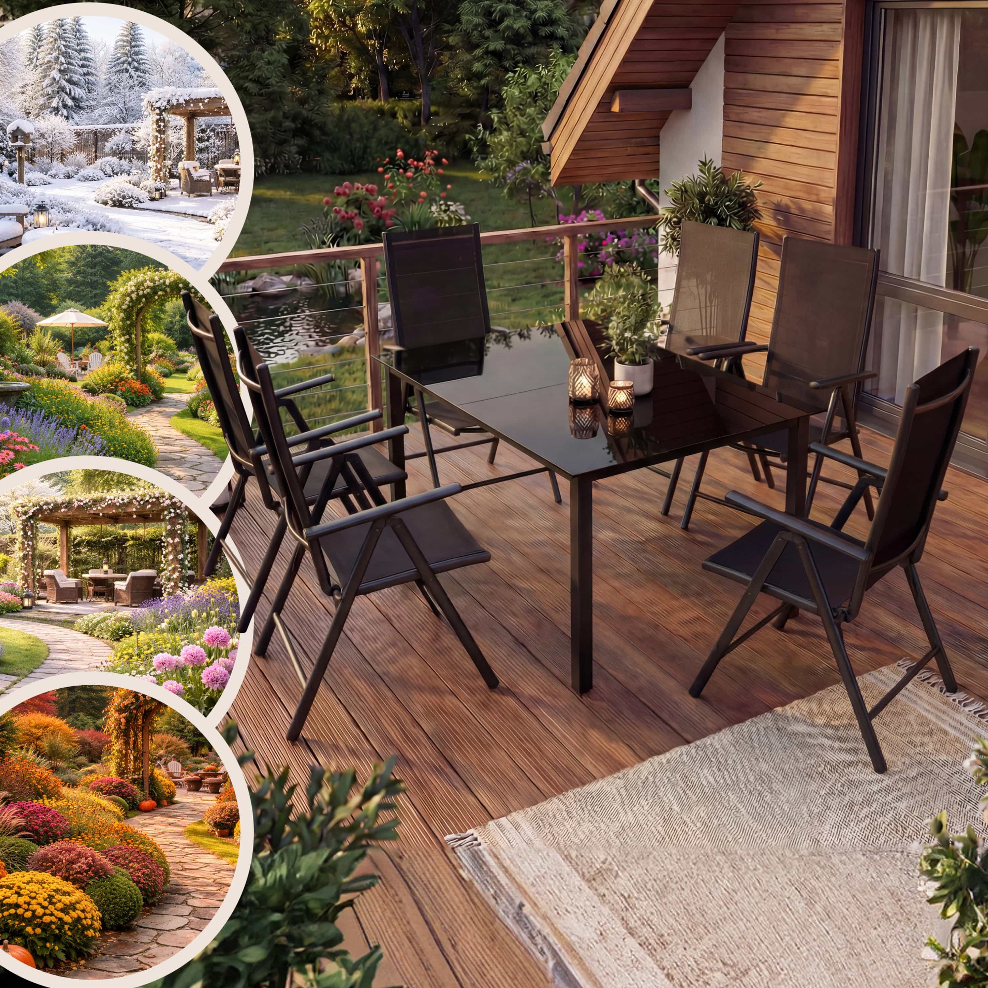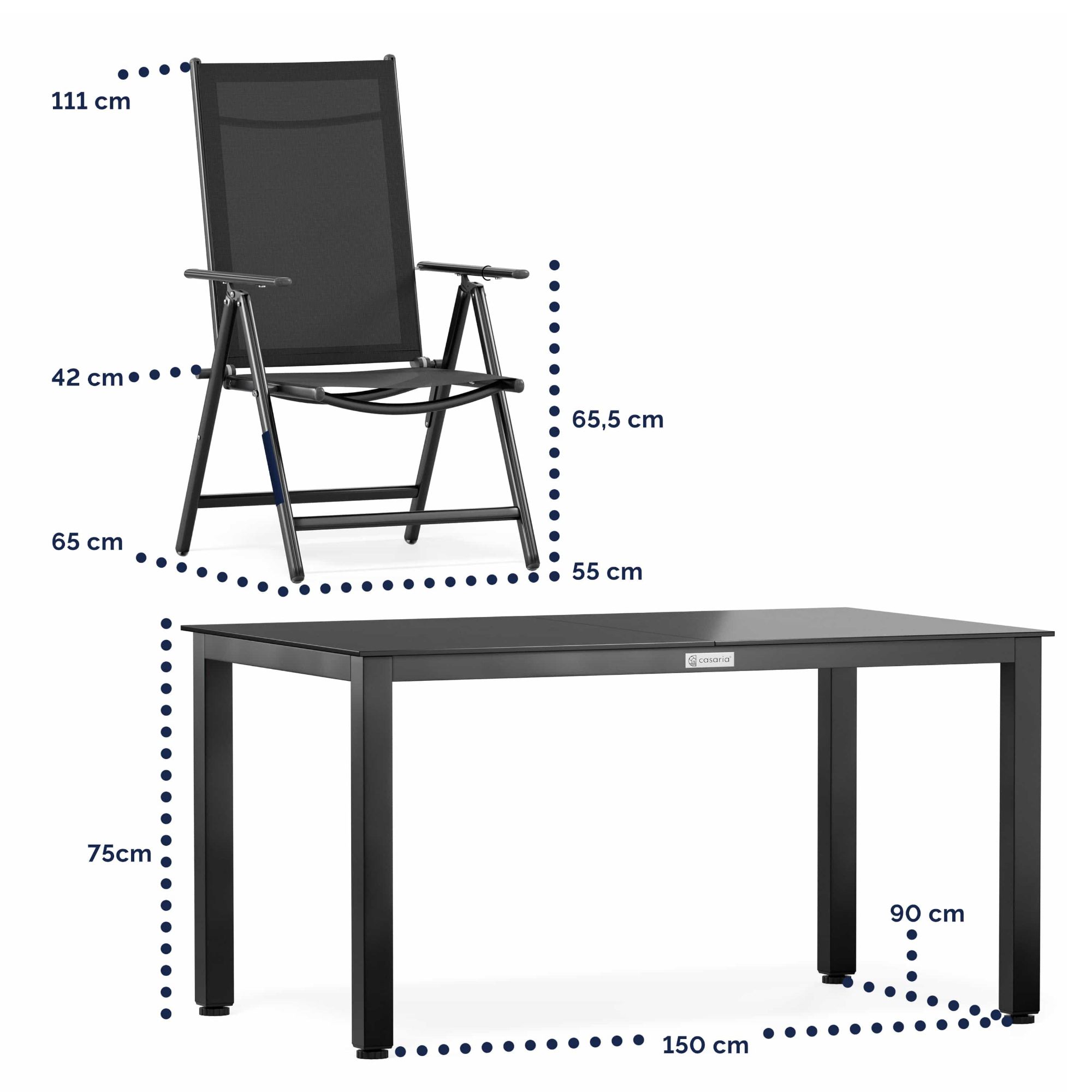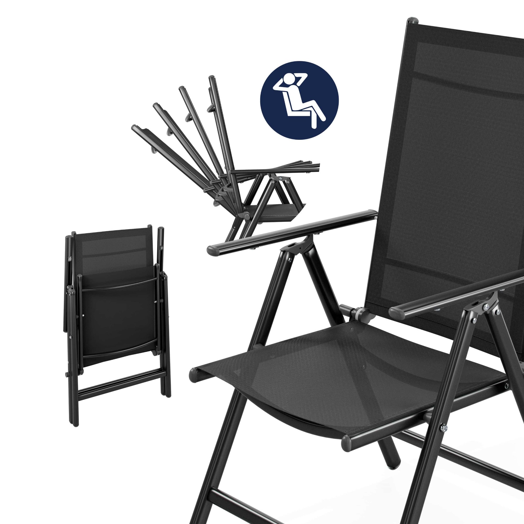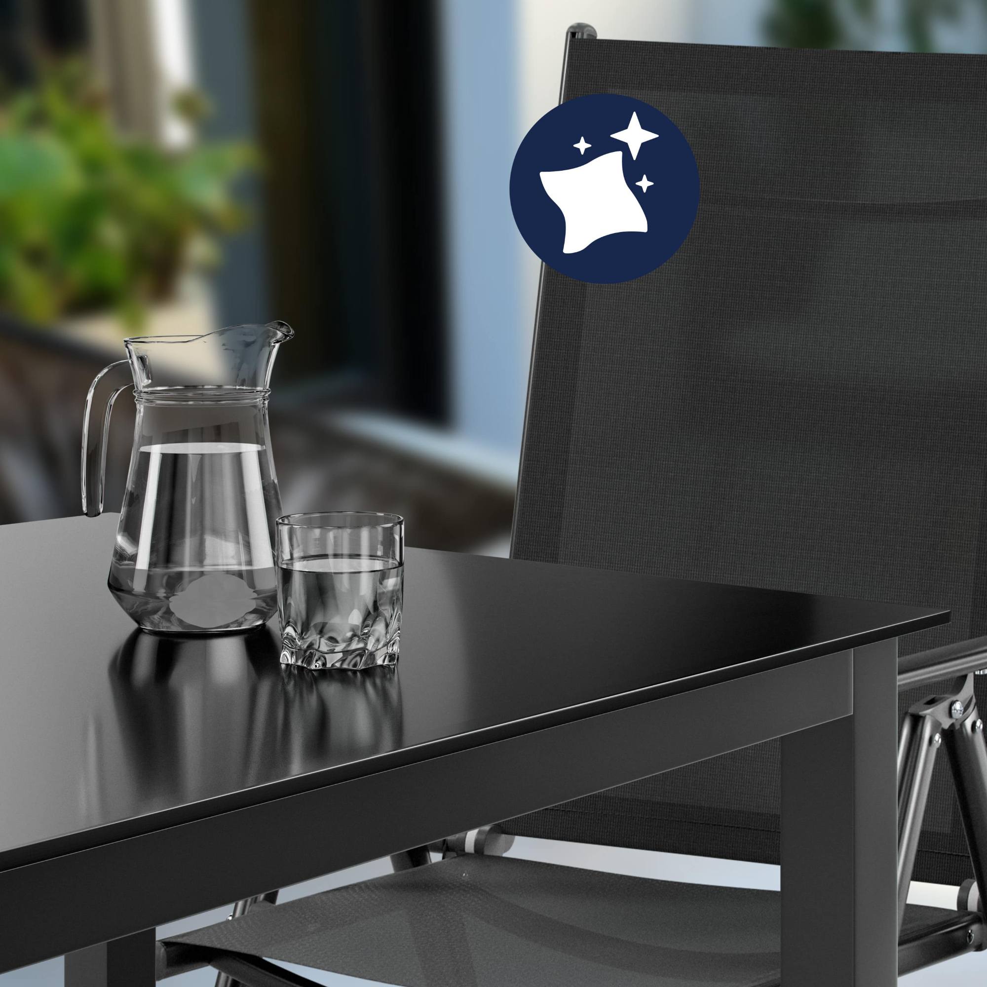 Tento nábytek má stabilní hliníkovou konstrukci, jejíž povrch je práškově lakovaný. Šrouby jsou z nerezové oceli. Opěradla židlí jsou nastavitelná, což společně s područkami přispívá k pohodlí při sezení. Potah židlí je pratelný, což oceníte zejména při větším znečištění. Židle jsou skládací, a tak při skladování nebudou zabírat zbytečně moc místa.