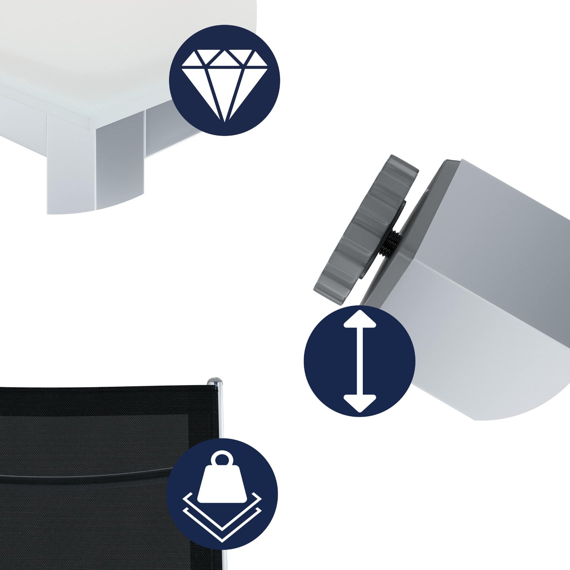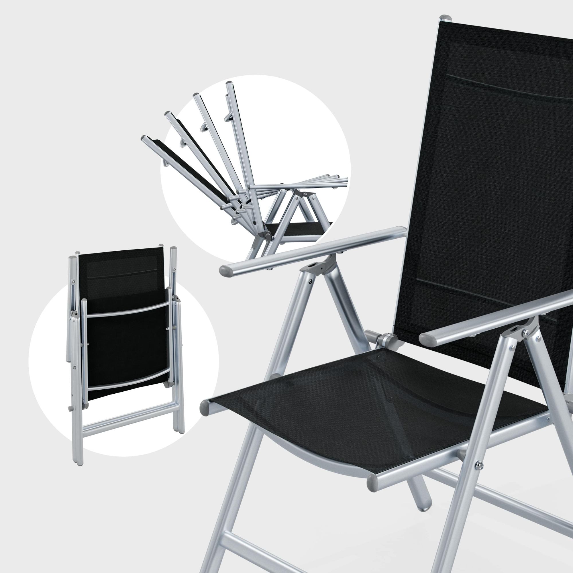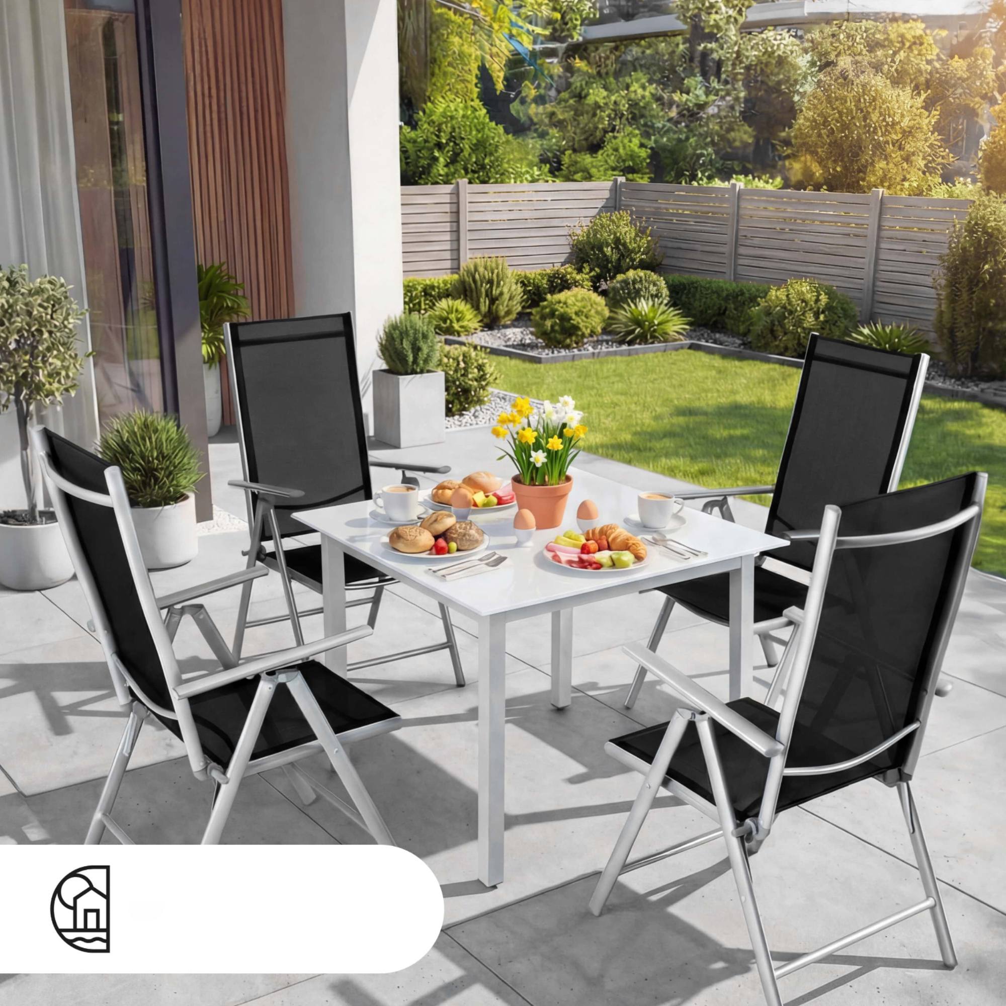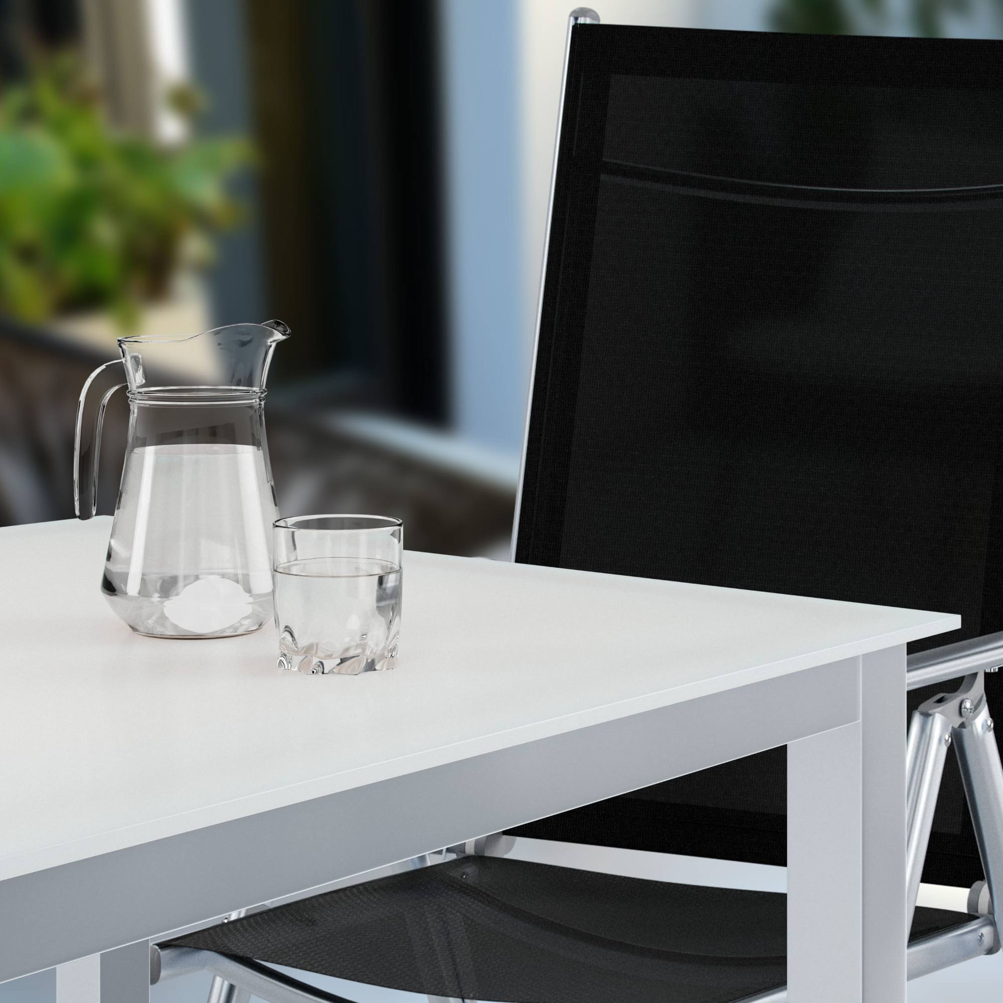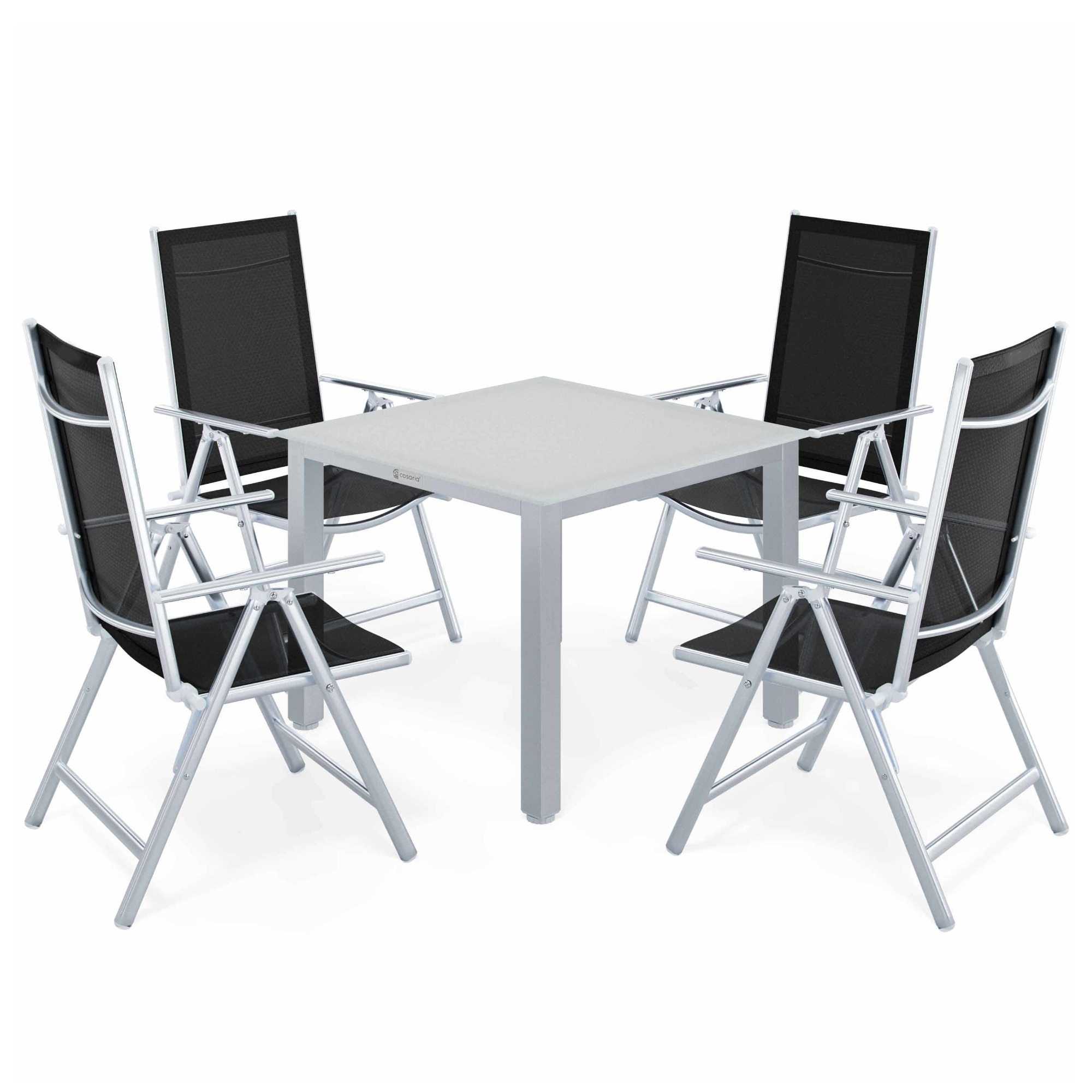 Stabilní konstrukce tohoto setu odolného vůči povětrnostním vlivům je vyrobena z hliníku, jehož povrch je práškově lakovaný. Nohy židlí i stolu jsou zakončeny nastavitelnými šrouby, **, díky kterým bude set stabilní i na nerovném povrchu Horní deska stolu je z 5 mm silného tvrzeného skla. Opěradla židlí, jejichž potah je z pratelné tkaniny, lze nastavit do 7 různých poloh. Židle jsou skládací, **, a tak při skladovaní nezaberou zbytečně moc místa.