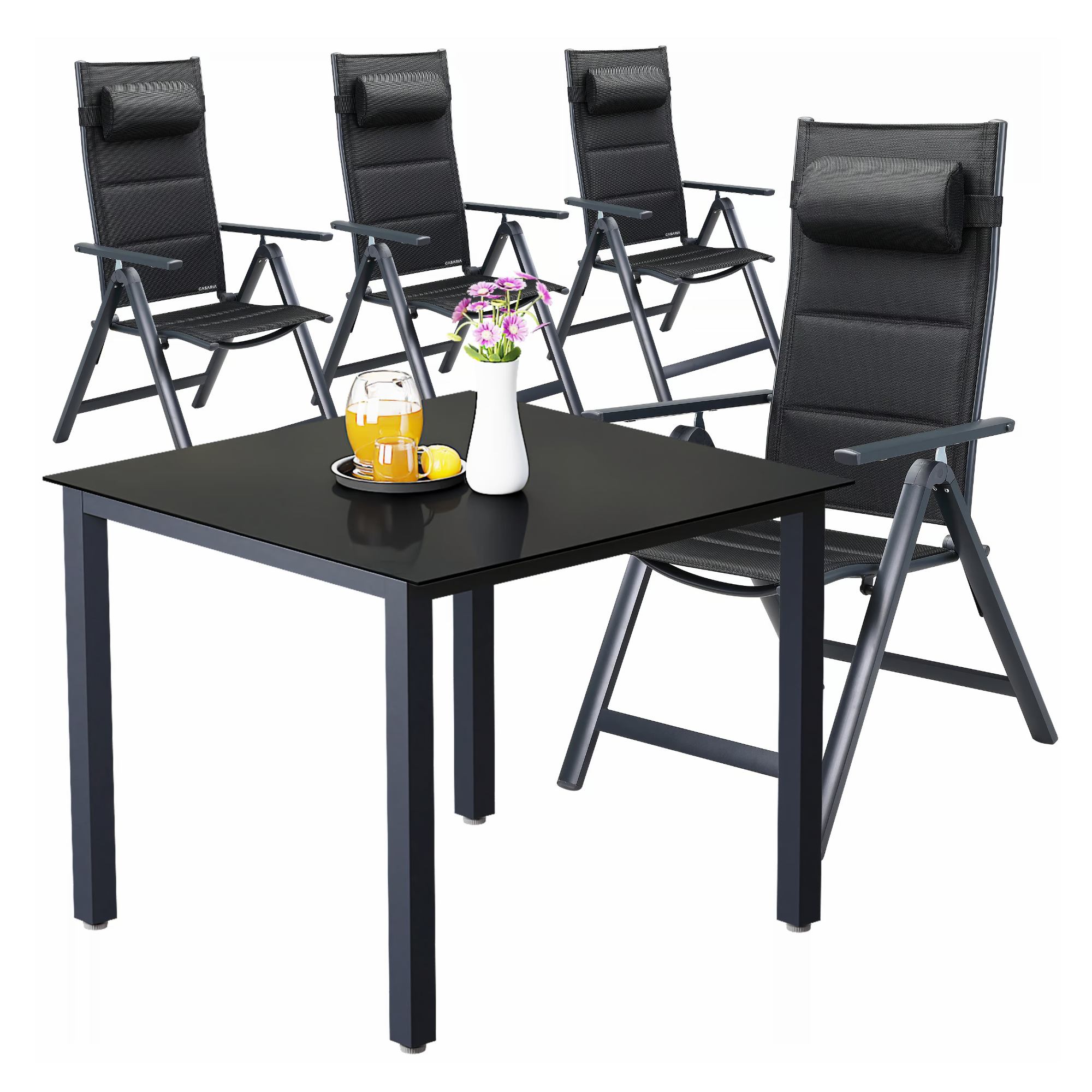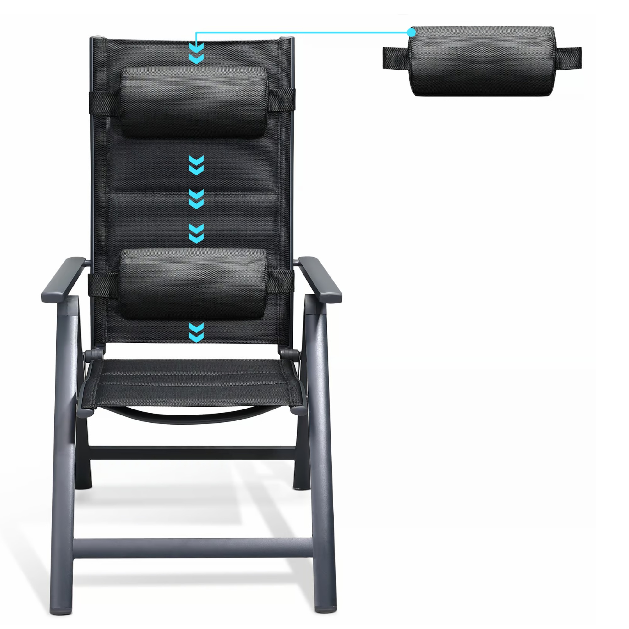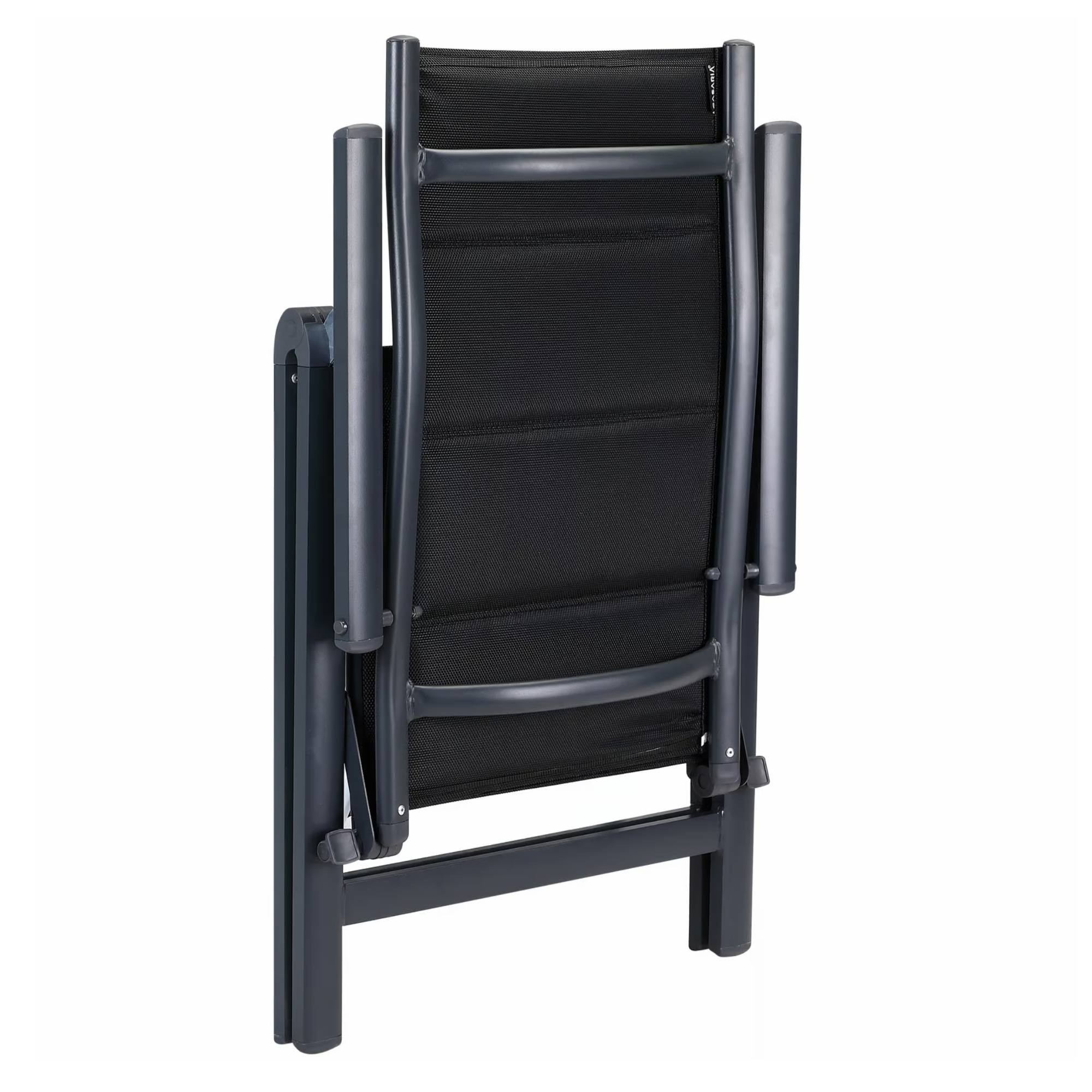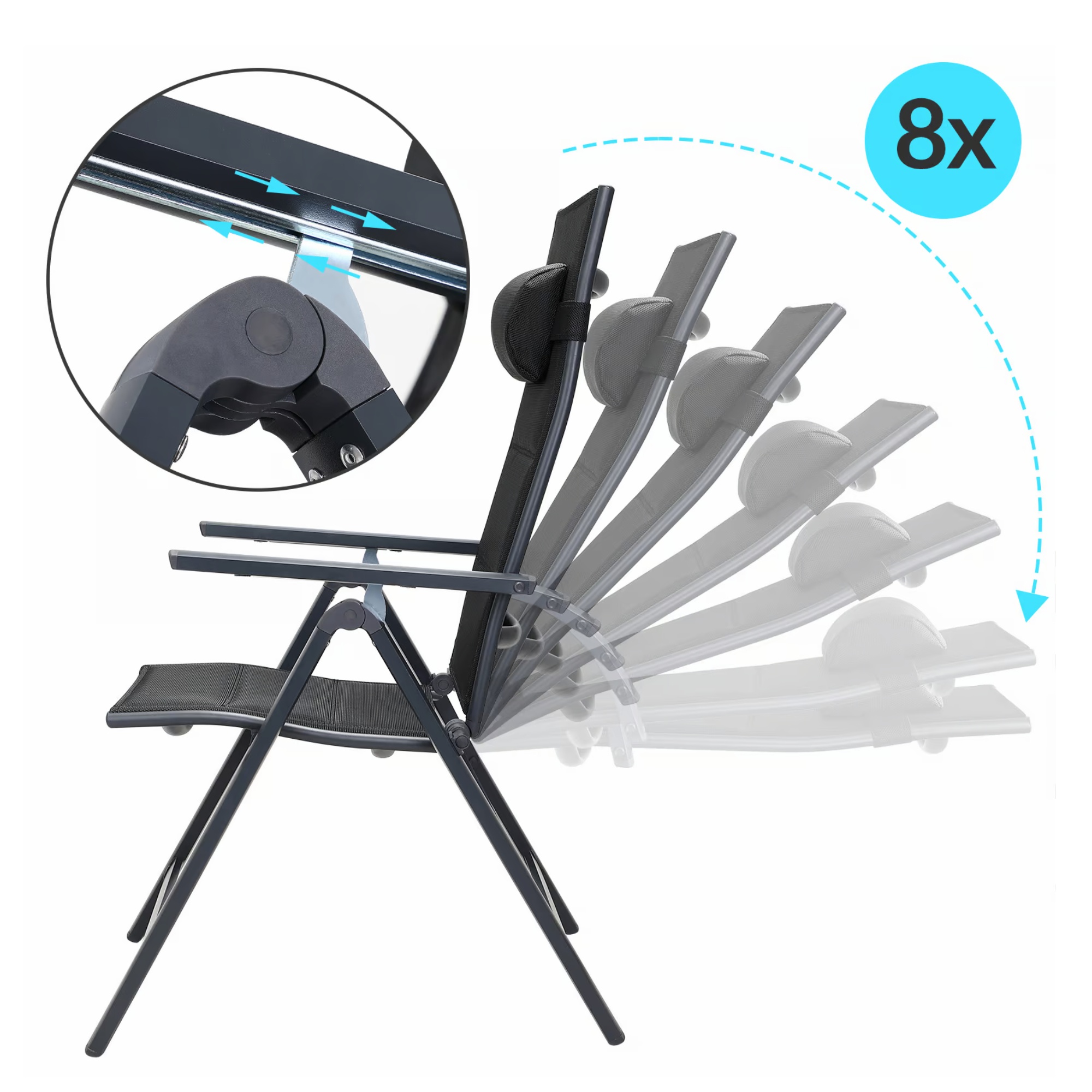 Tento nábytek má stabilní hliníkovou konstrukci, která je opatřena práškovým nástřikem. Šrouby jsou z nerezové oceli. Opěradla židlí lze nastavit do 8 různých poloh, což společně s područkami a silným polstrováním přispívá k pohodlí při sezení. Součástí židlí, jejichž potah je pratelný, je i odnímatelný polštář se zapínáním na suchý zip, který lze použít jako pohodlnou opěrku hlavy nebo jako podpůrný bederní polštář. Nohy židlí jsou vybaveny plastovými chrániči podlahy. Židle jsou skládací, což oceníte zejména při jejich skladování.
