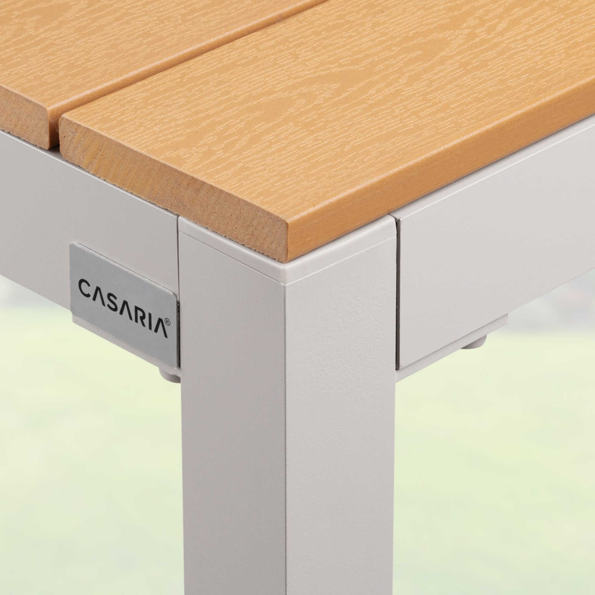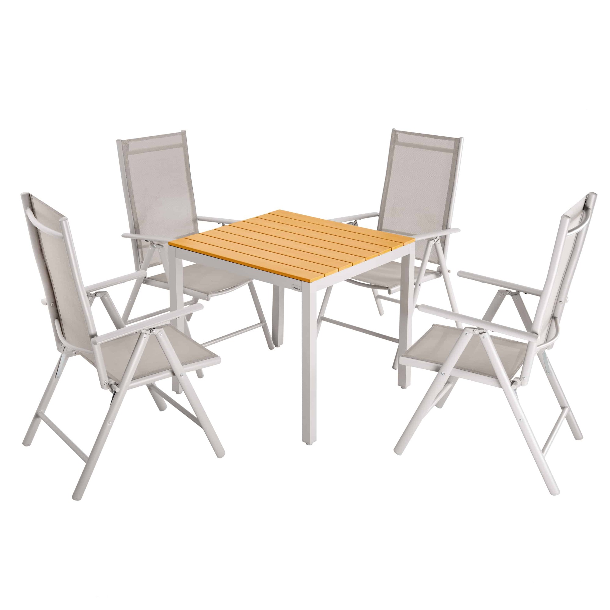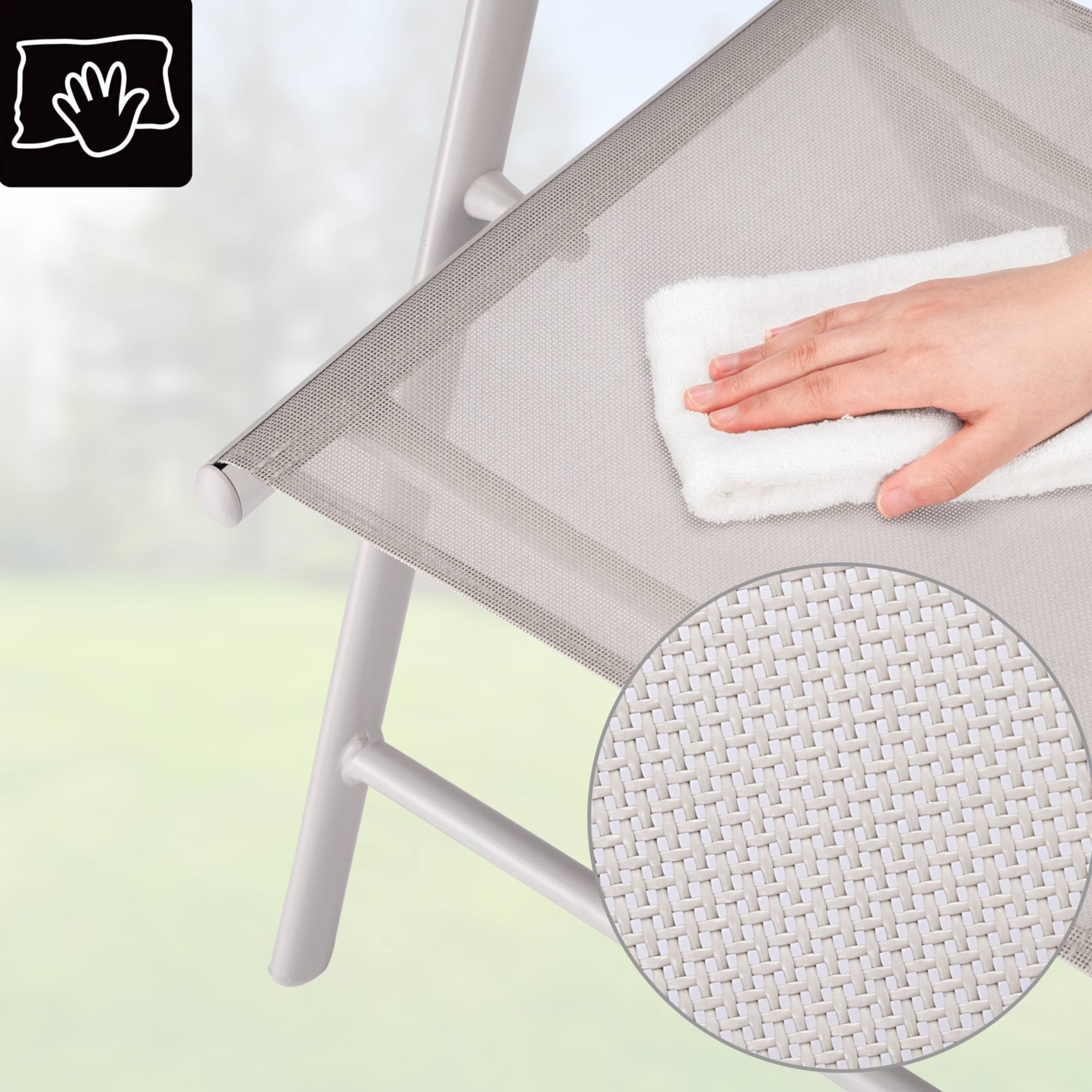Stabilní konstrukce tohoto setu odolného vůči povětrnostním vlivům je vyrobena z hliníku, jehož povrch je práškově lakovaný. Nohy židlí i stolu jsou zakončeny nastavitelnými šrouby, **, díky kterým bude set stabilní i na nerovném povrchu. Nechybí ani chrániče podlahy. Horní deska stolu je vyrobena z materiálu WPC, který je tvořený kombinací dřevité hmoty a plastu. Opěradla židlí, jejichž potah je z pratelné tkaniny, lze nastavit do 7 různých poloh. Židle jsou skládací, **, a tak při skladovaní nezaberou zbytečně moc místa.